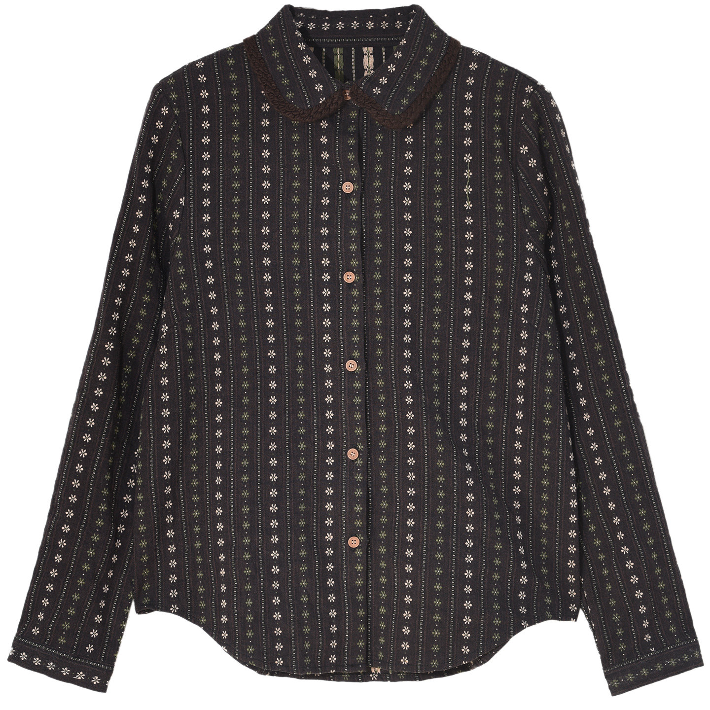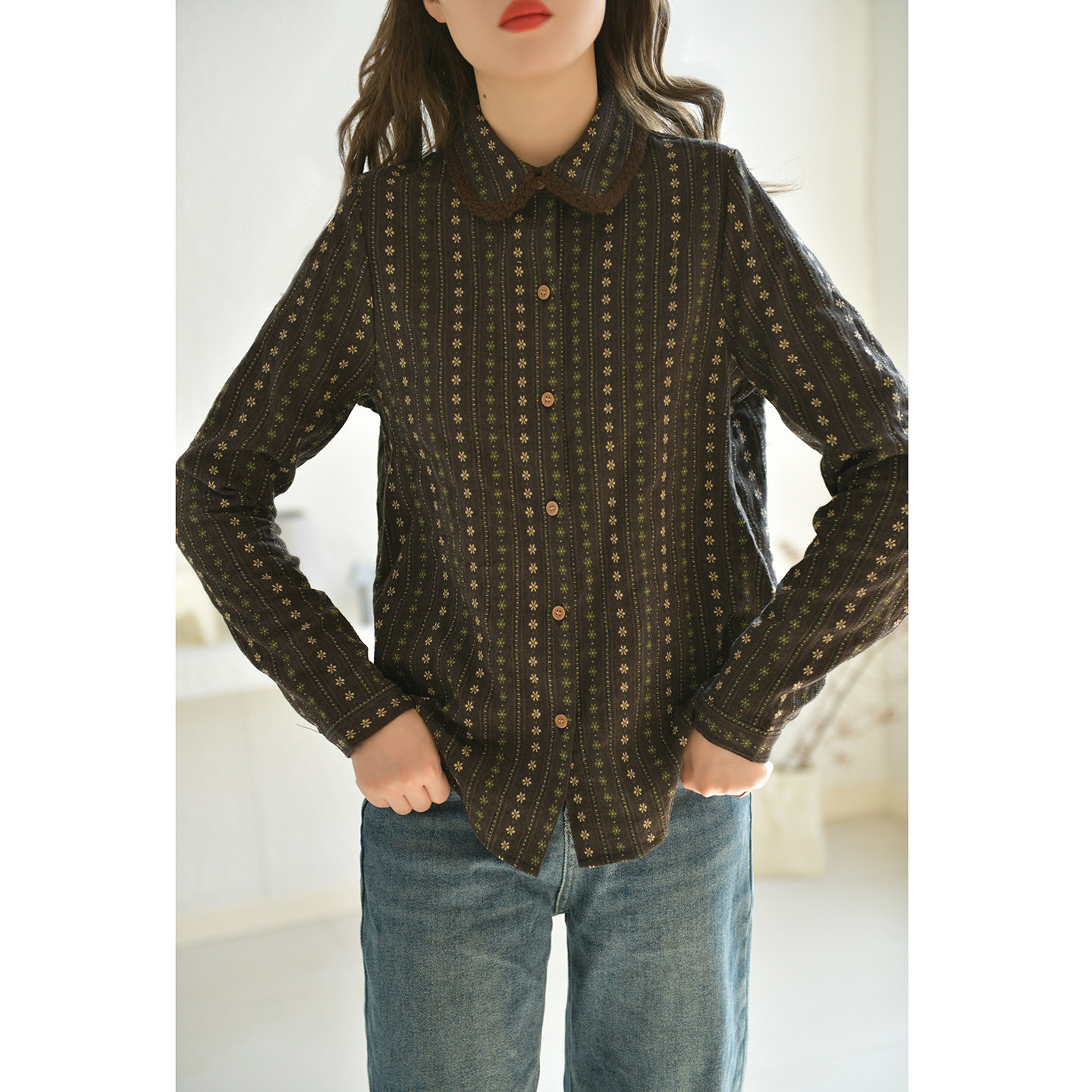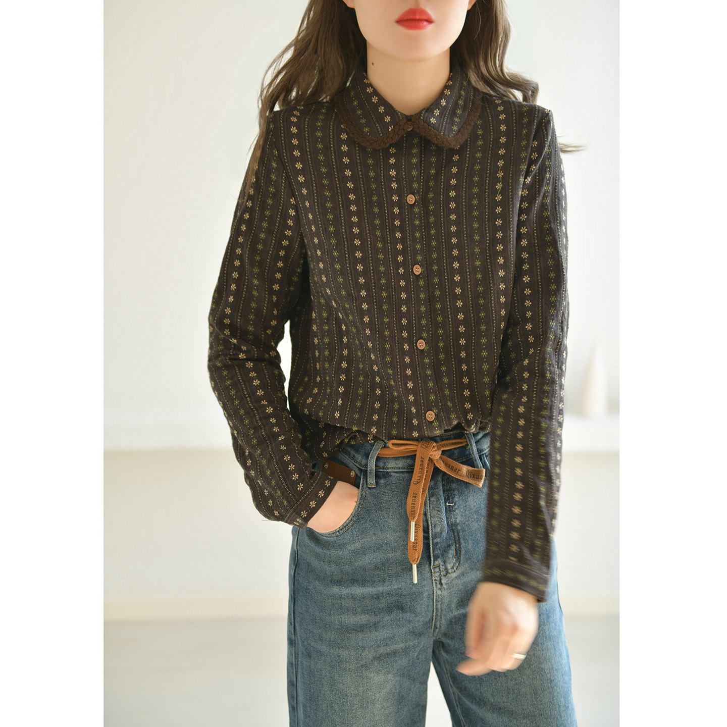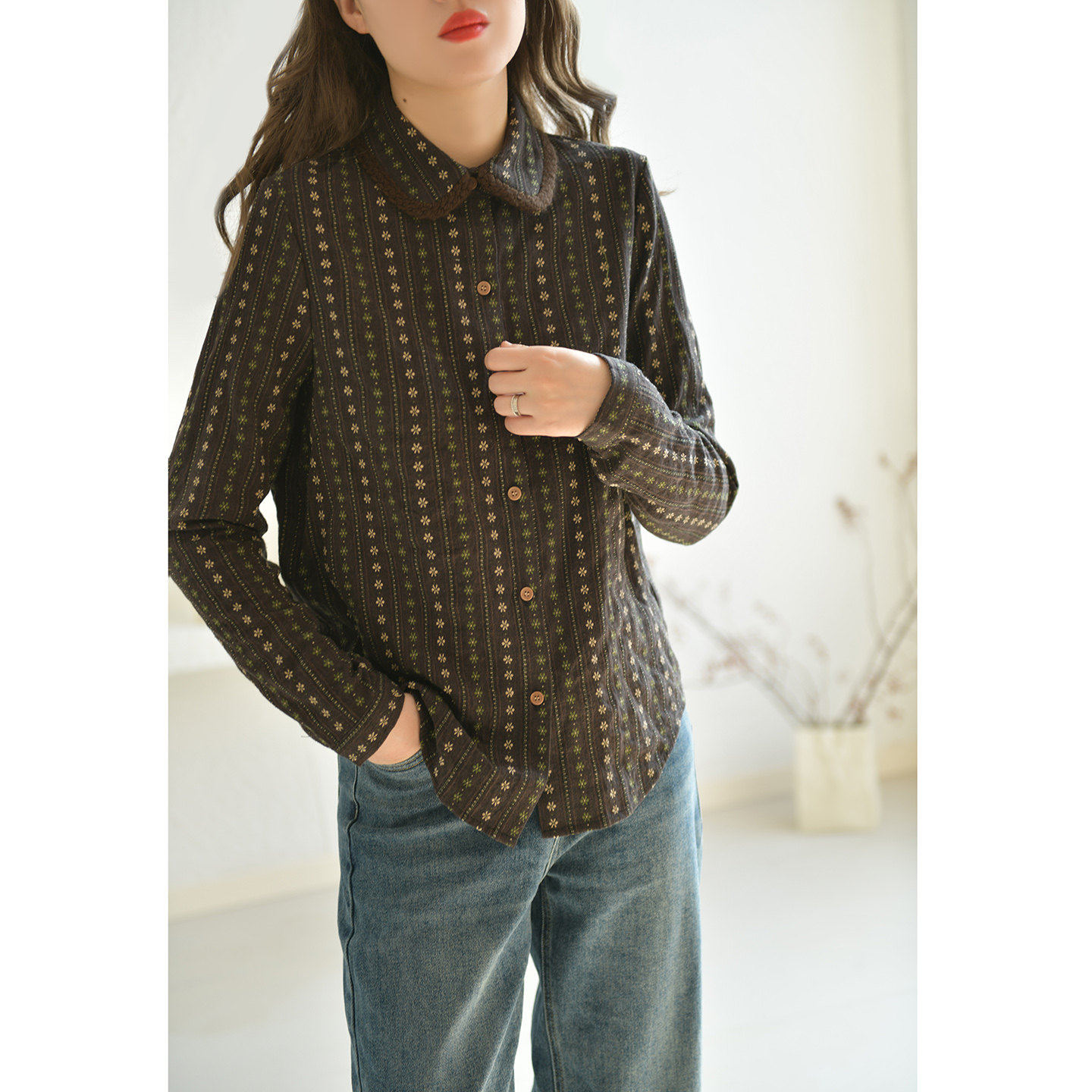 春秋内搭上衣显瘦2026新款 GESGOO复古咖色绣花纯棉衬衫 女翻领长袖