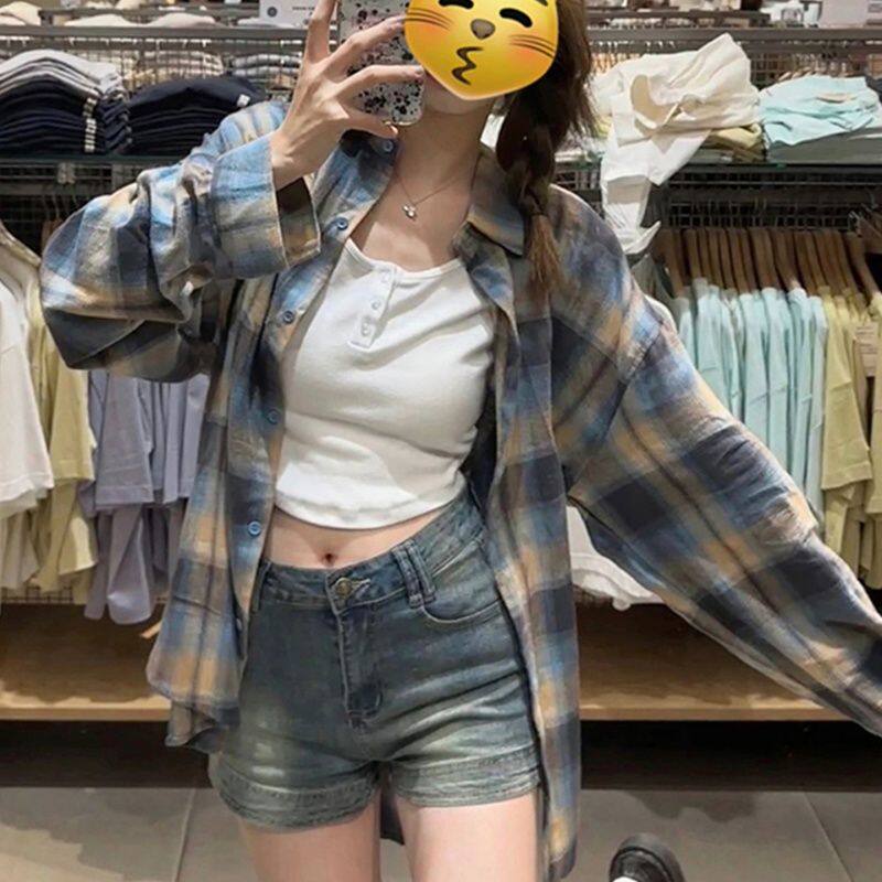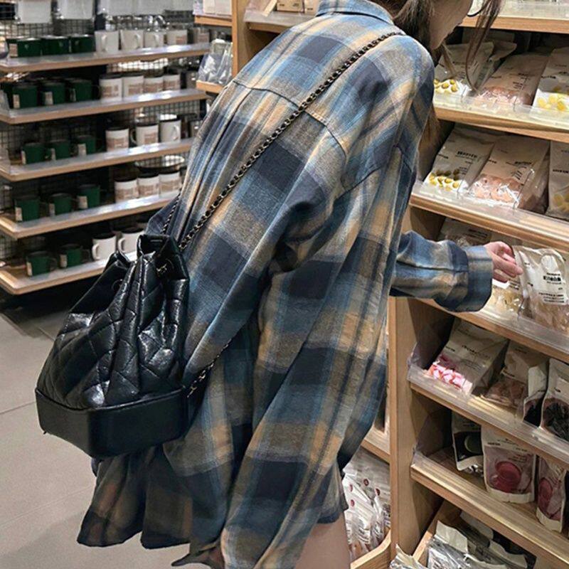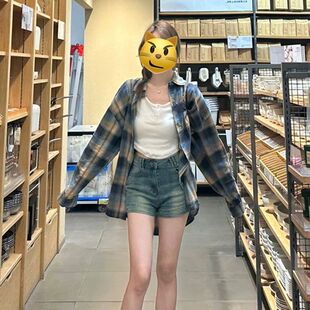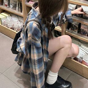 复古蓝棕格子磨毛衬衫 衬衣设计感外套上衣 女2026秋冬慵懒棉质长袖