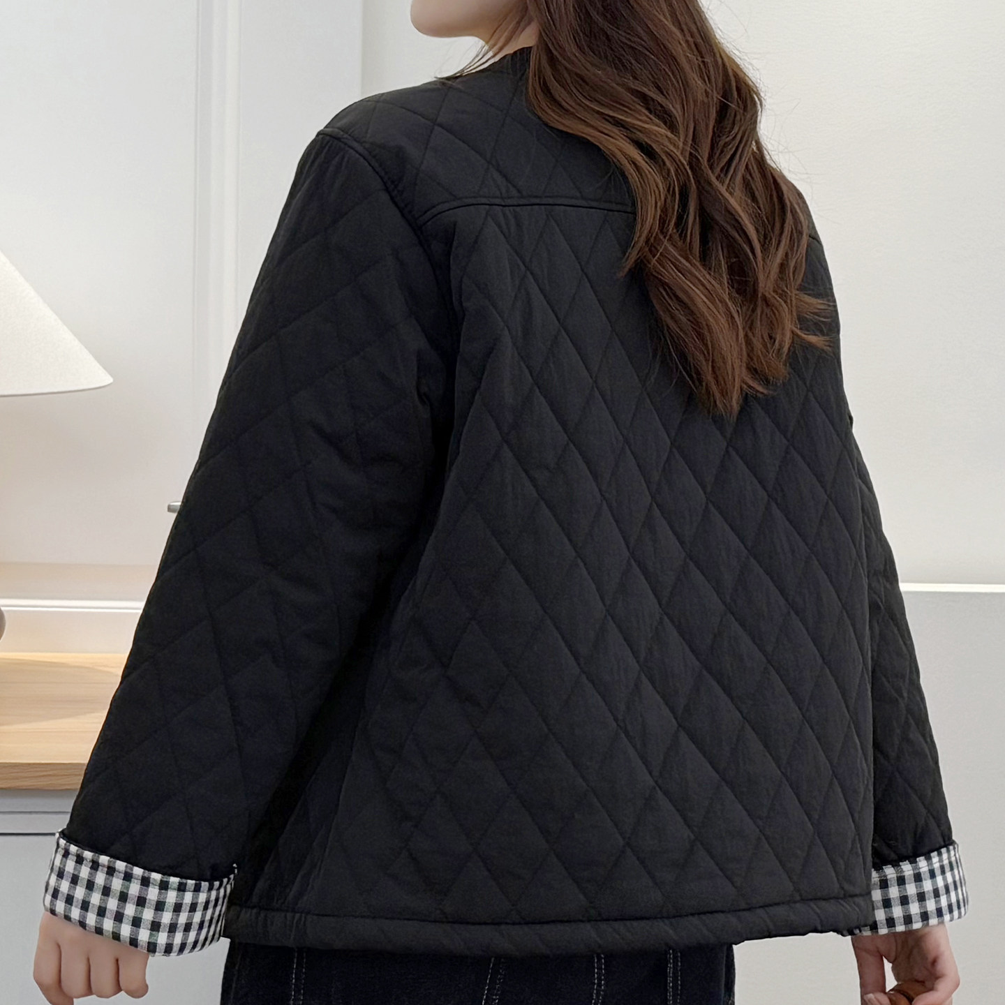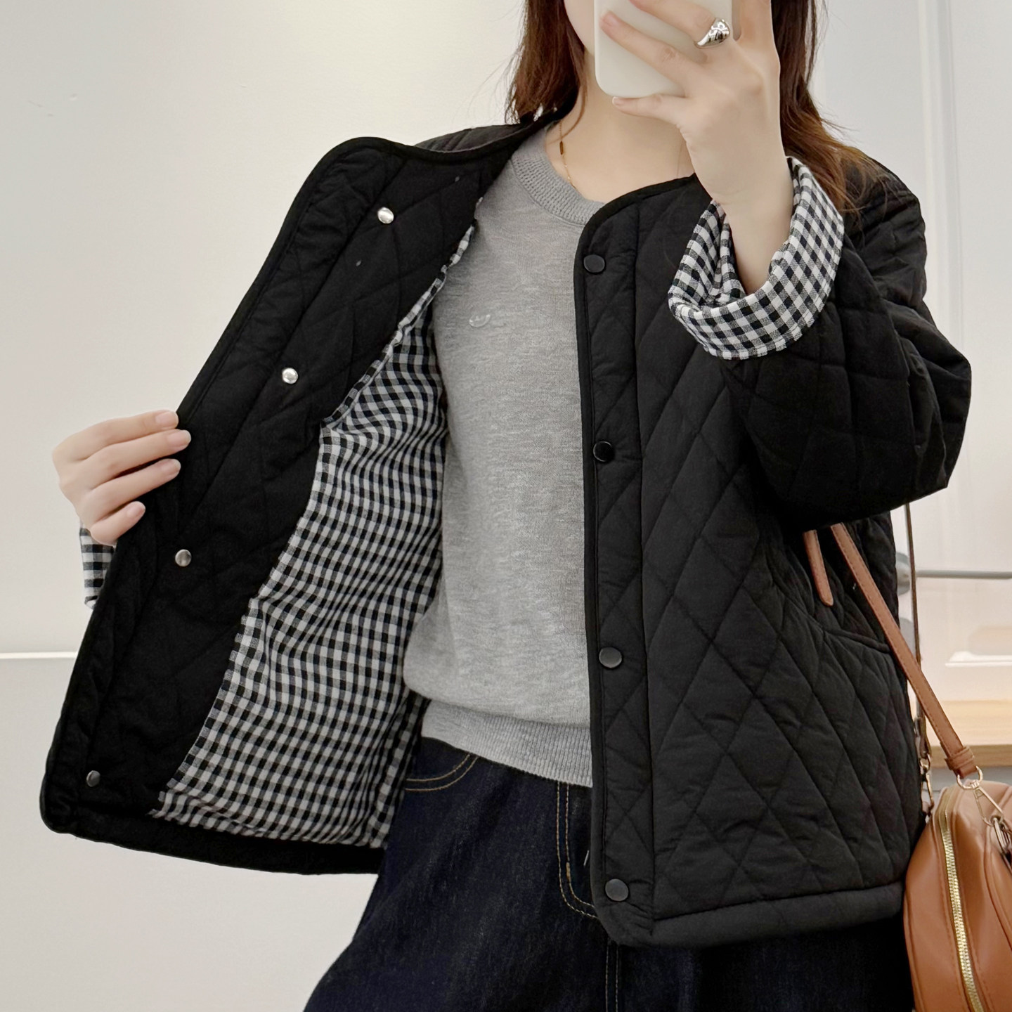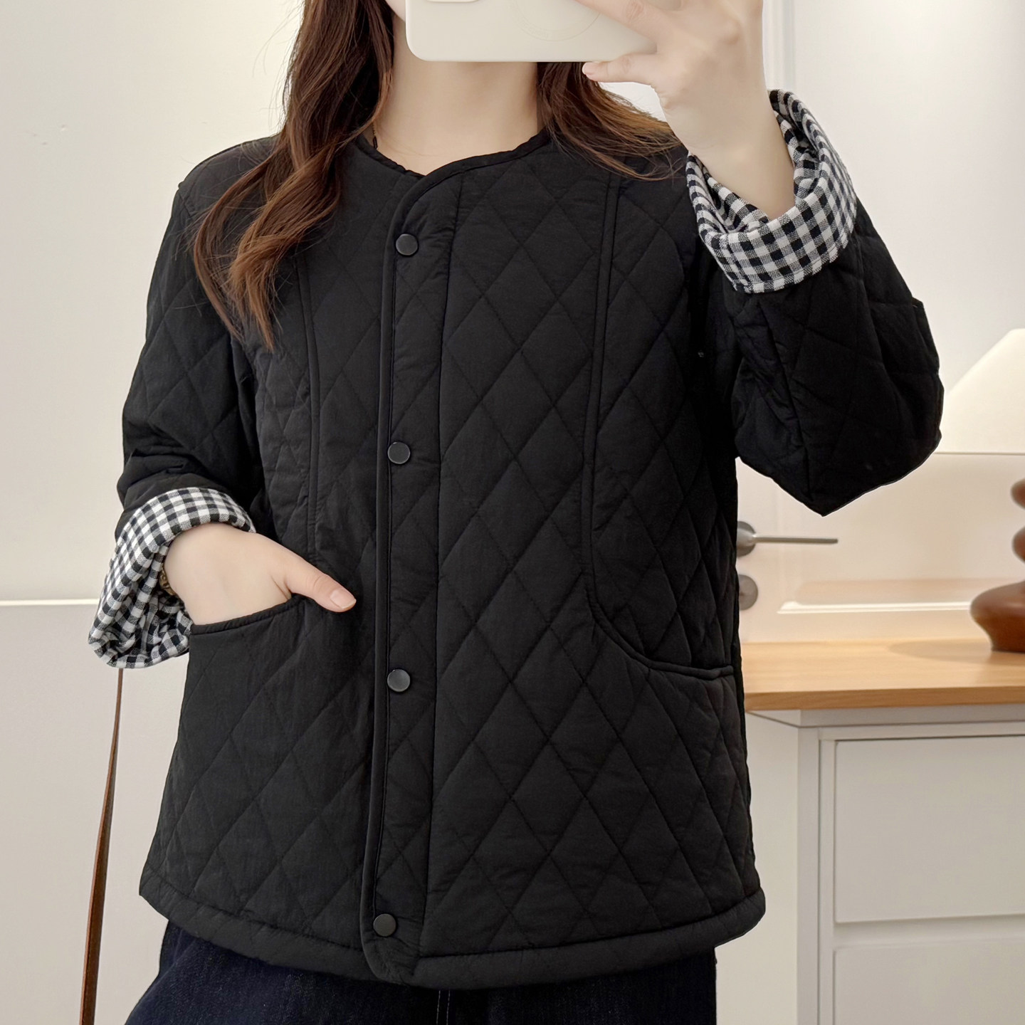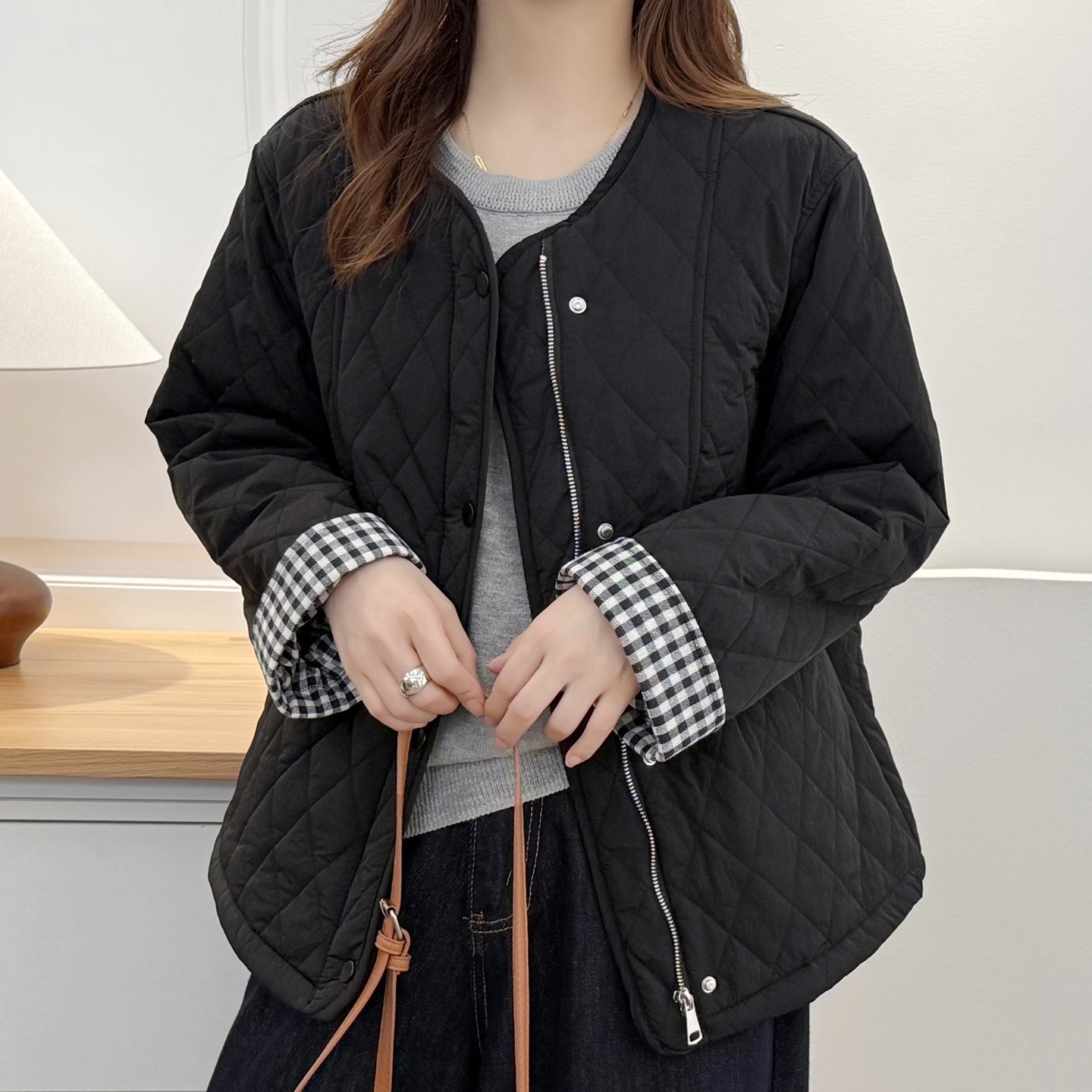 复古菱形格夹棉外套200斤 女装 胖mm冬季 巴恩翻领棉服木子理想大码