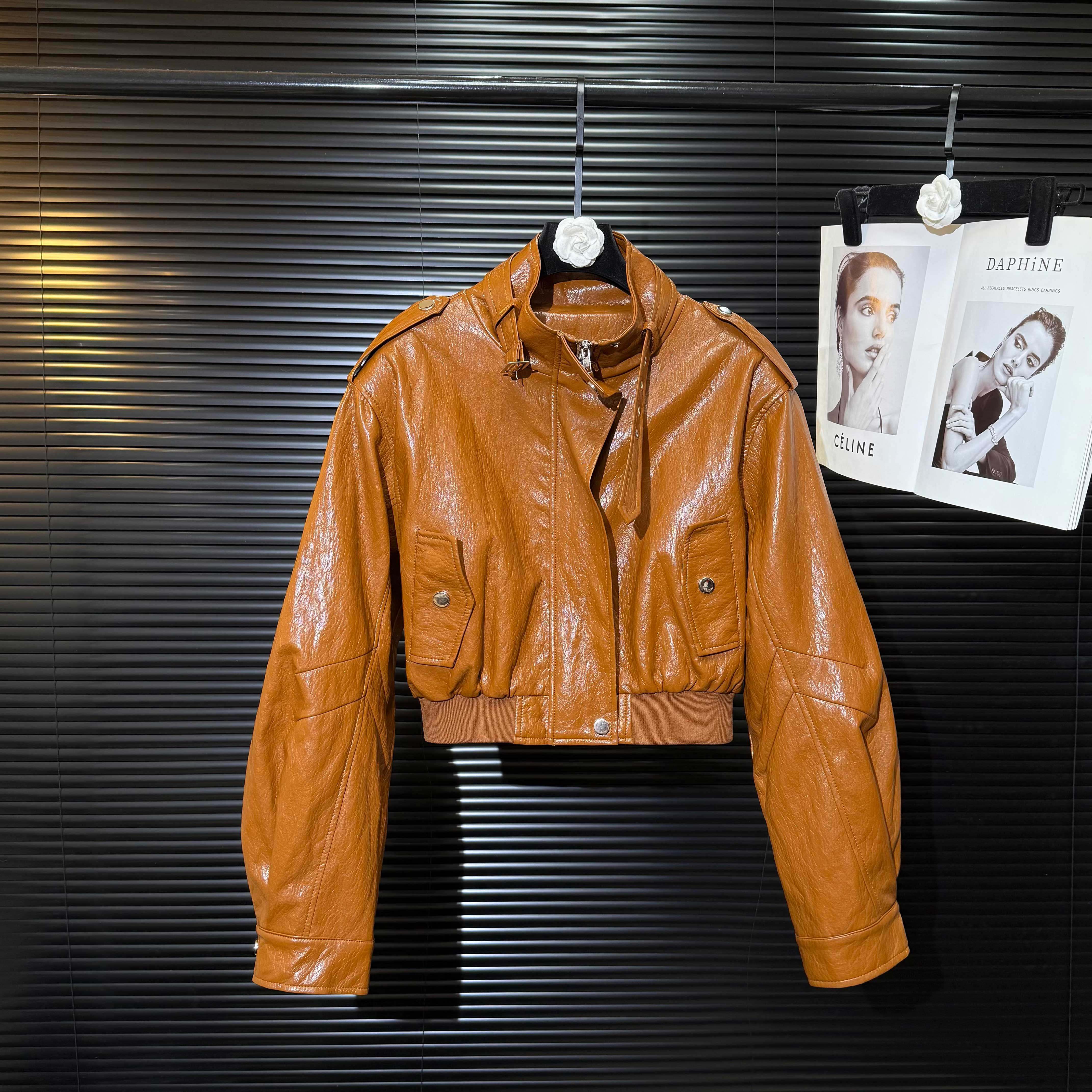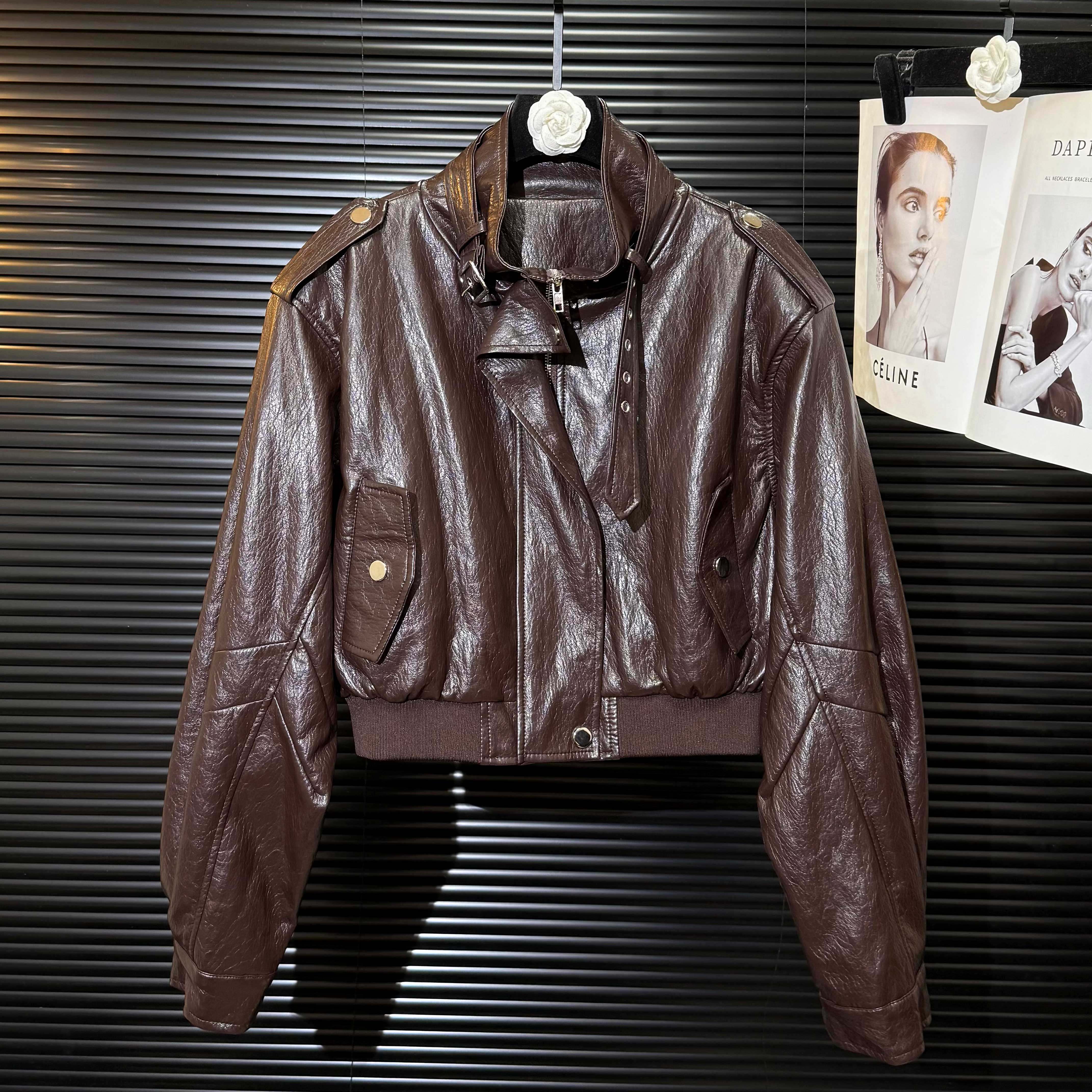 欧货酷飒辣妹立领系带机车风PU皮衣短外套女春秋时髦百搭夹克上衣