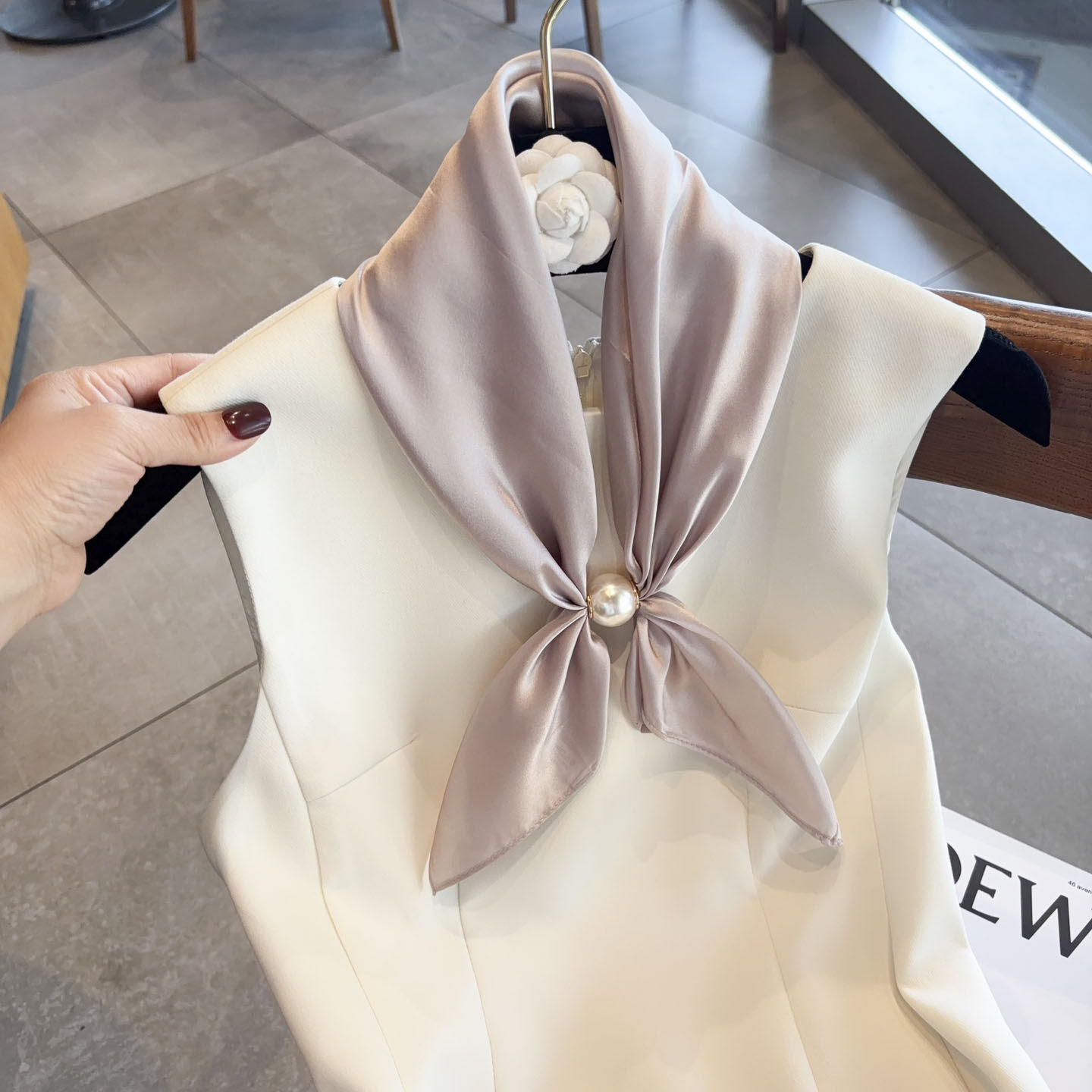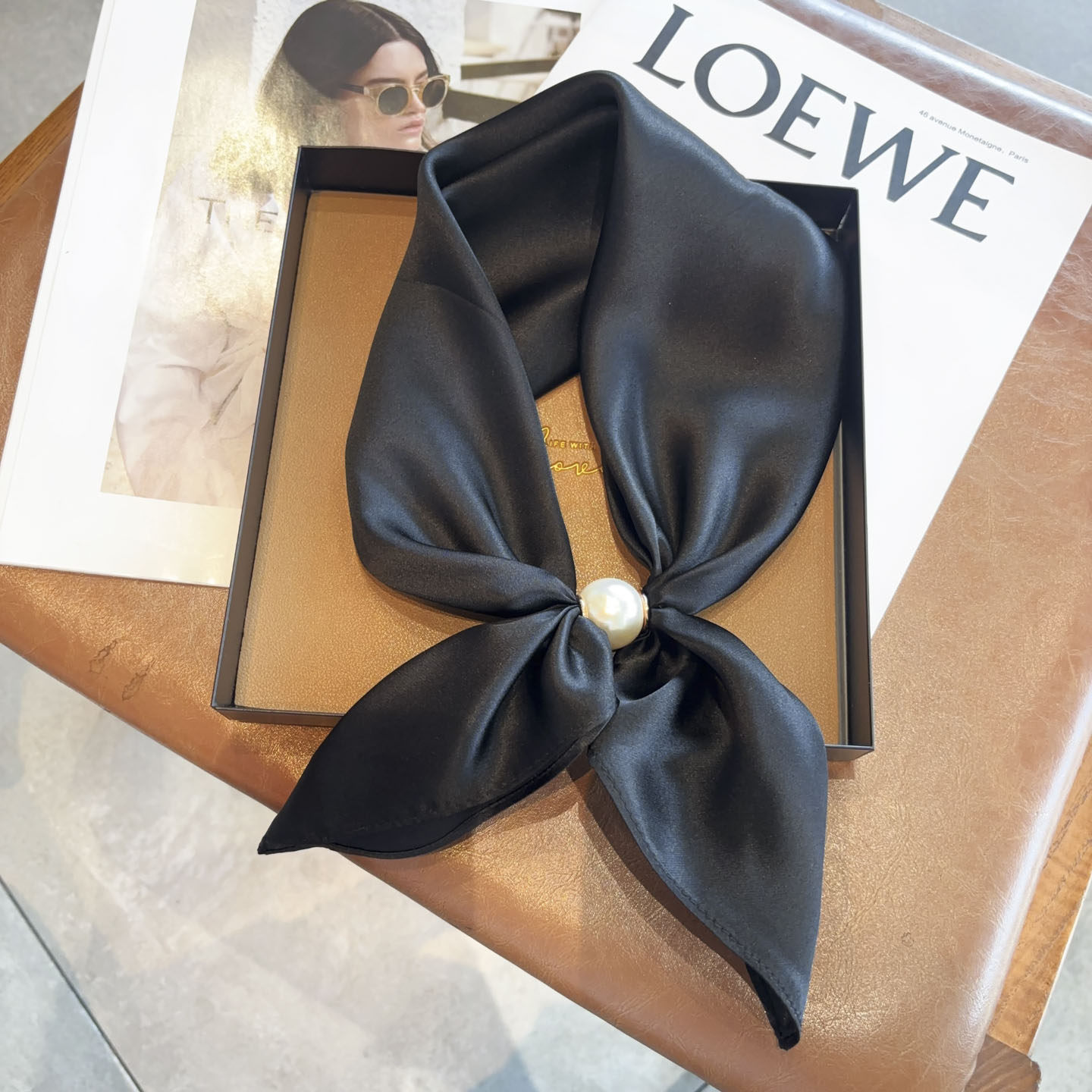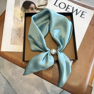 百搭纯色真丝珍珠磁吸扣小丝巾女100%桑蚕丝懒人系脖春秋装 饰领巾