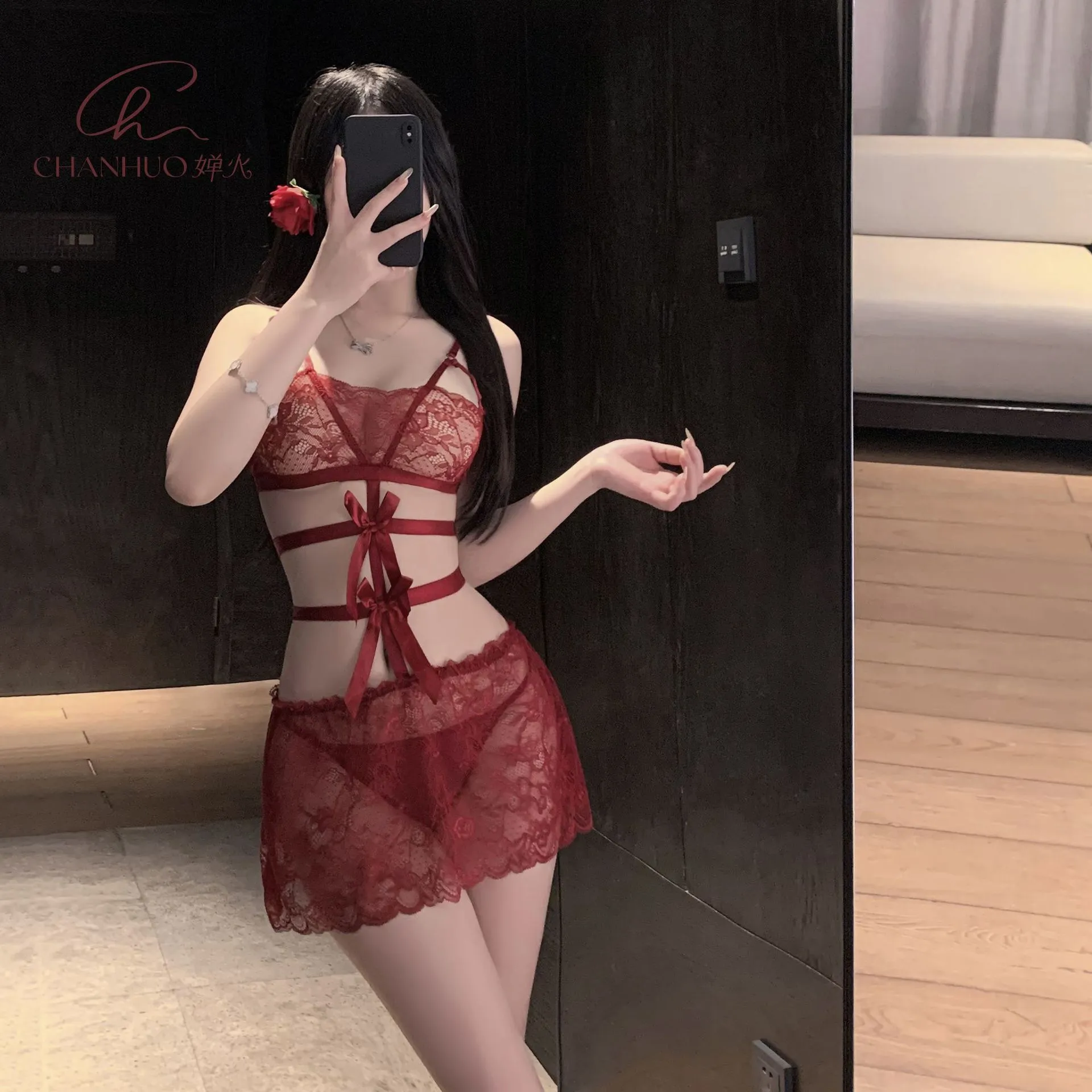 6144潮尚夜总会技师女装 免脱连衣裙 挂脖系带吊带裙性感蕾丝套装