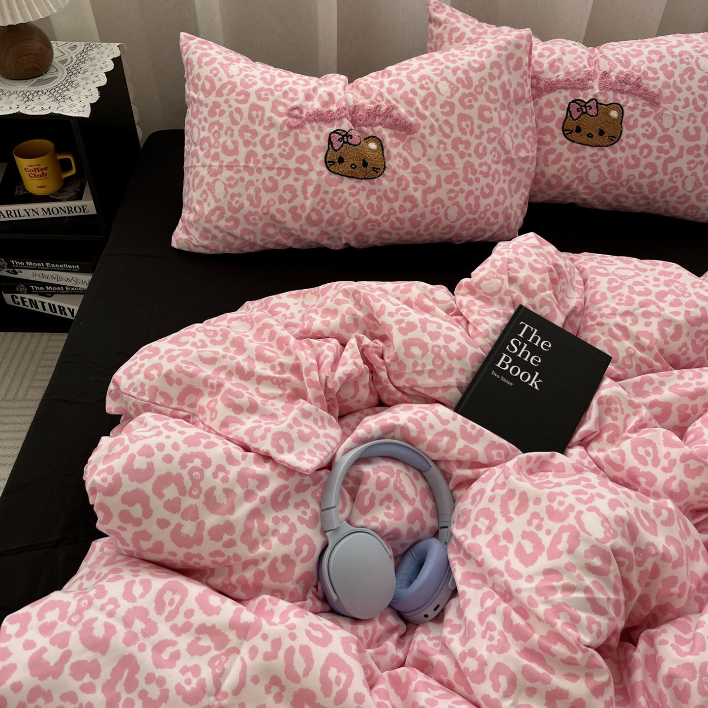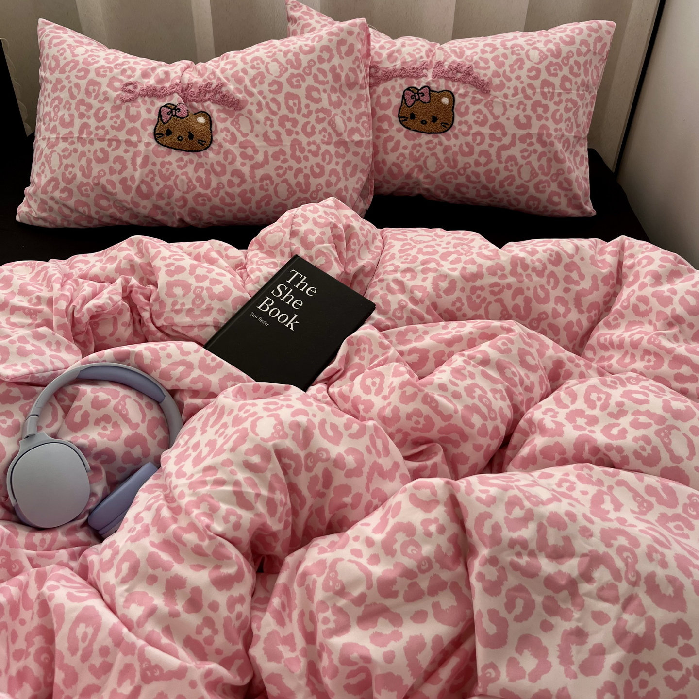 少女甜酷粉豹纹猫咪毛巾绣水洗棉床单四件套全棉被套纯棉三件套