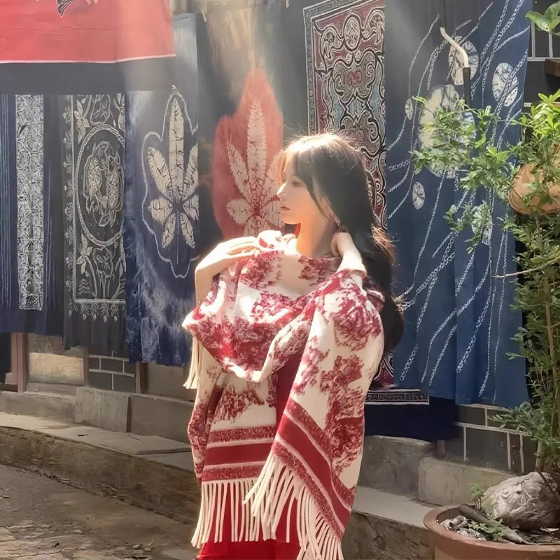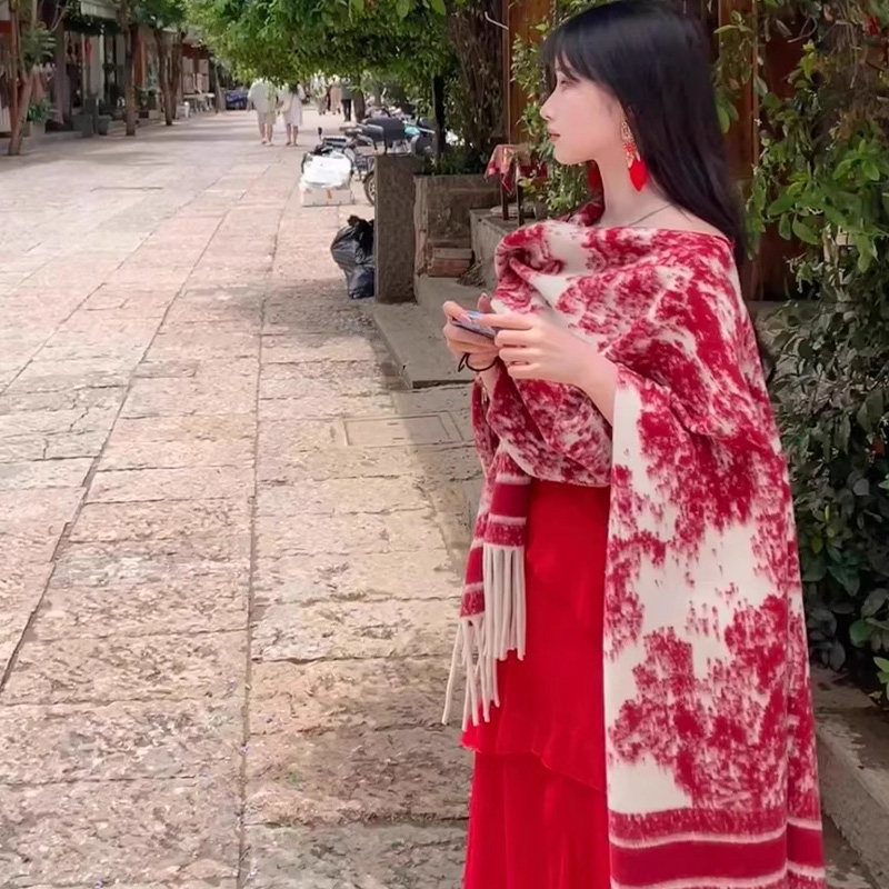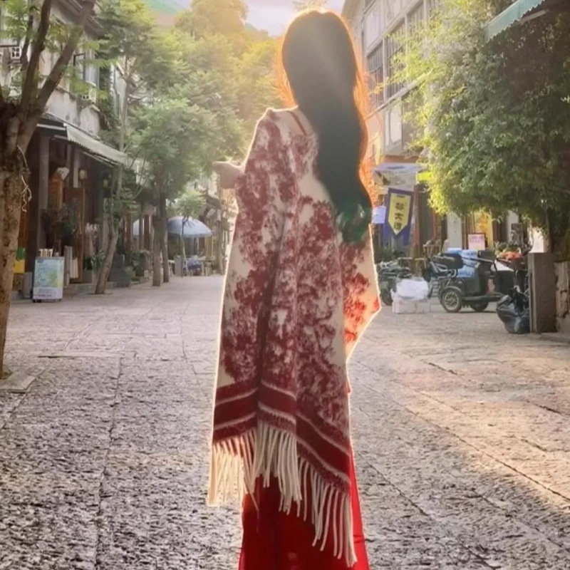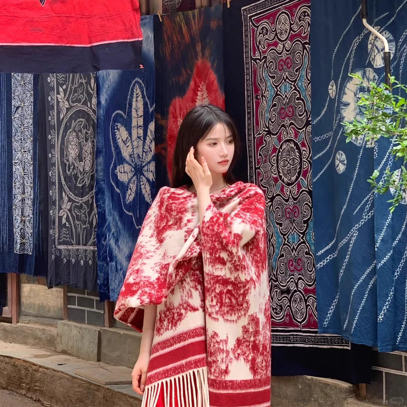 红色民族风羊绒披肩女外搭高级感百搭川西云南旅游穿搭斗篷披风潮