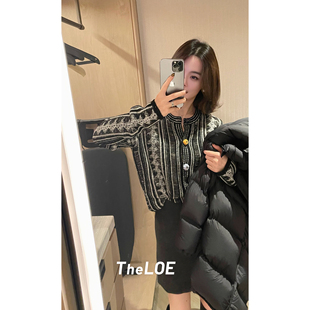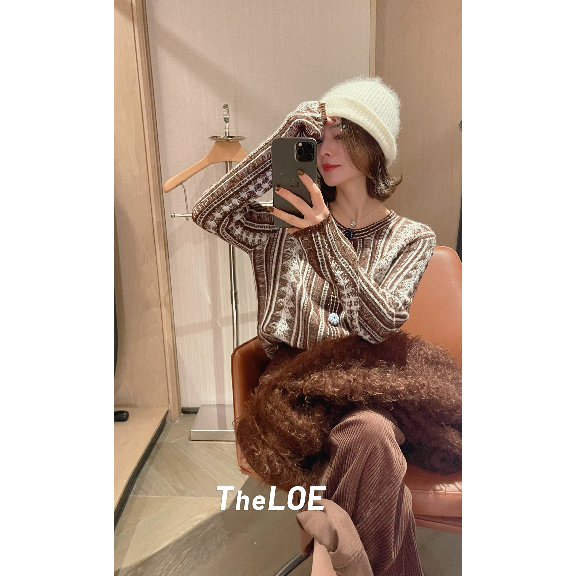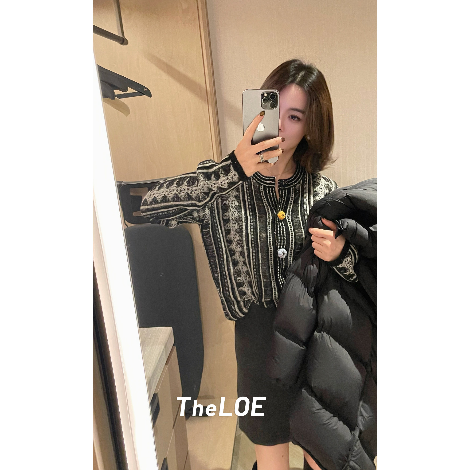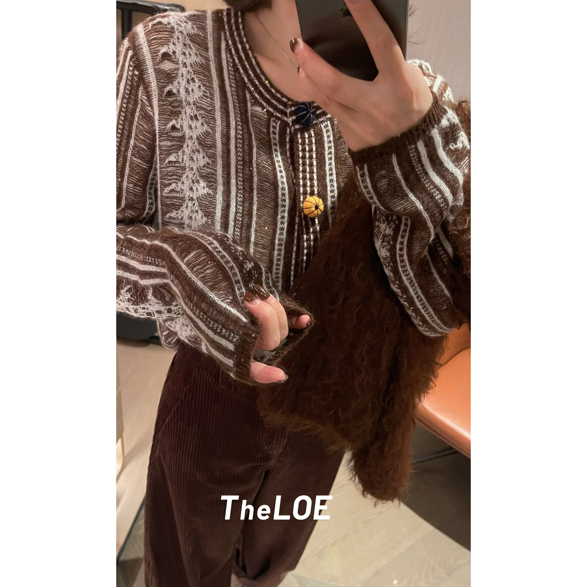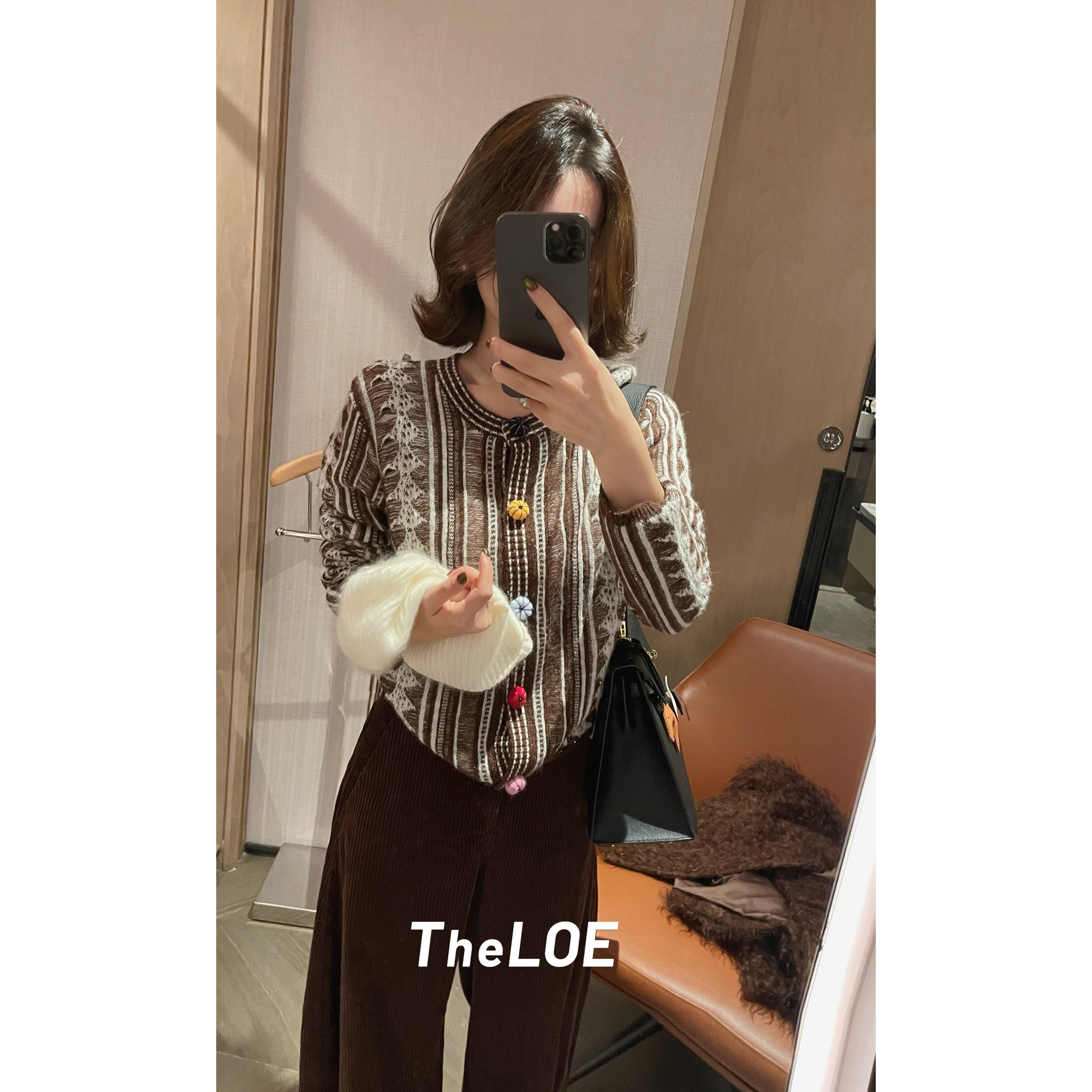 骆衣衣TheLOE 羊驼羊毛天丝圆领竖纹拼色小南瓜扣子针织开衫