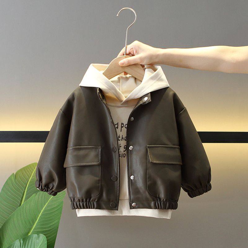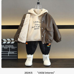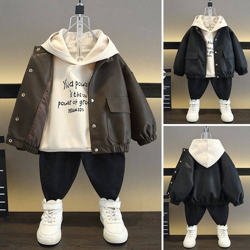 男童秋冬季 酷帅衣服男孩韩版 装 春秋季 卫衣两件套 皮衣2025新款 套装