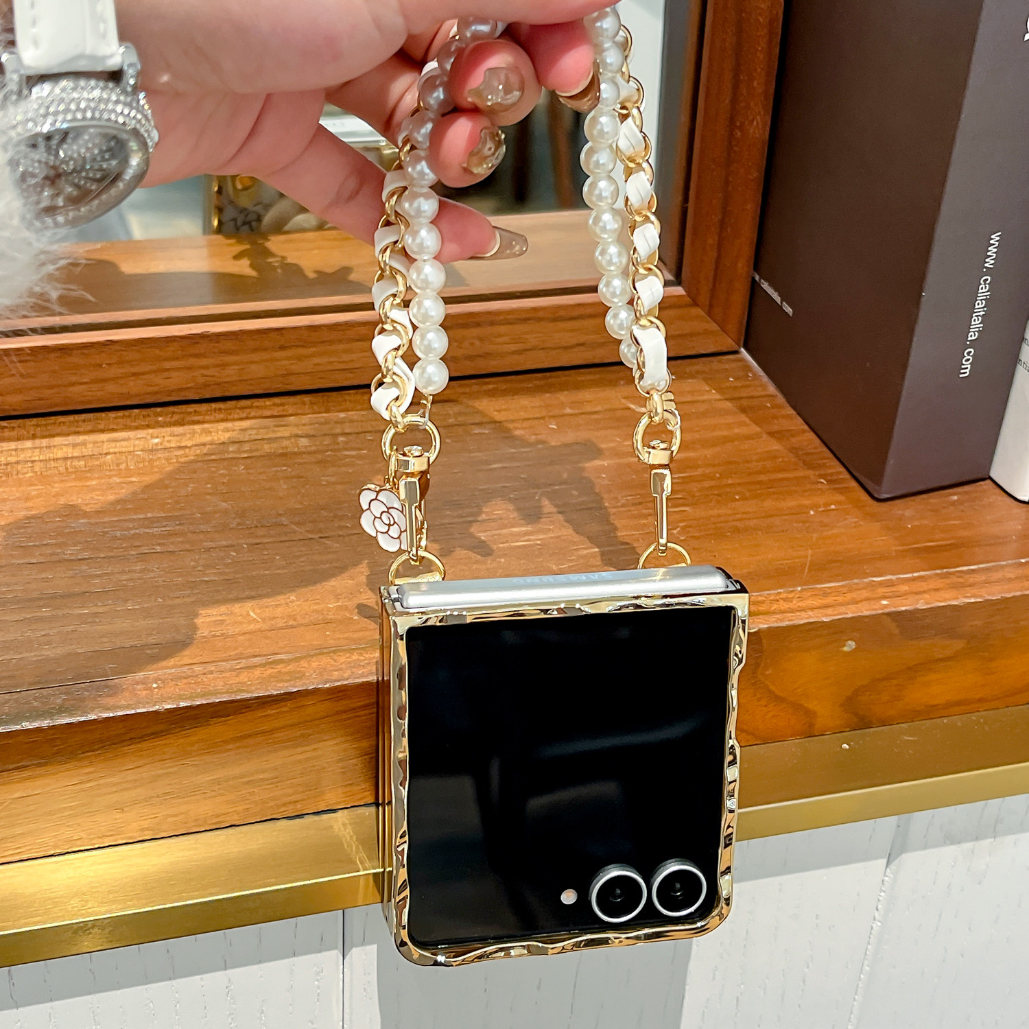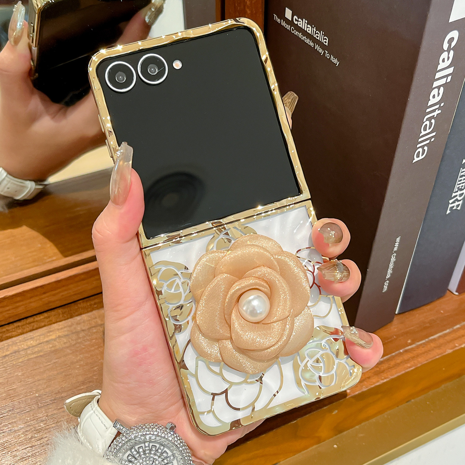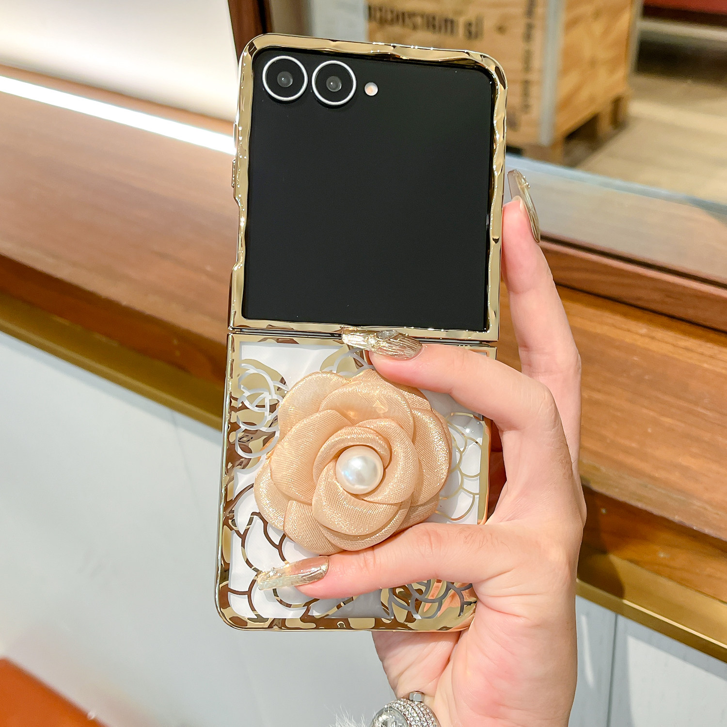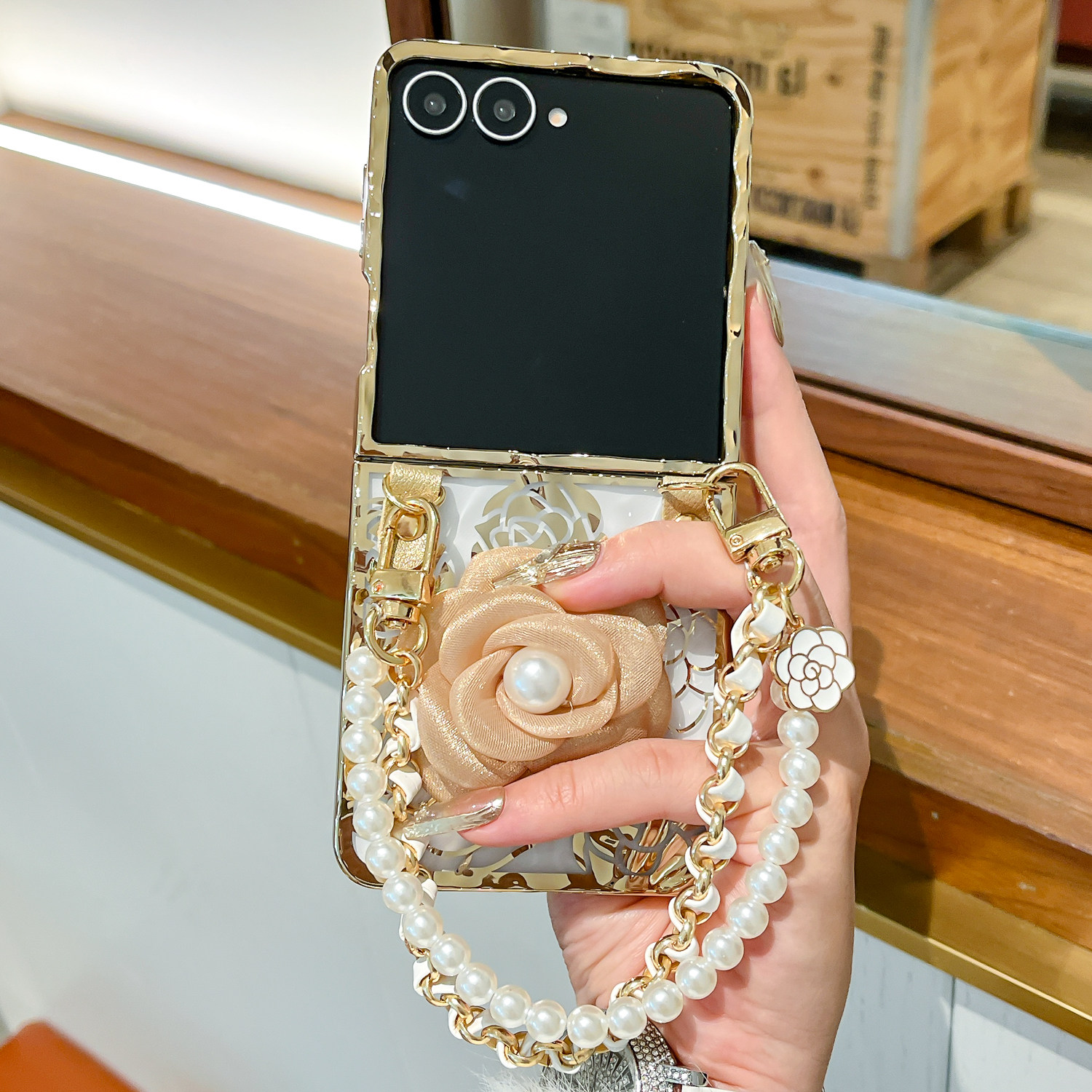 5折叠屏防摔硬壳Flip4 电镀褶皱Flip7珍珠玫瑰花Flip 3手链保护套 ZFlip7折叠屏新款 复古奢华风适用三星Galax