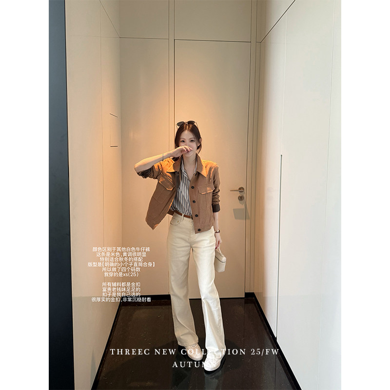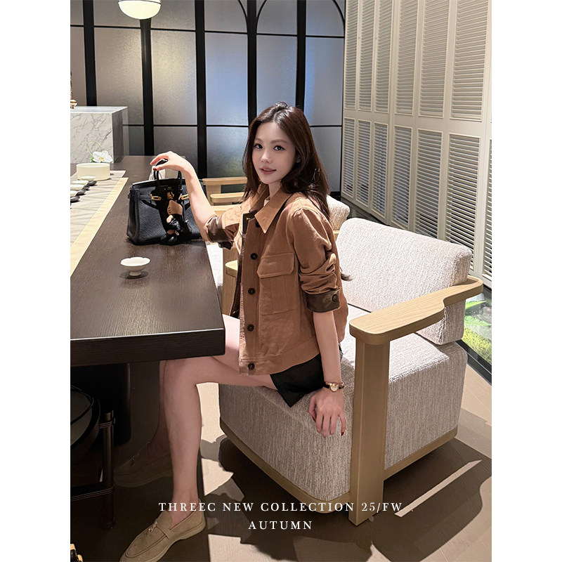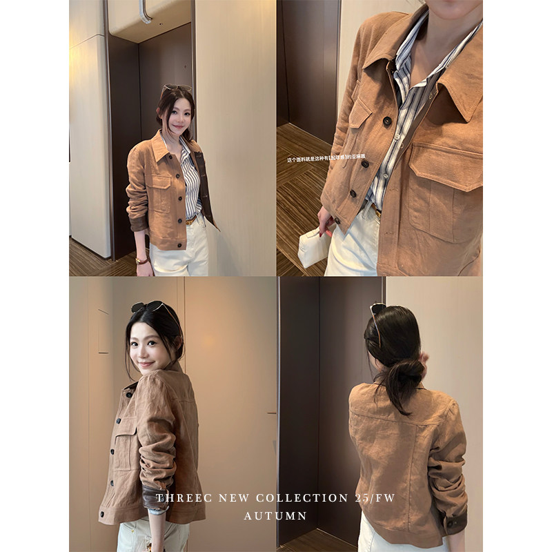 三喜threec 100%亚麻拼皮亚麻复古老钱夹克外套女秋 巴塞知秋