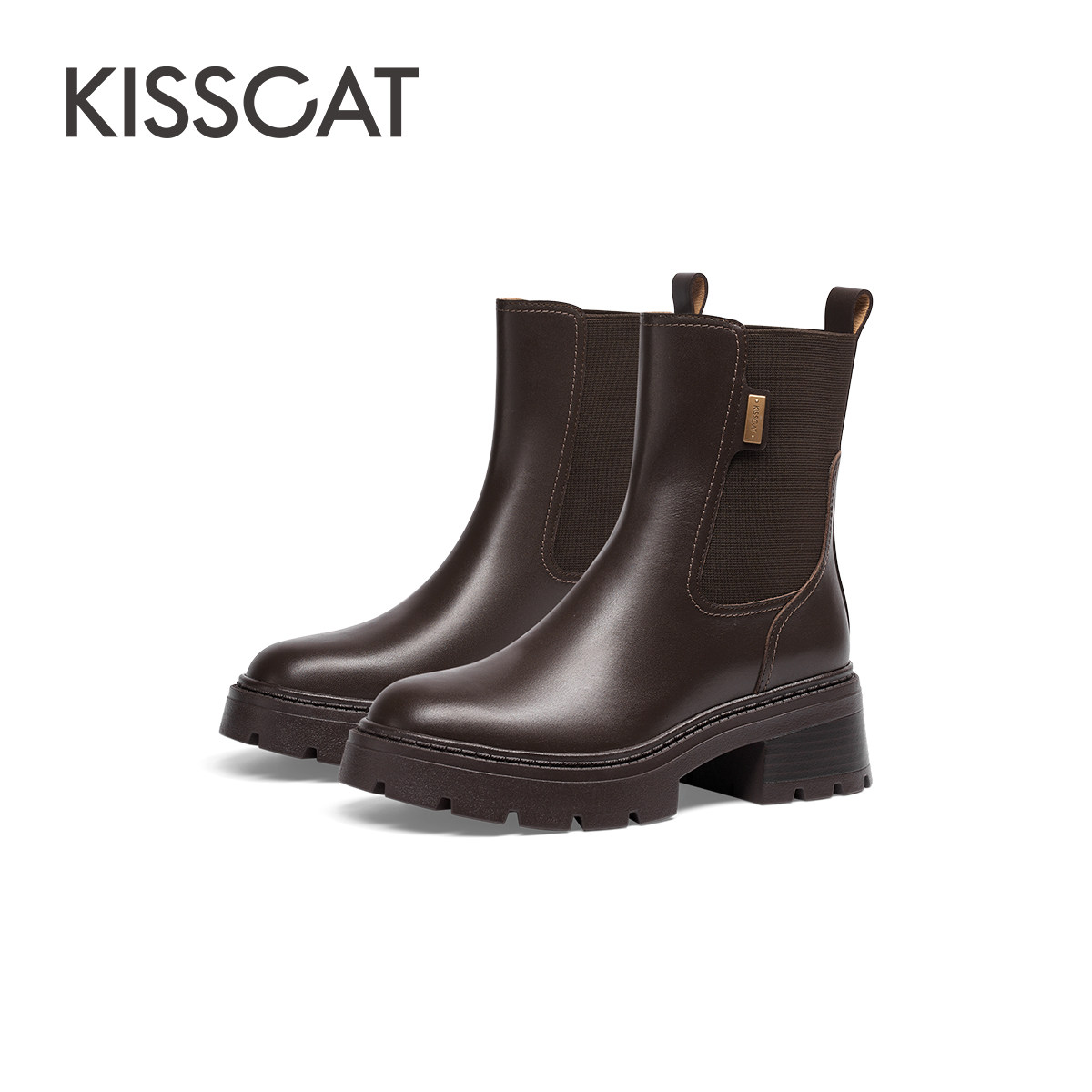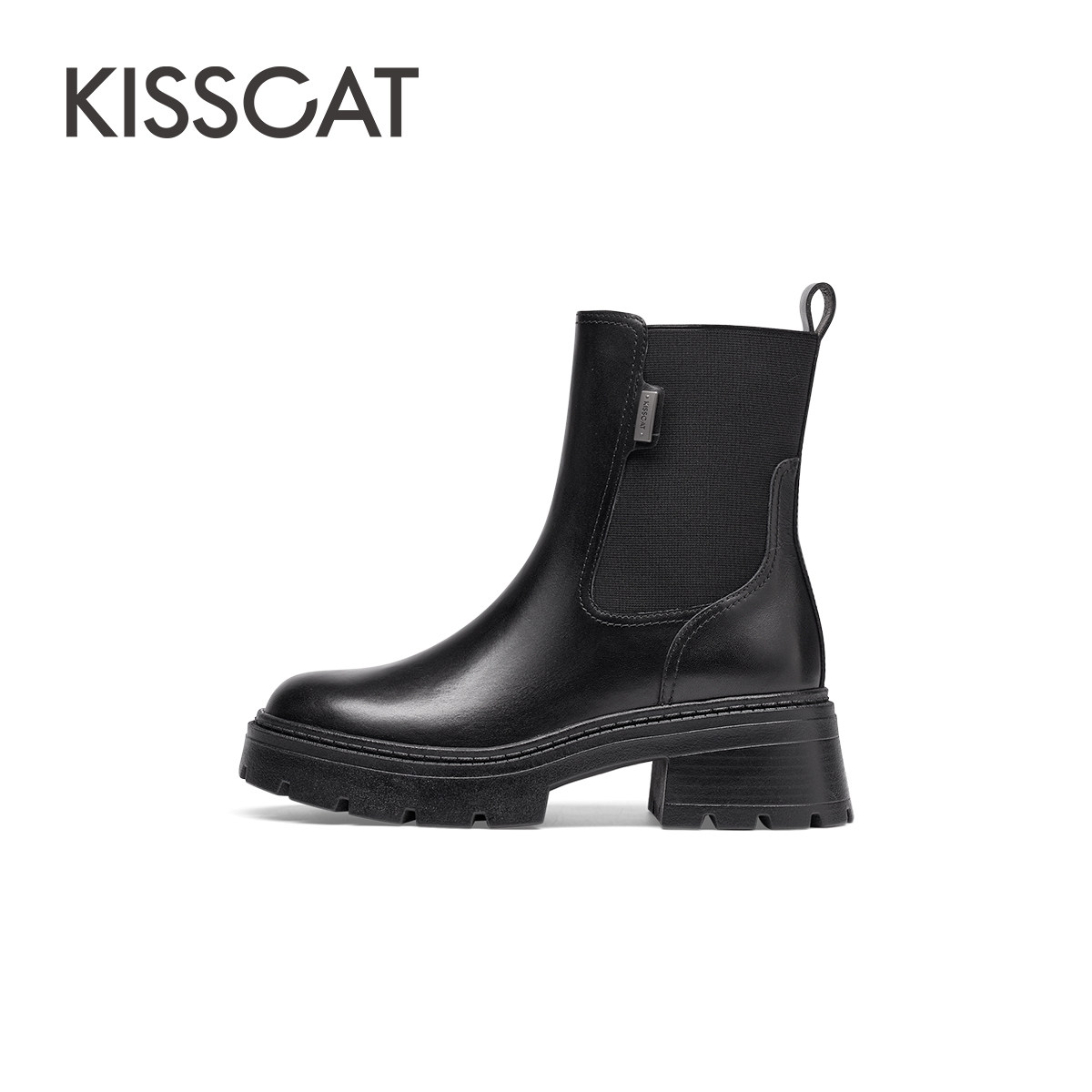百丽切尔西靴女靴冬季 保暖英伦风厚底短靴加绒烟筒靴子X2G2DDD3