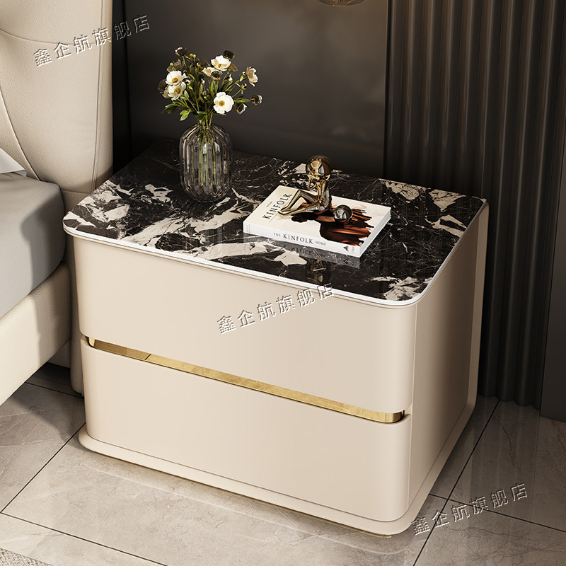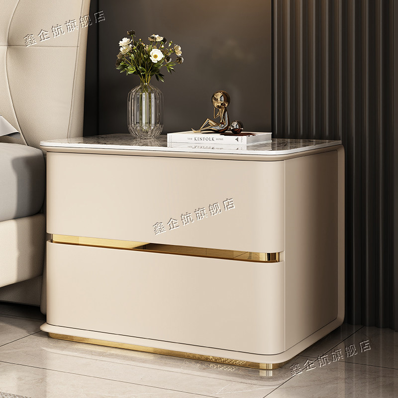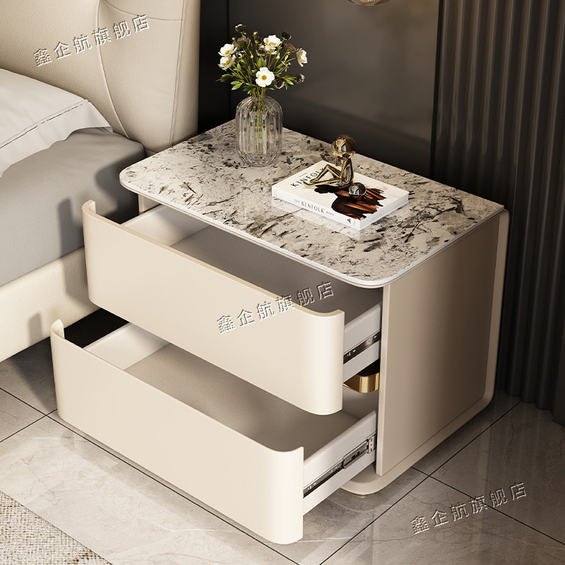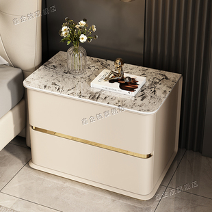 岩板实木床头柜家用小户型迷你窄柜简约现代皮革床边柜轻奢收纳柜
