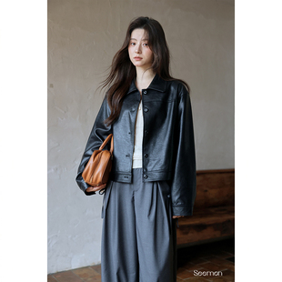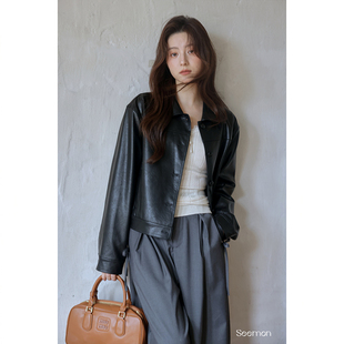复古短款 黑色pu皮衣外套女2025春秋新款 翻领机车皮夹克 Lin Maven