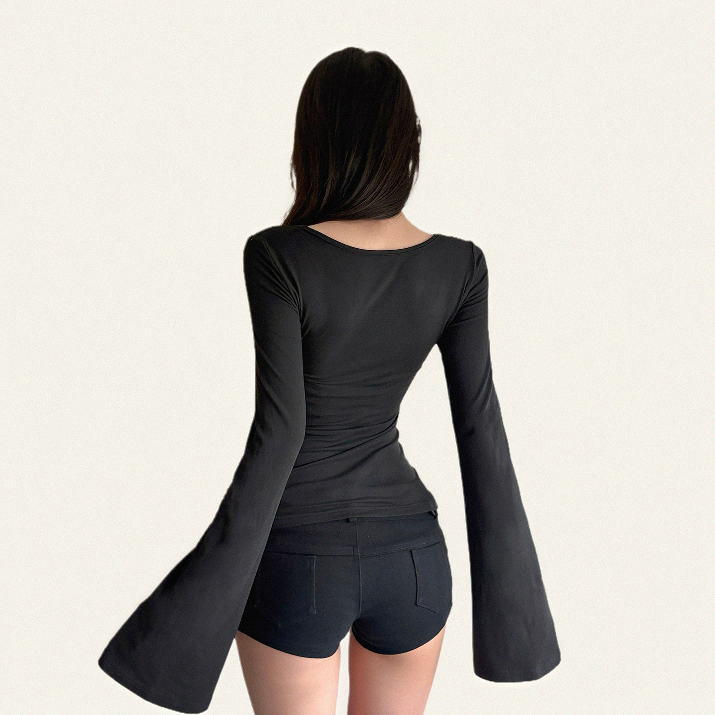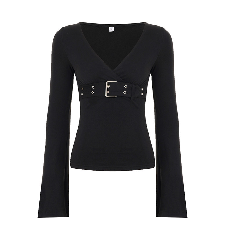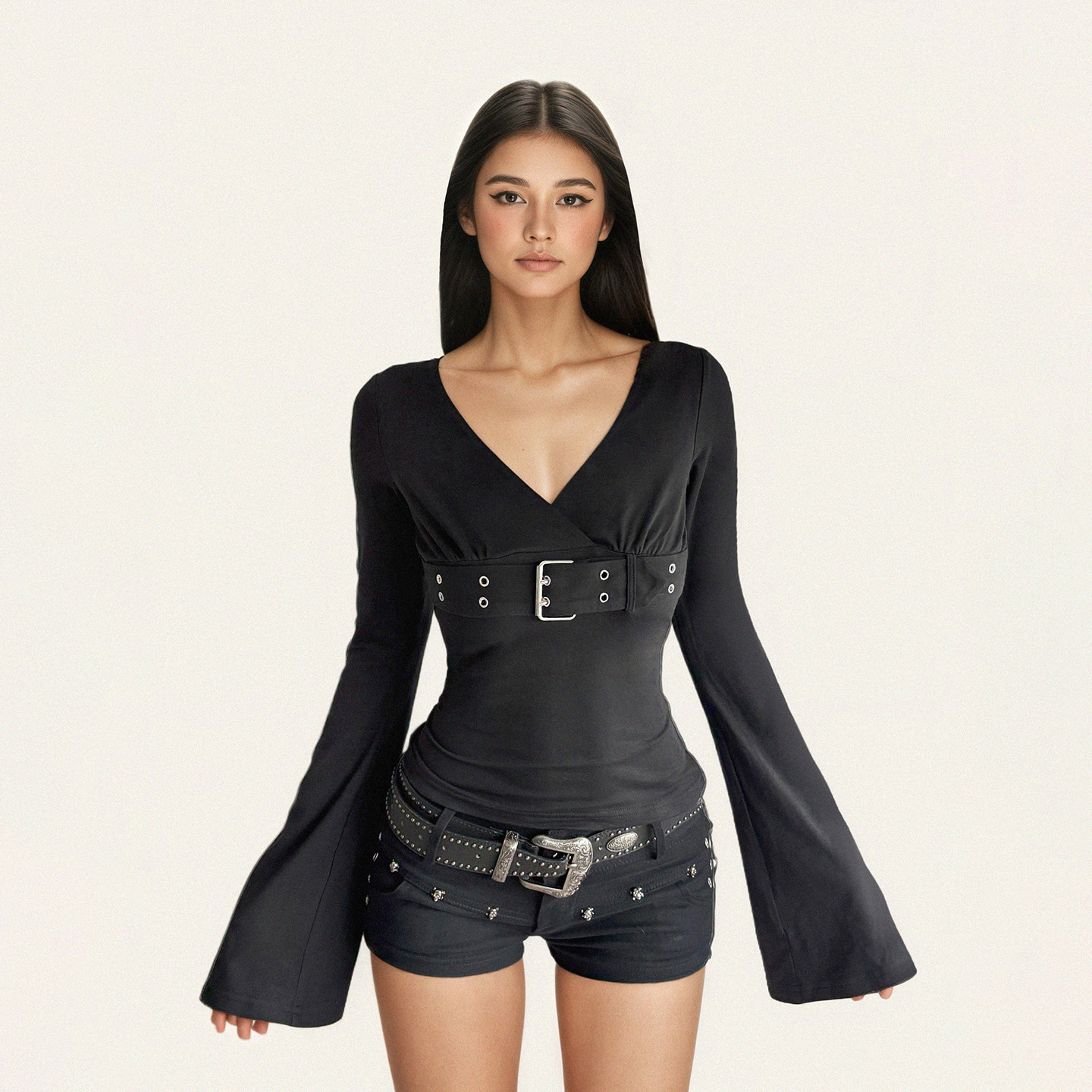 T恤秋街头机能收腰喇叭袖 复古黑色V领金属扣长袖 上衣 美式 FUNOFF