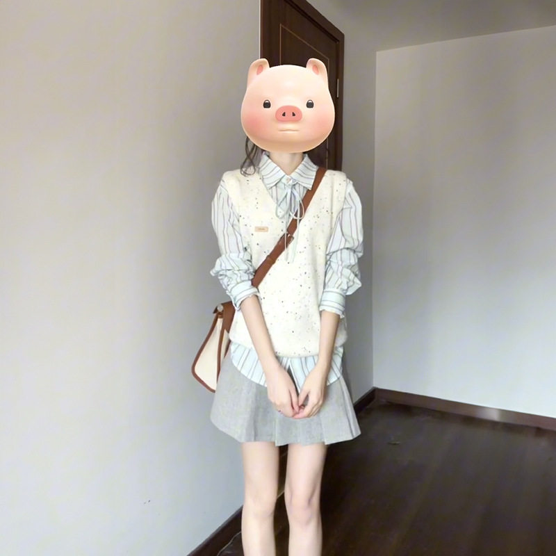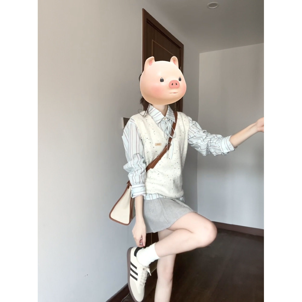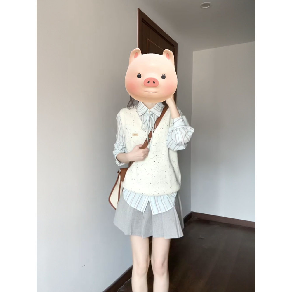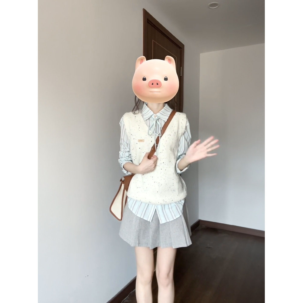 甜美学院风海盐芝士针织背心马甲毛衣女学生长袖 两件 条纹衬衫