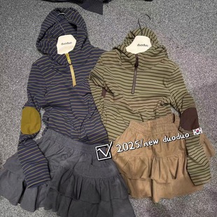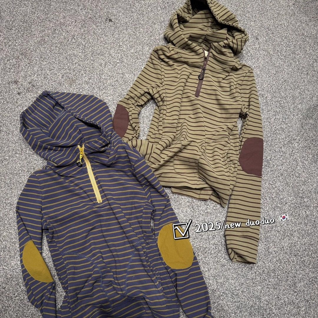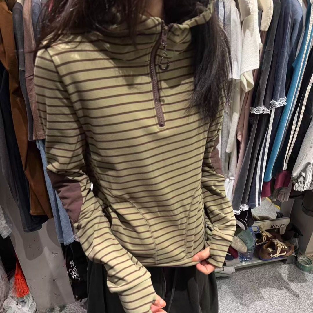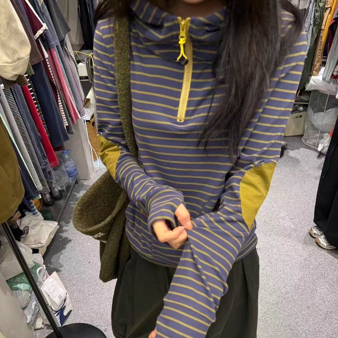 T恤百搭上衣打底衫 长袖 连帽领条纹拼色手肘补丁修身 DUODUO