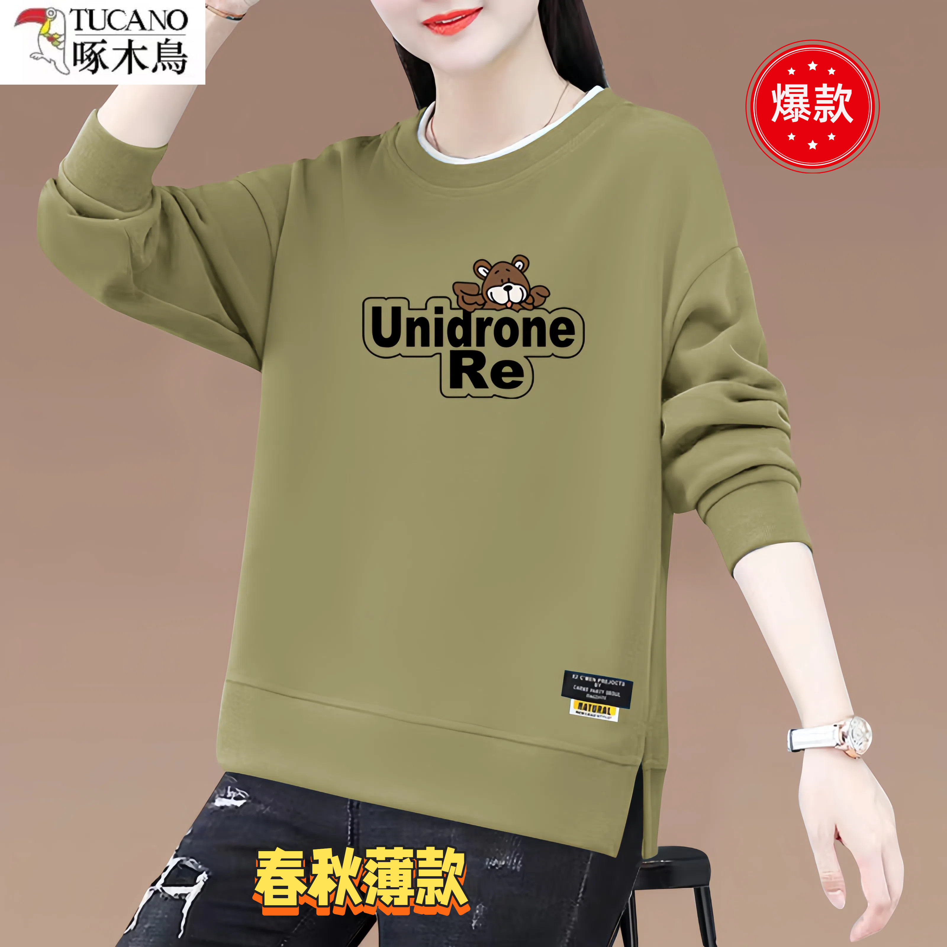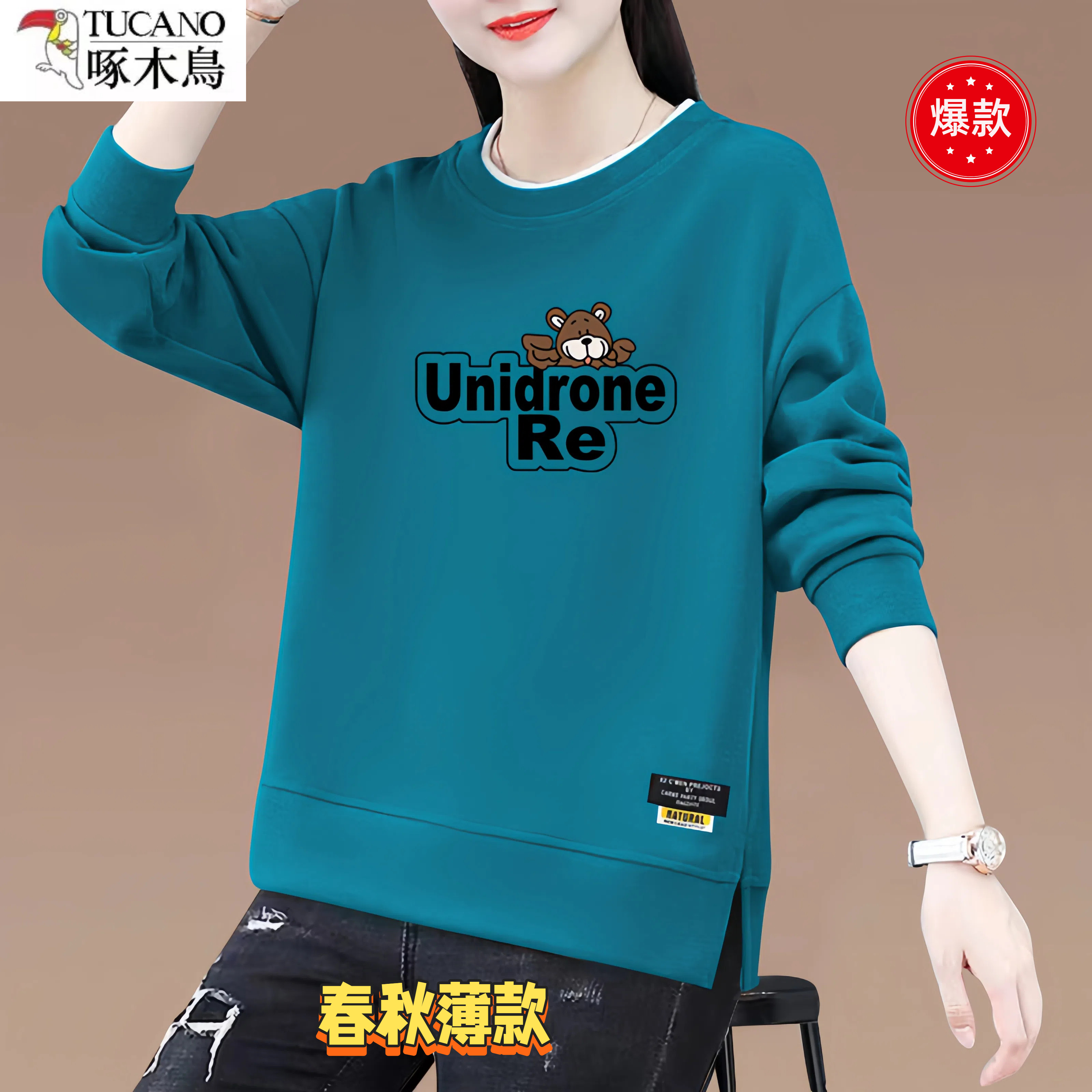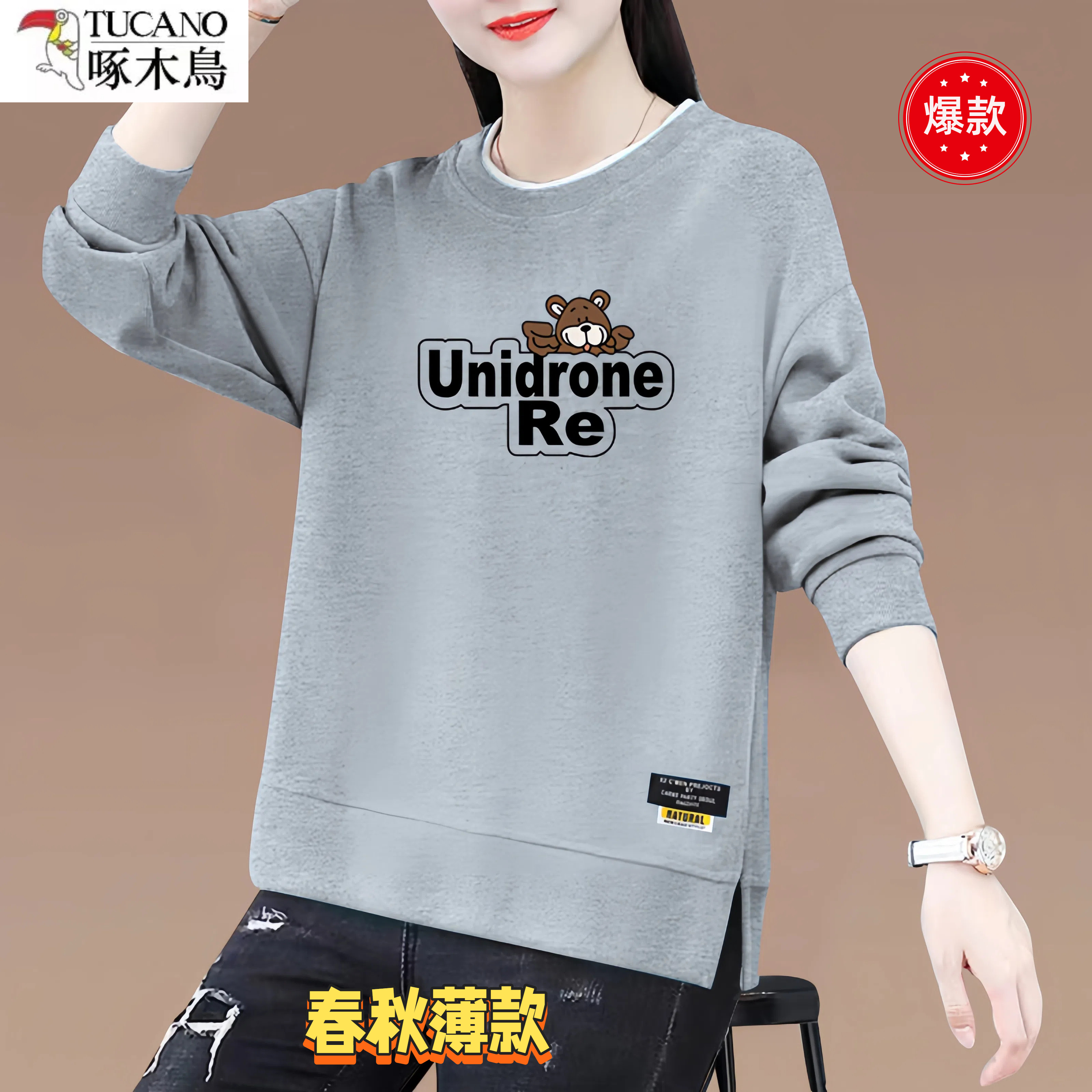 假两件长袖 薄款 T恤圆领印花女士打底 卫衣女2026秋冬季 啄木鸟时尚