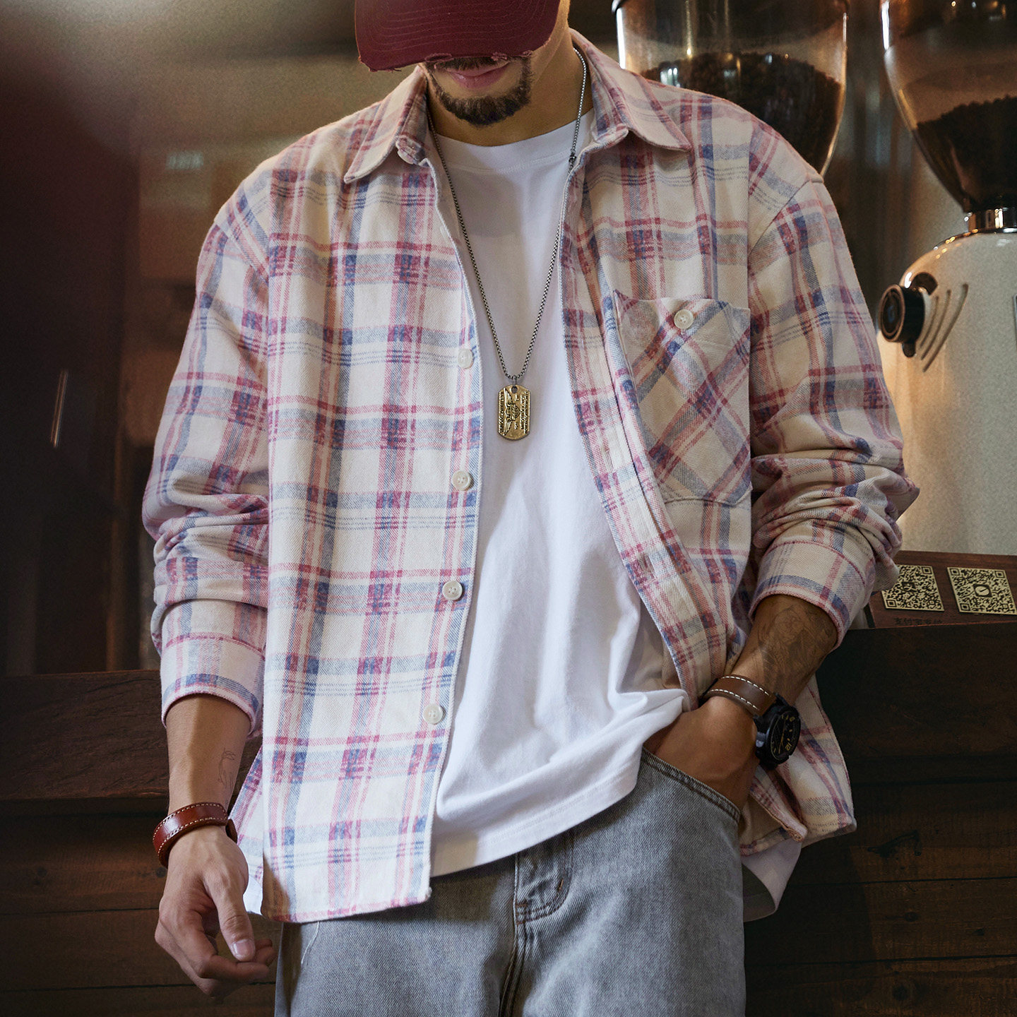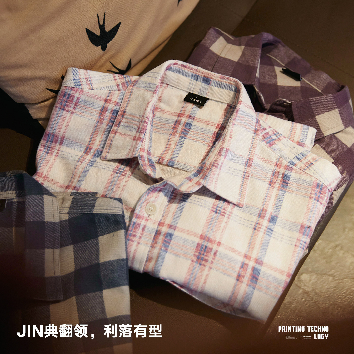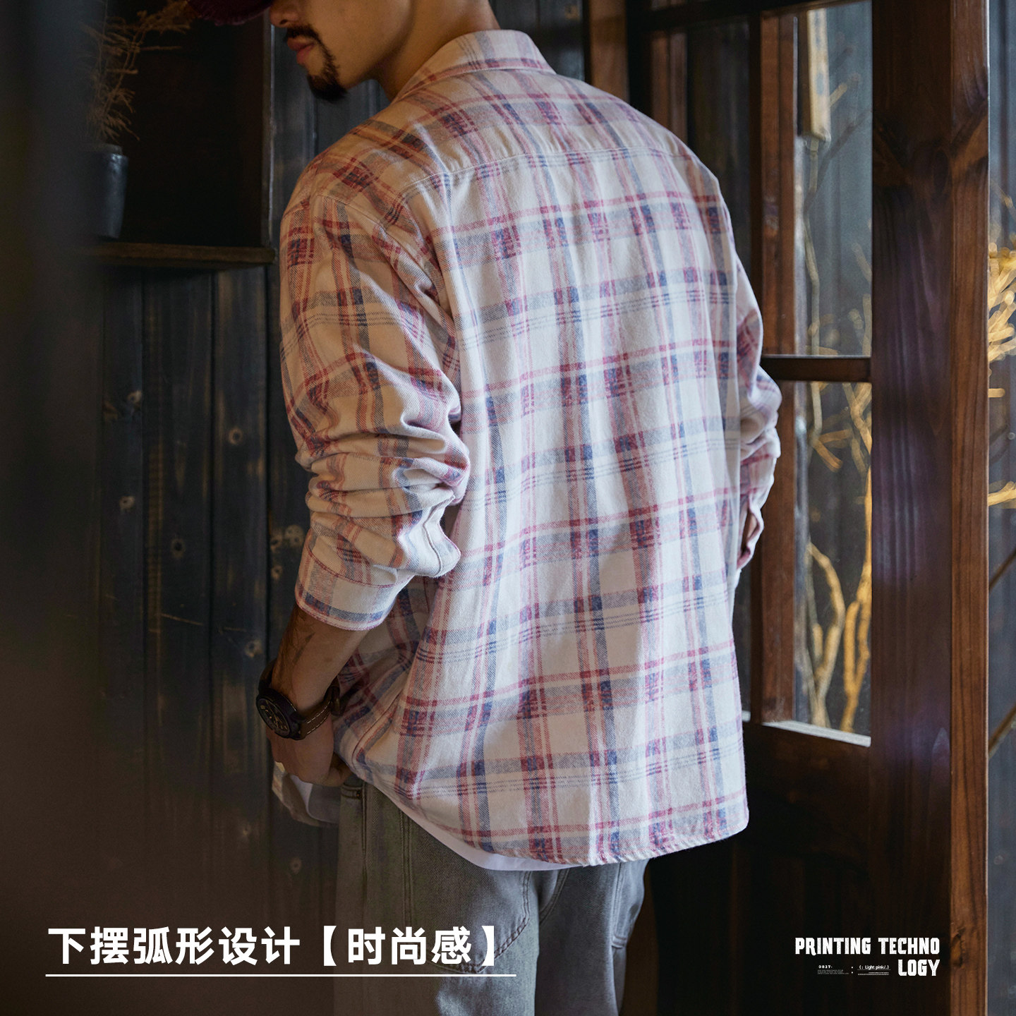 新款 男2026春季 水洗斑驳肌理感格子衬衣 衬衫 天丝莱赛尔淡粉色长袖