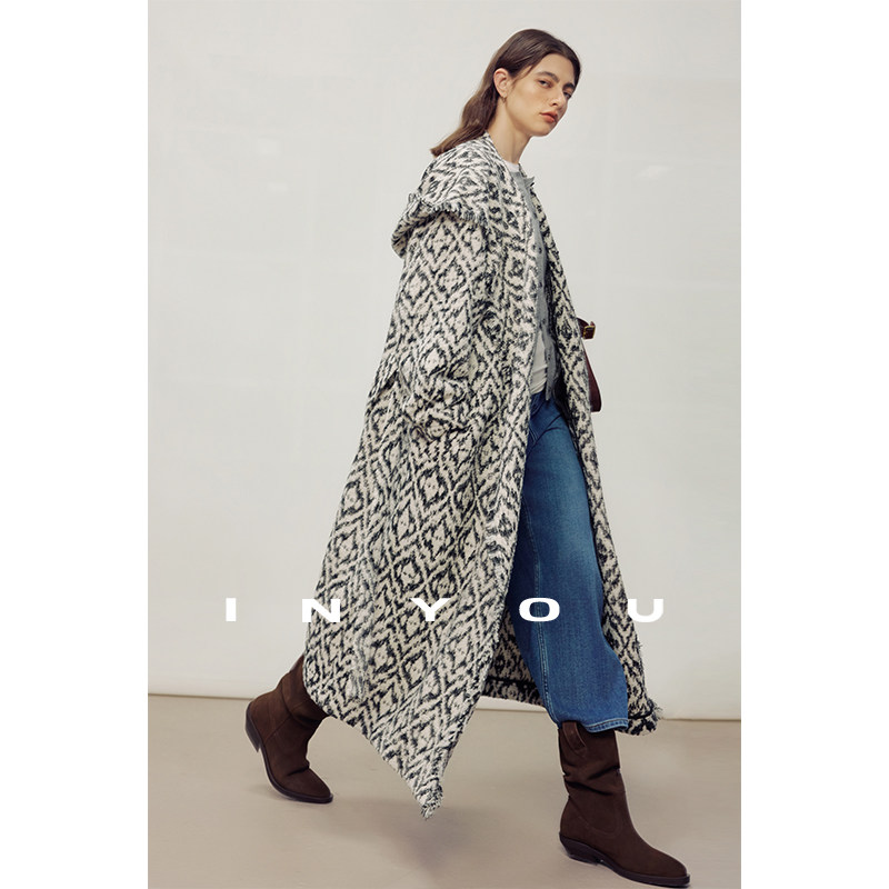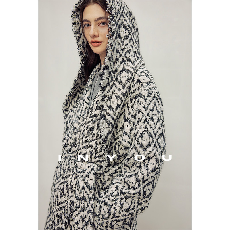 宽松气质休闲收腰大衣女 重工绵羊毛流苏连帽中长款 因由 秋冬时尚