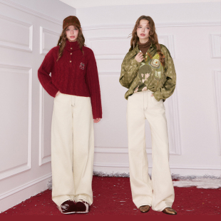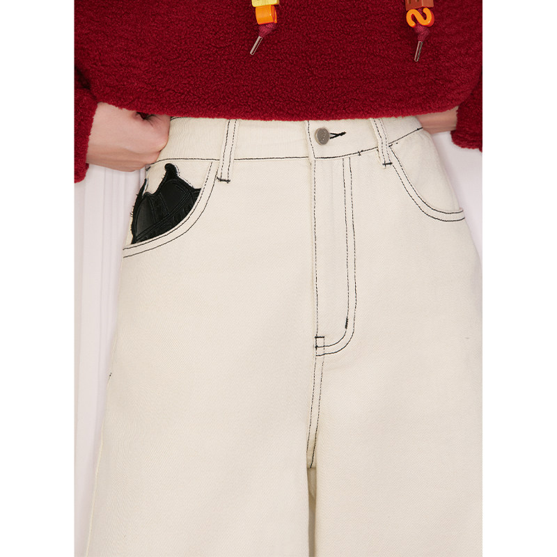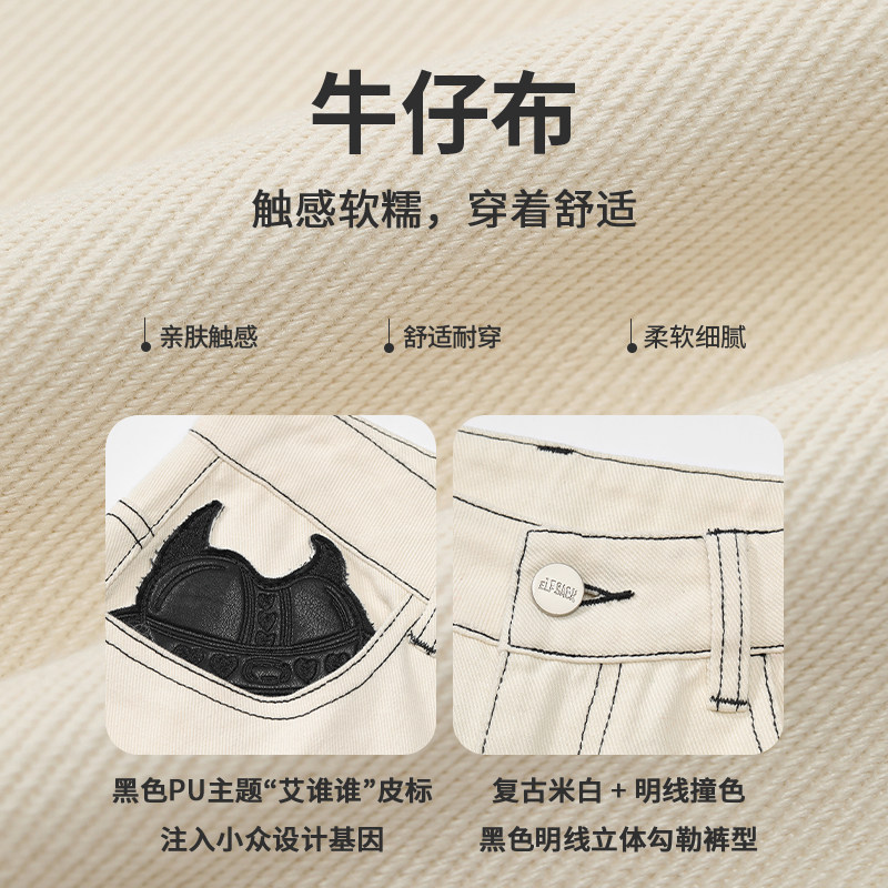 休闲百搭裤 女2026春秋新款 子 口袋复古米白色阔腿直筒牛仔裤 妖精