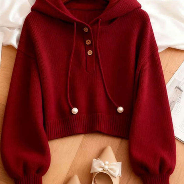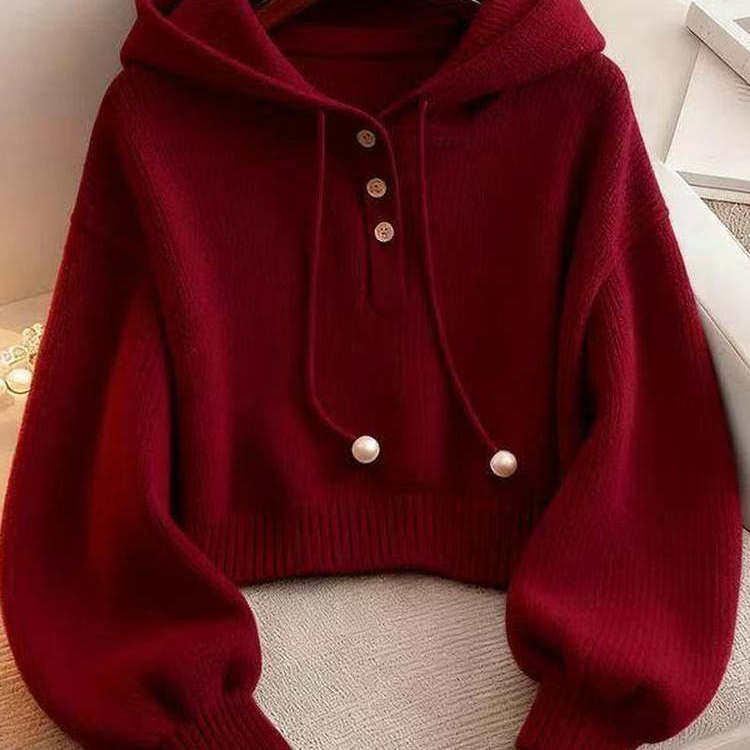 宽松慵懒风加厚保暖上衣 连帽针织毛衣设计感女秋冬季 爆款 红色开衫