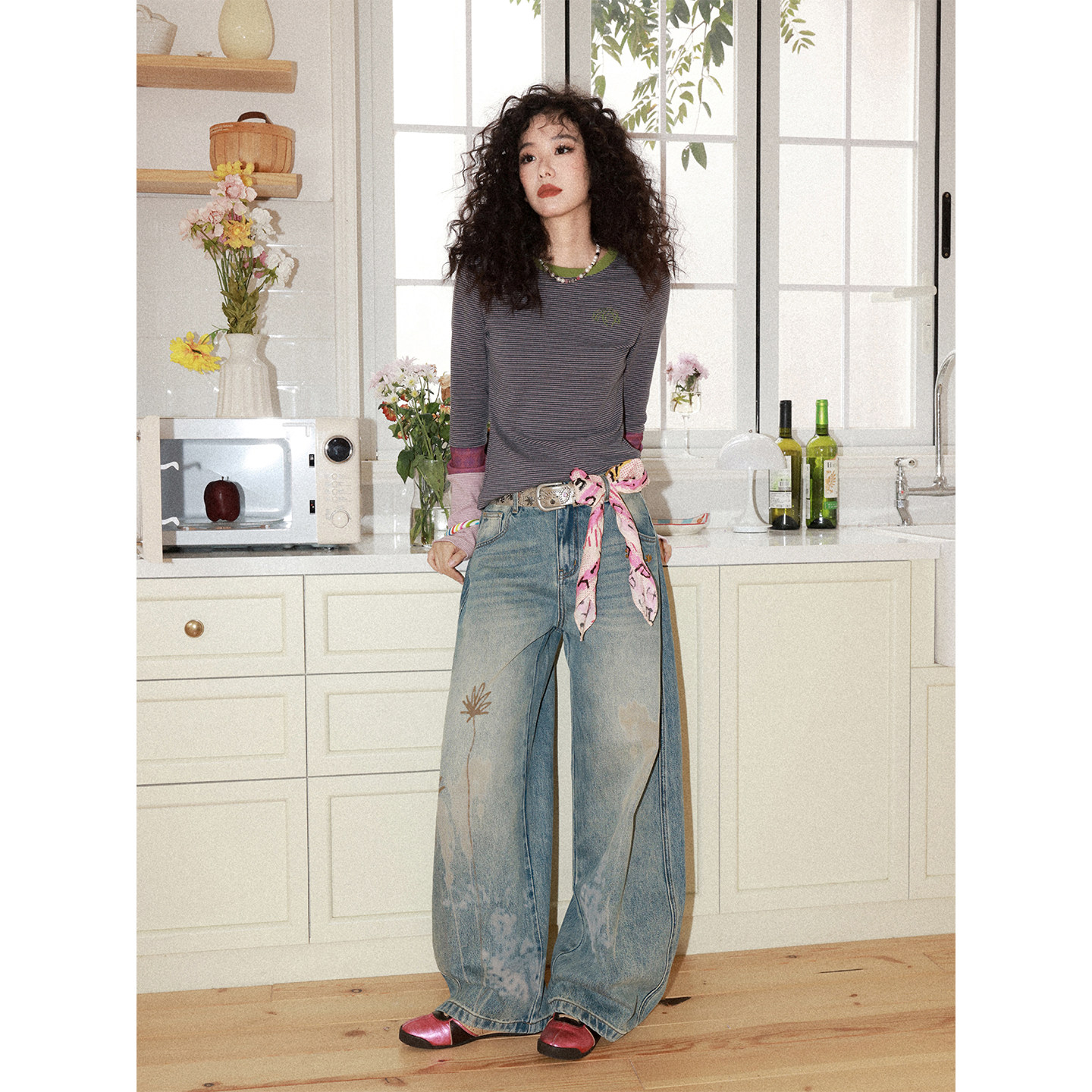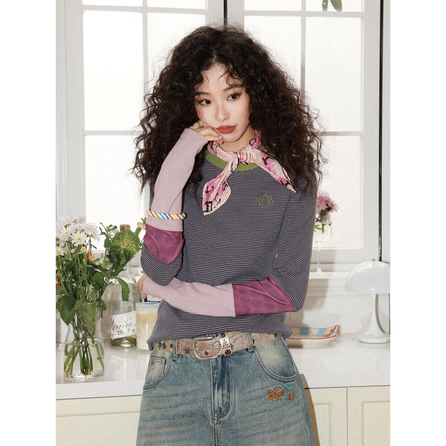 上衣女 T恤内搭打底衫 化学少女「野上花」条纹撞色拼接修身 长袖