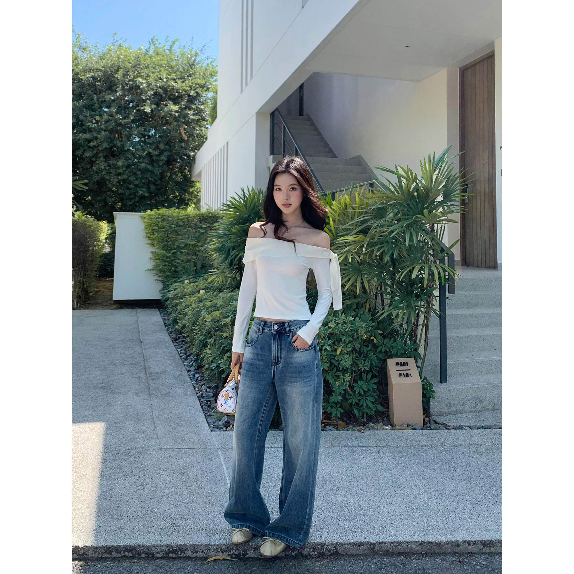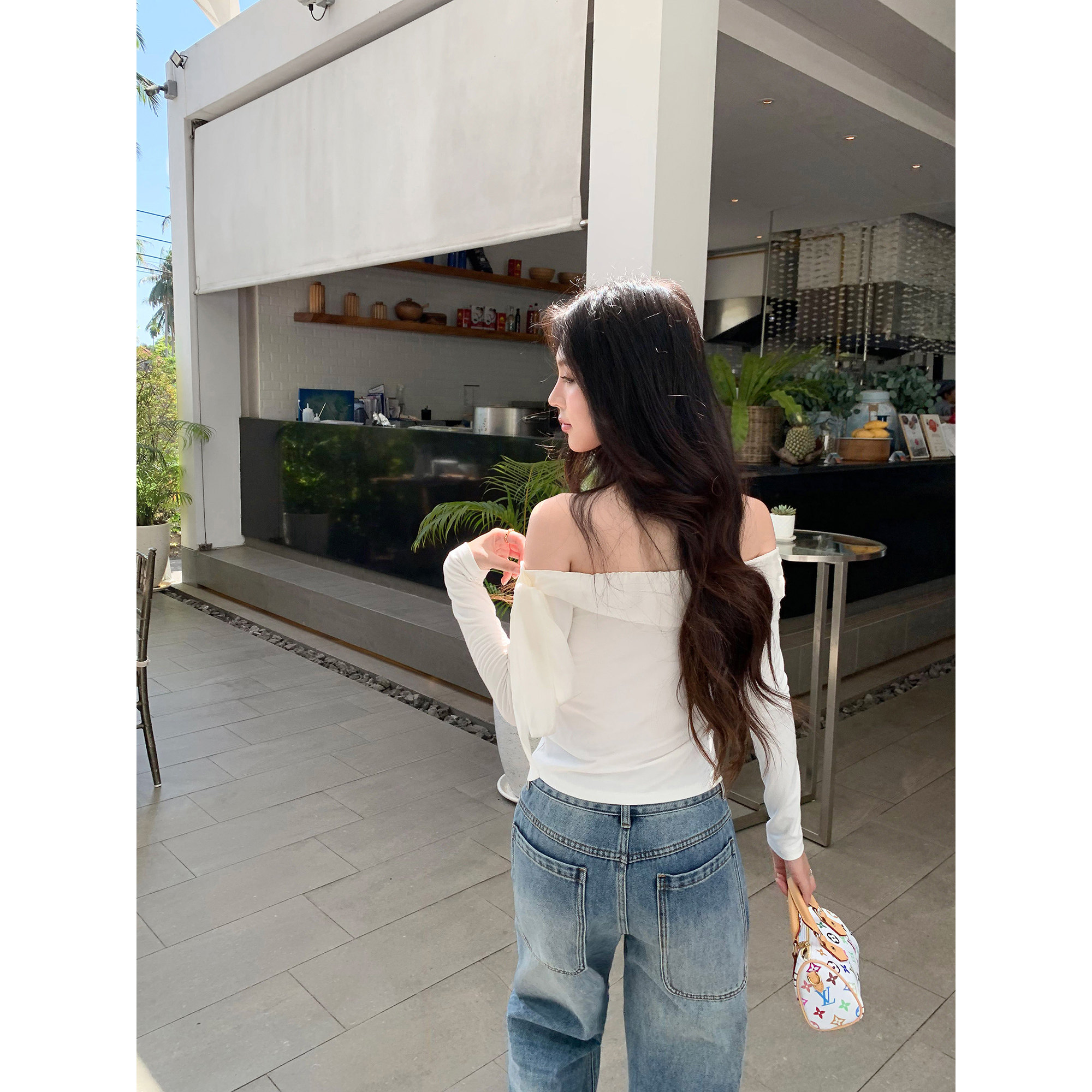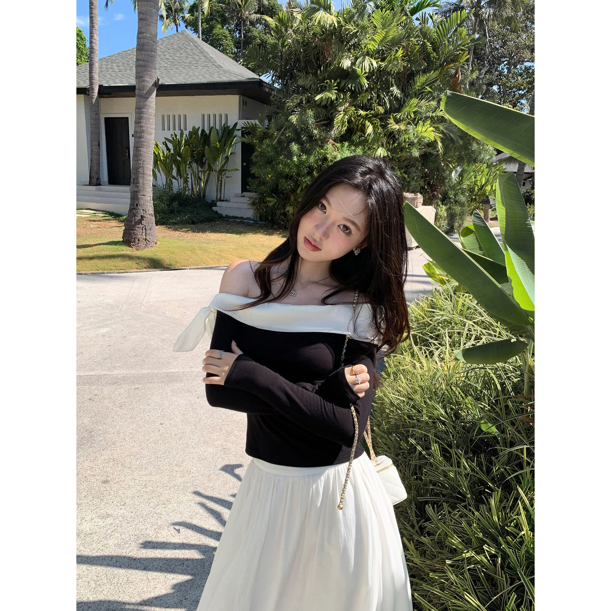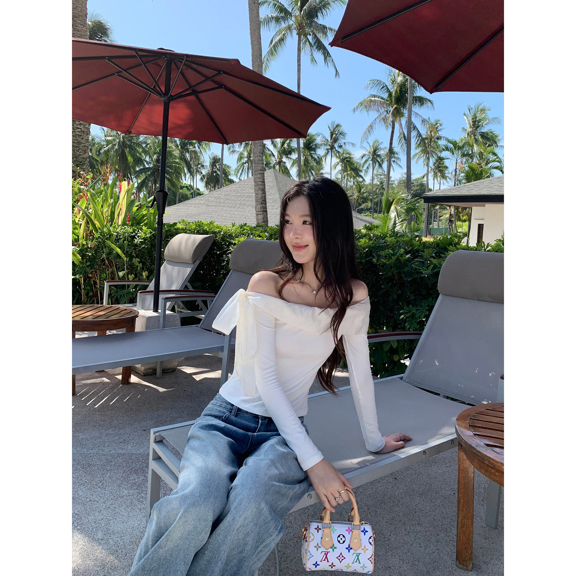 上衣 一字肩T恤女蝴蝶结系带设计感露肩短款 pusumede温柔时刻 法式