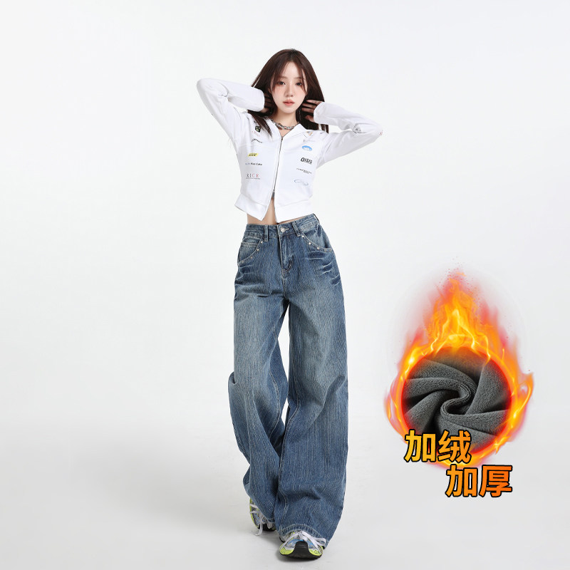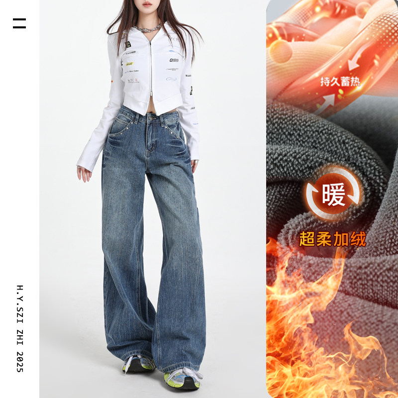 宽腿显瘦牛仔裤 热风女士加绒牛仔裤 新款 2025年冬季 直筒宽松长裤