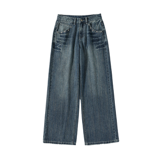 宽松丹宁水洗做旧简约休闲阔腿裤 直筒原色牛仔裤 子 Studio美式 HMN