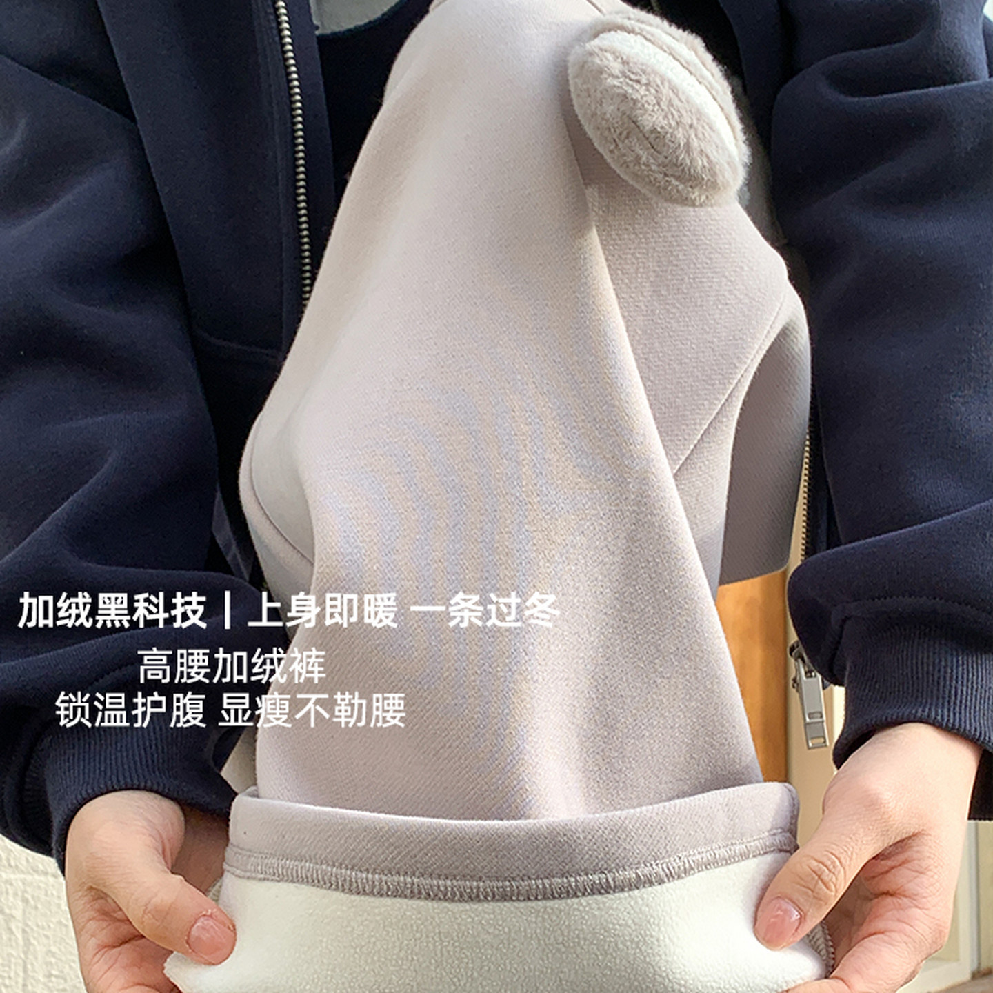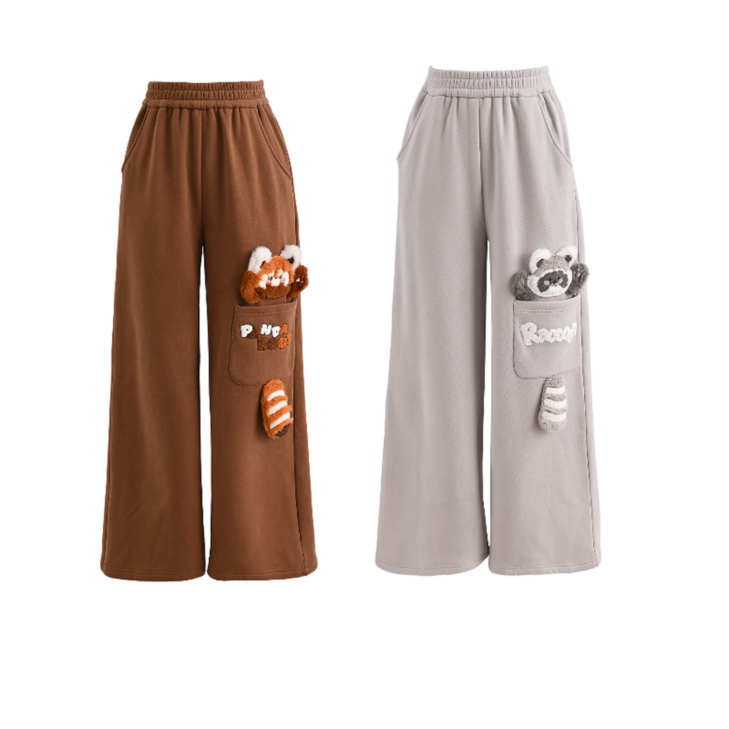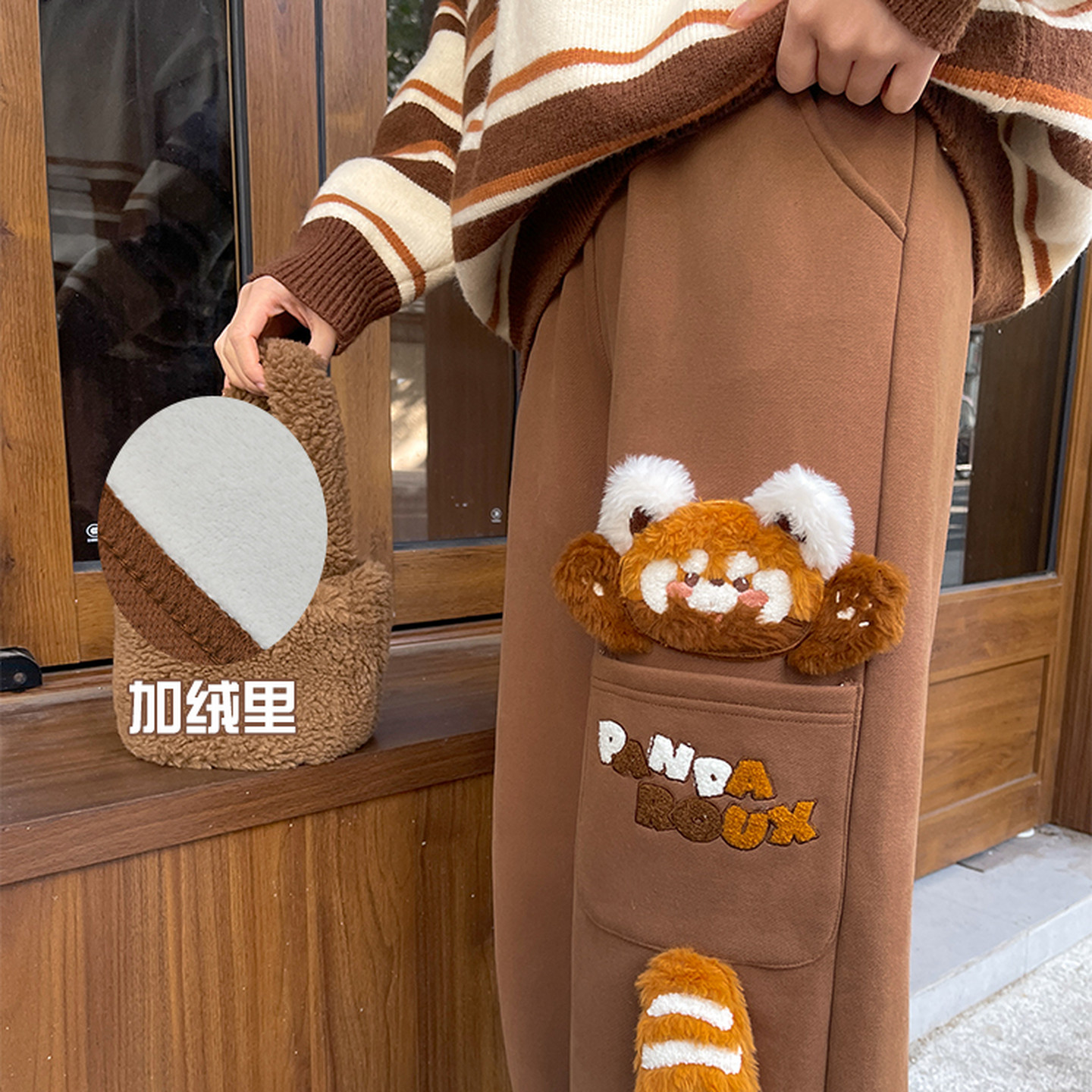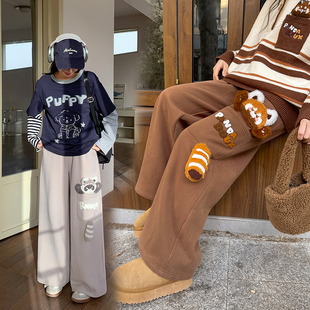 冬 百搭直筒卫裤 森女部落甜美风设计感小熊猫加绒高腰休闲裤 女新款