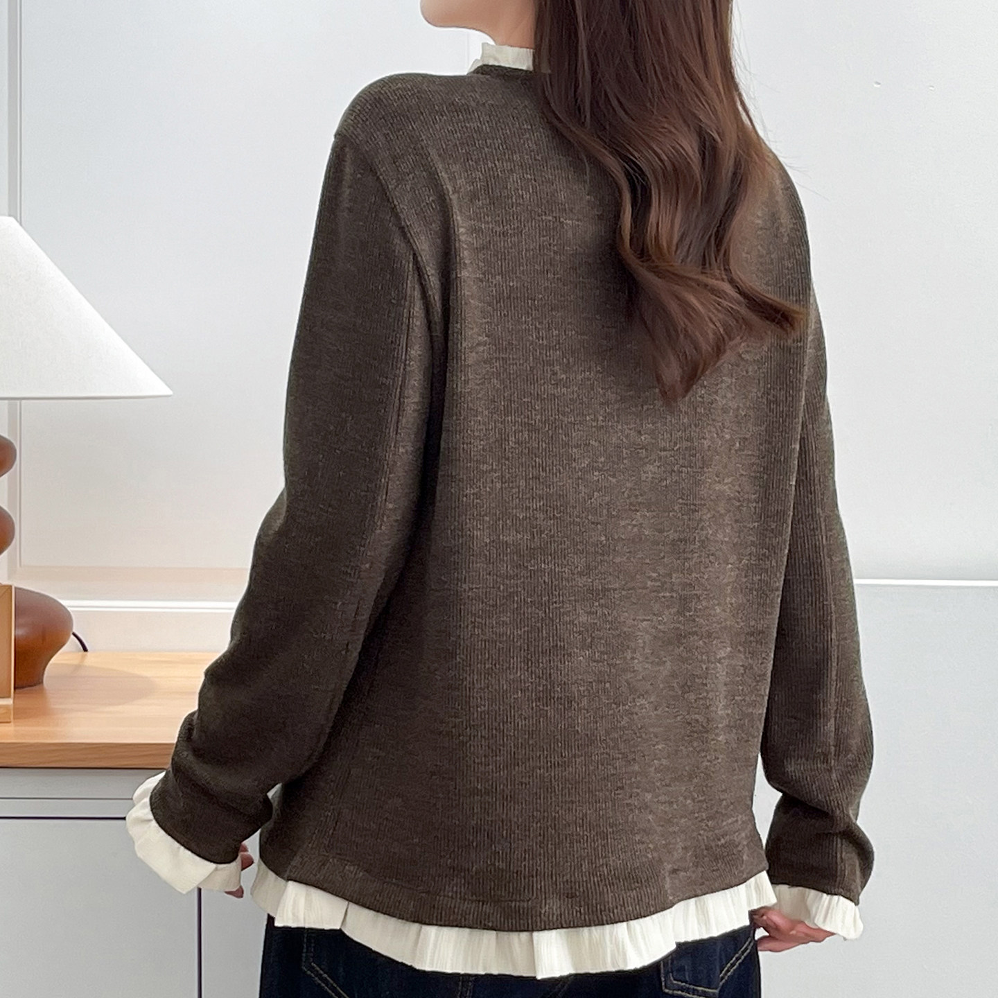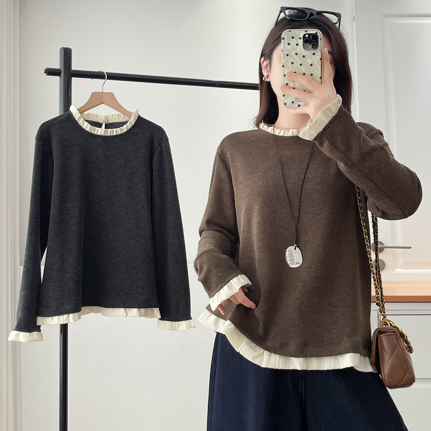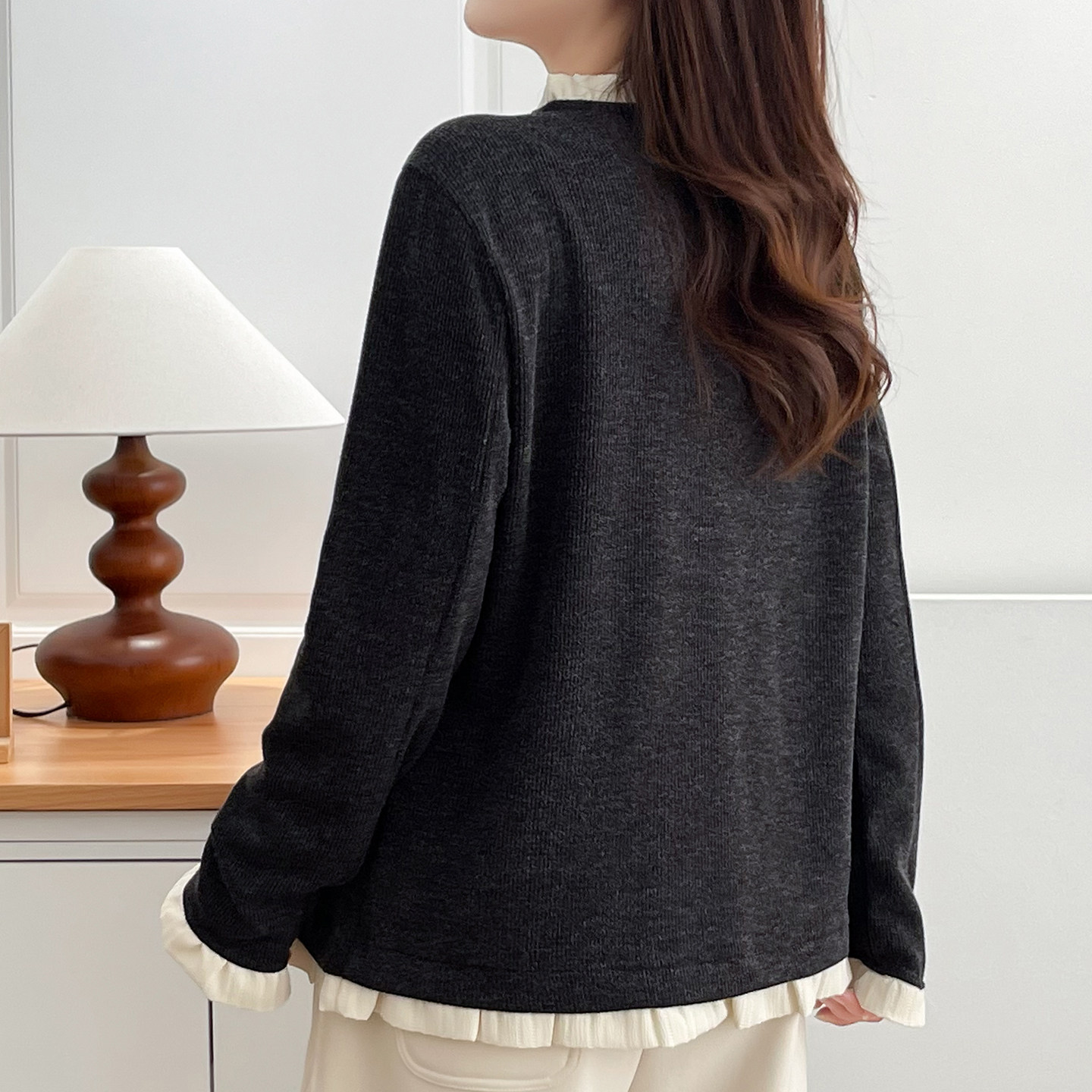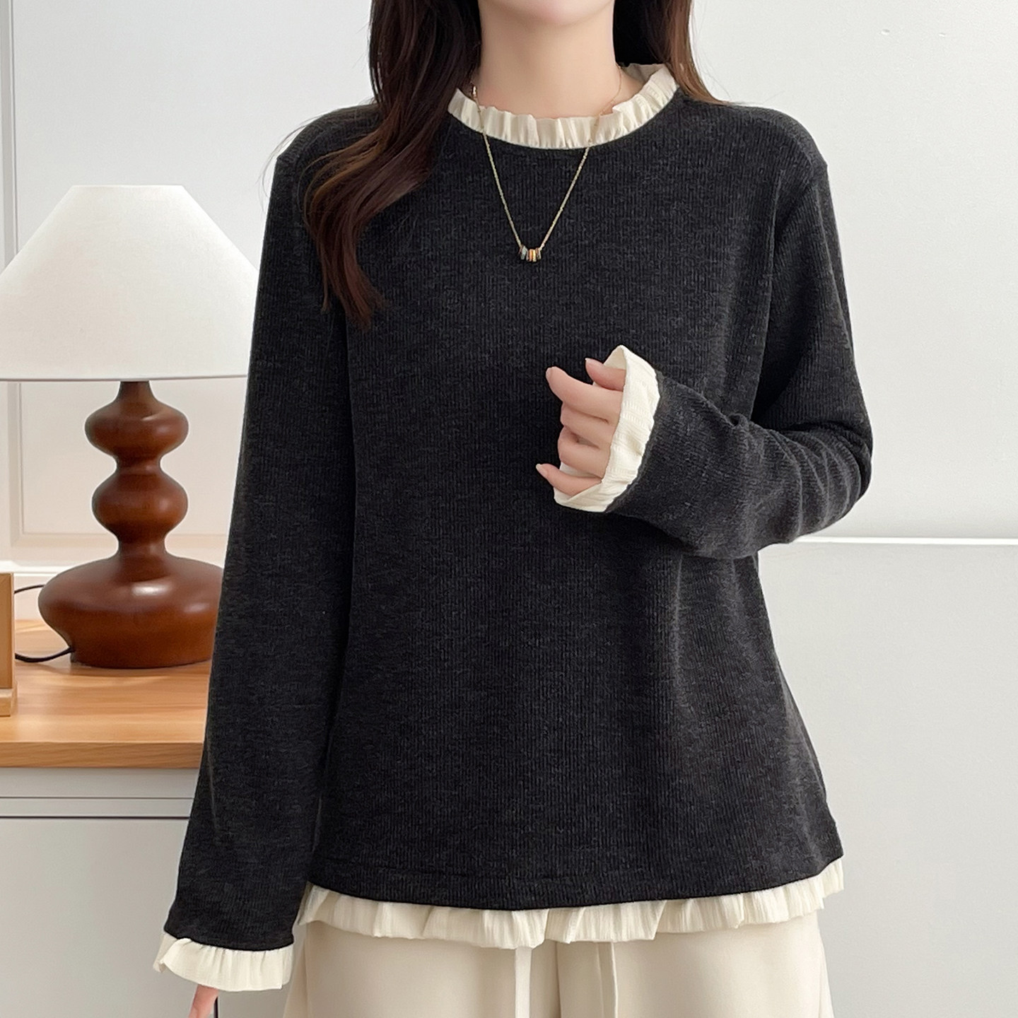 胖mm减龄慵懒风内搭上衣 时髦气质假两件螺纹木耳边打底衫 大码 女装