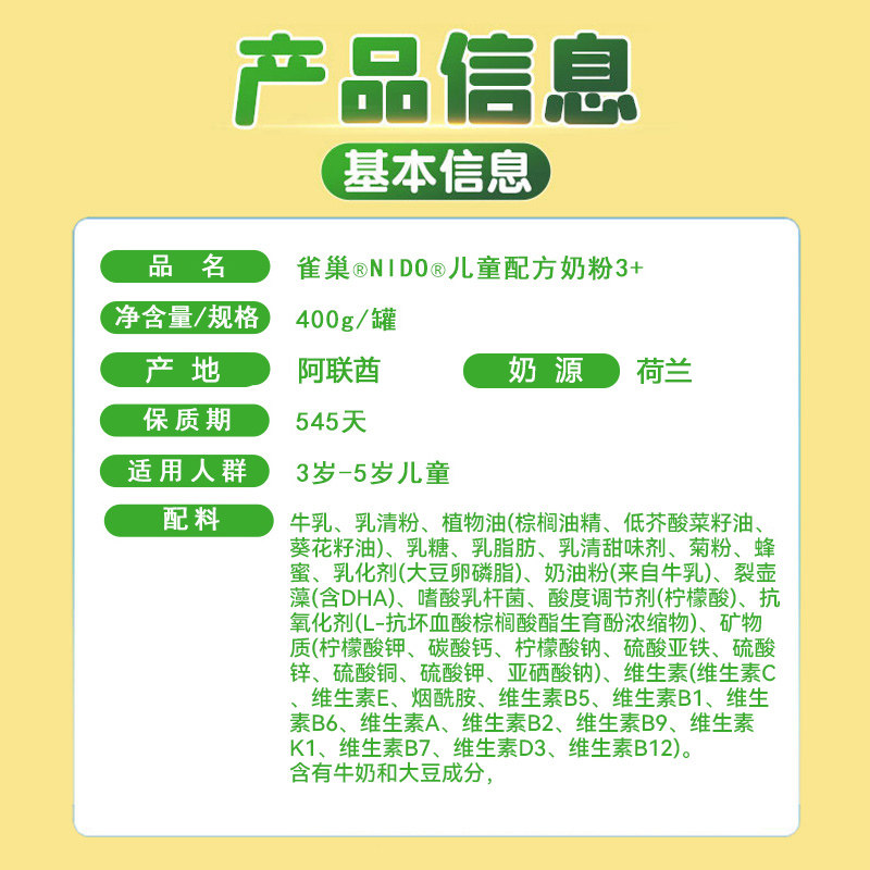 儿童奶粉高钙锌维生素D奶粉400g 雀巢NIDO3 Nestle 罐 自营