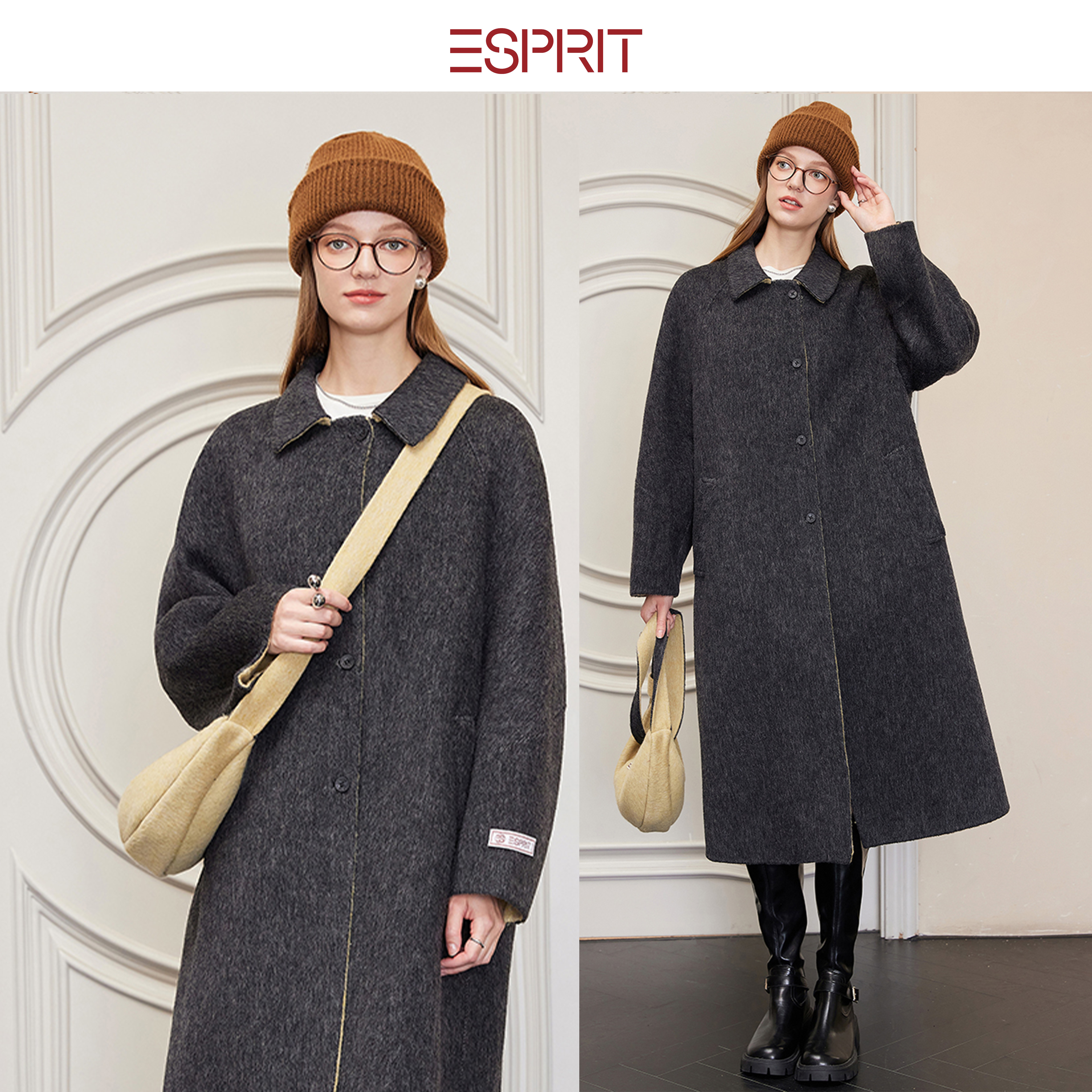 ESPRIT 毛呢大衣女高级感翻领通勤外套 埃斯普利特复古老钱风长款