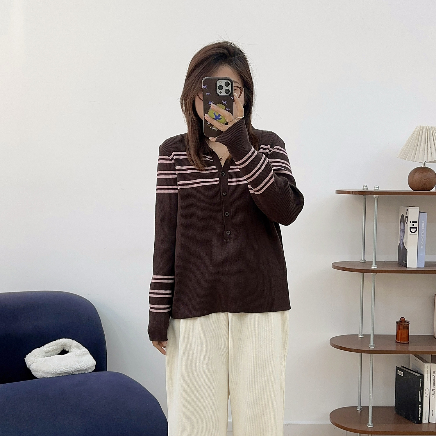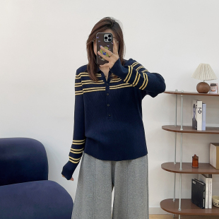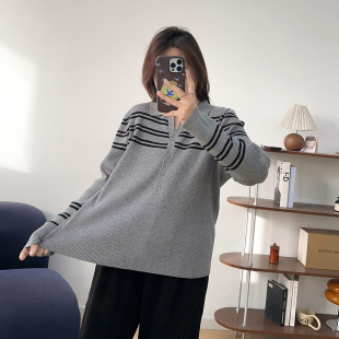 针织衫 新款 宽松显瘦内搭上衣 减龄条纹polo领黑色毛衣秋季 宛宛大码