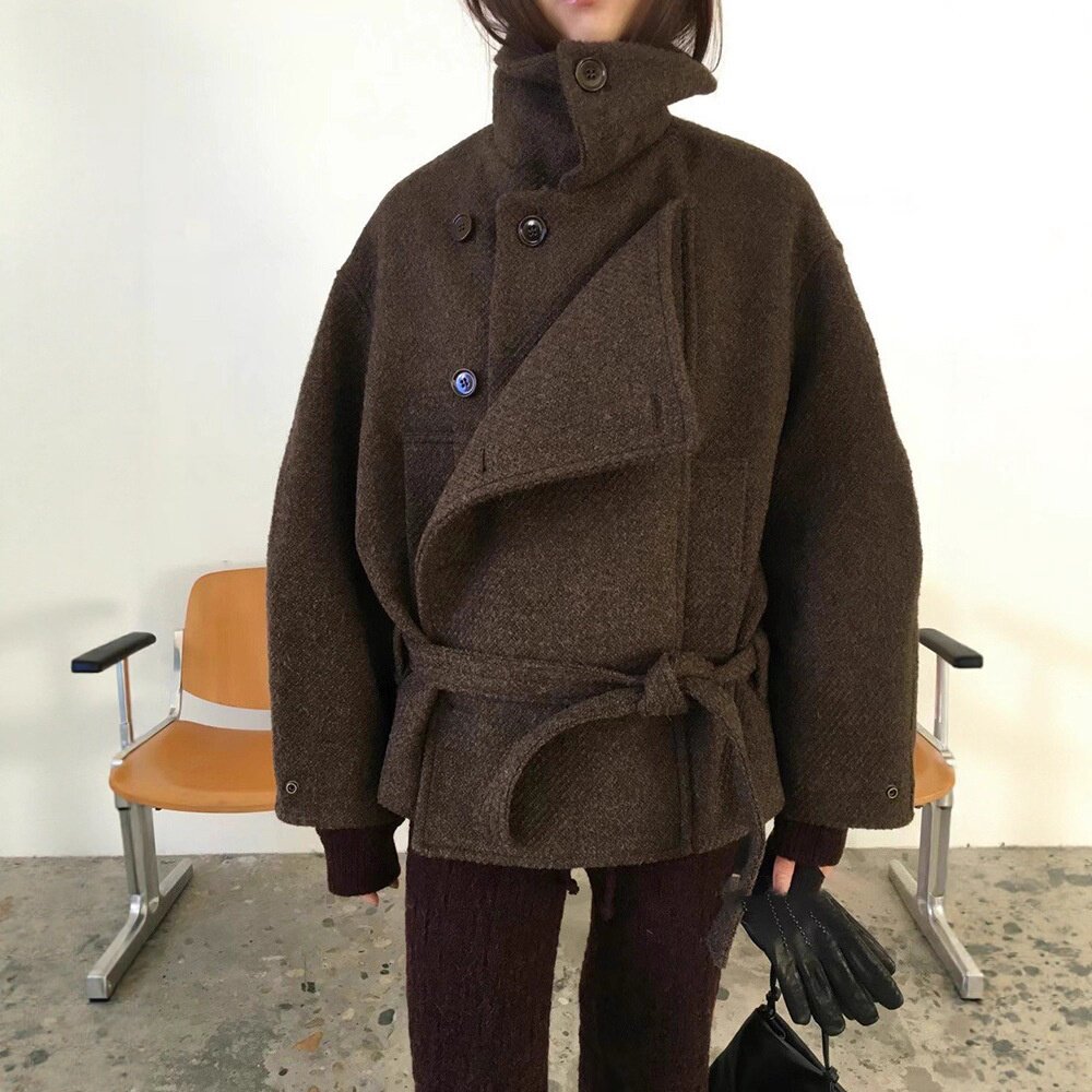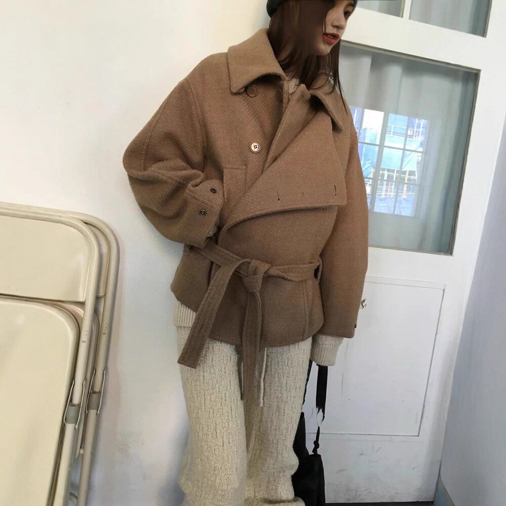 breathe现H25秋冬款 韩国东大门羊毛系带翻领保暖收腰上衣毛呢外套