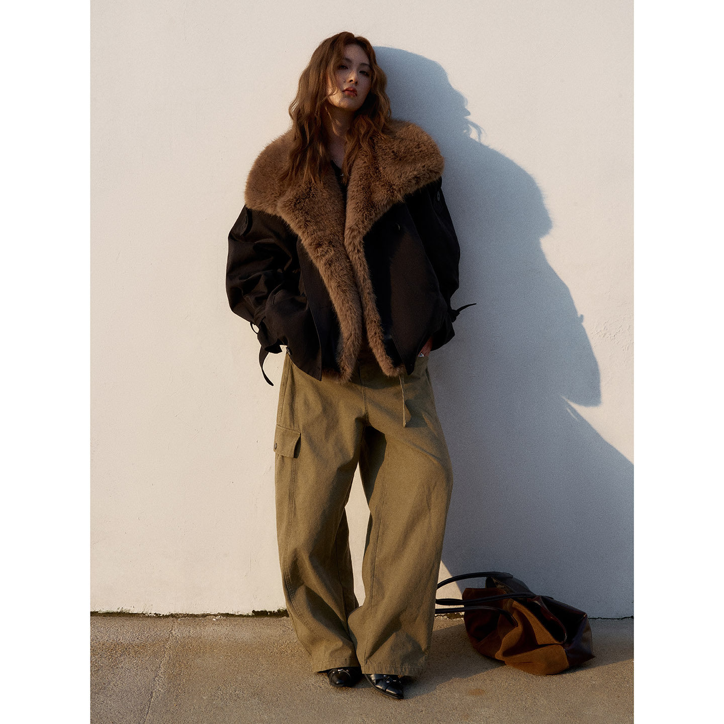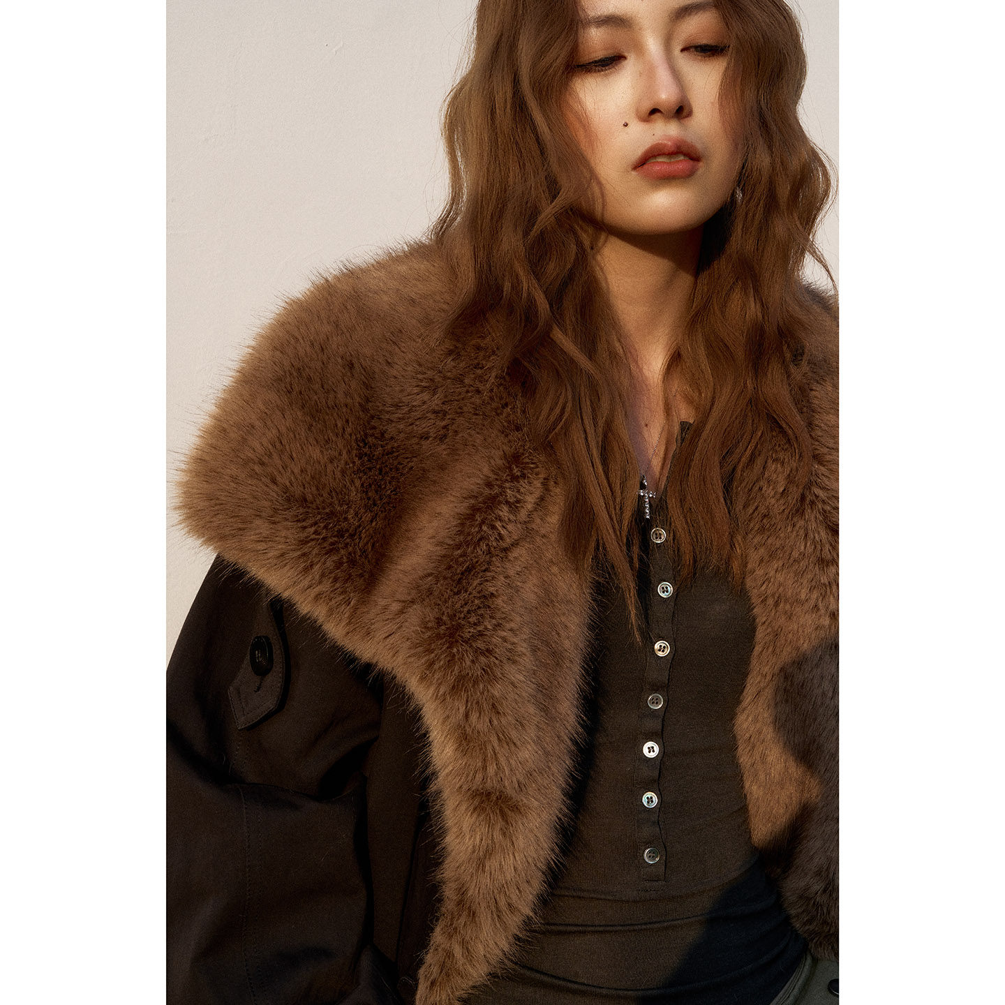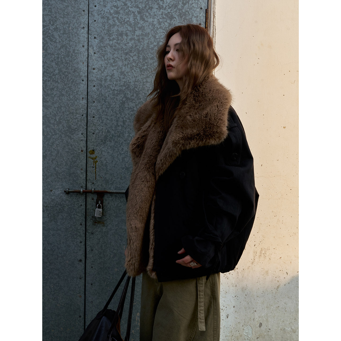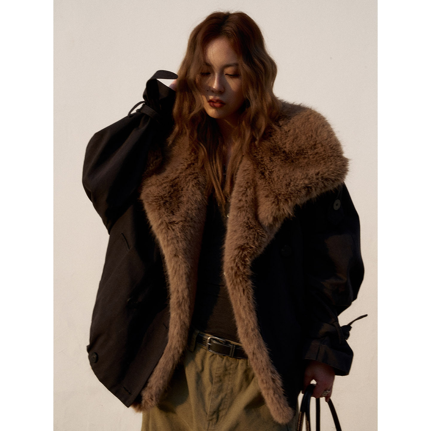 洛边 复古风仿狐狸毛领派克服女高级感夹绵外套 原创设计师款