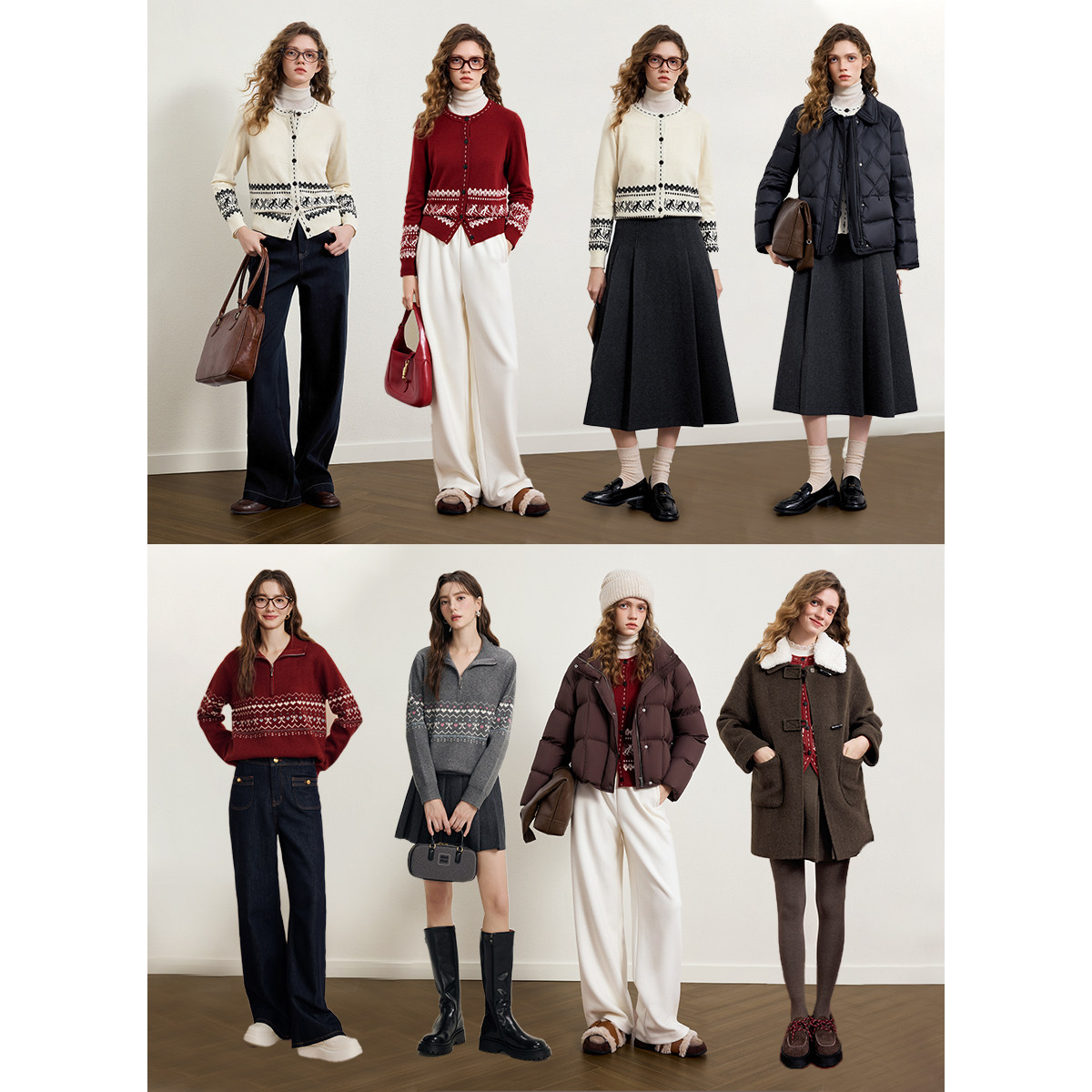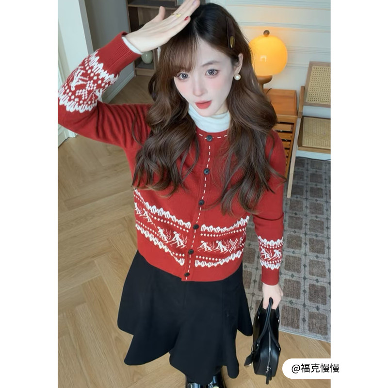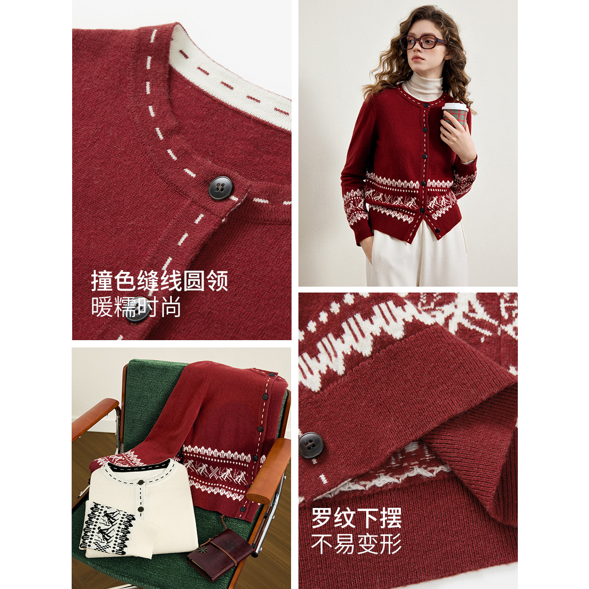新款 女2026春装 KBNE费尔岛圆领提花羊毛衫 打底红色上衣 澳毛绒