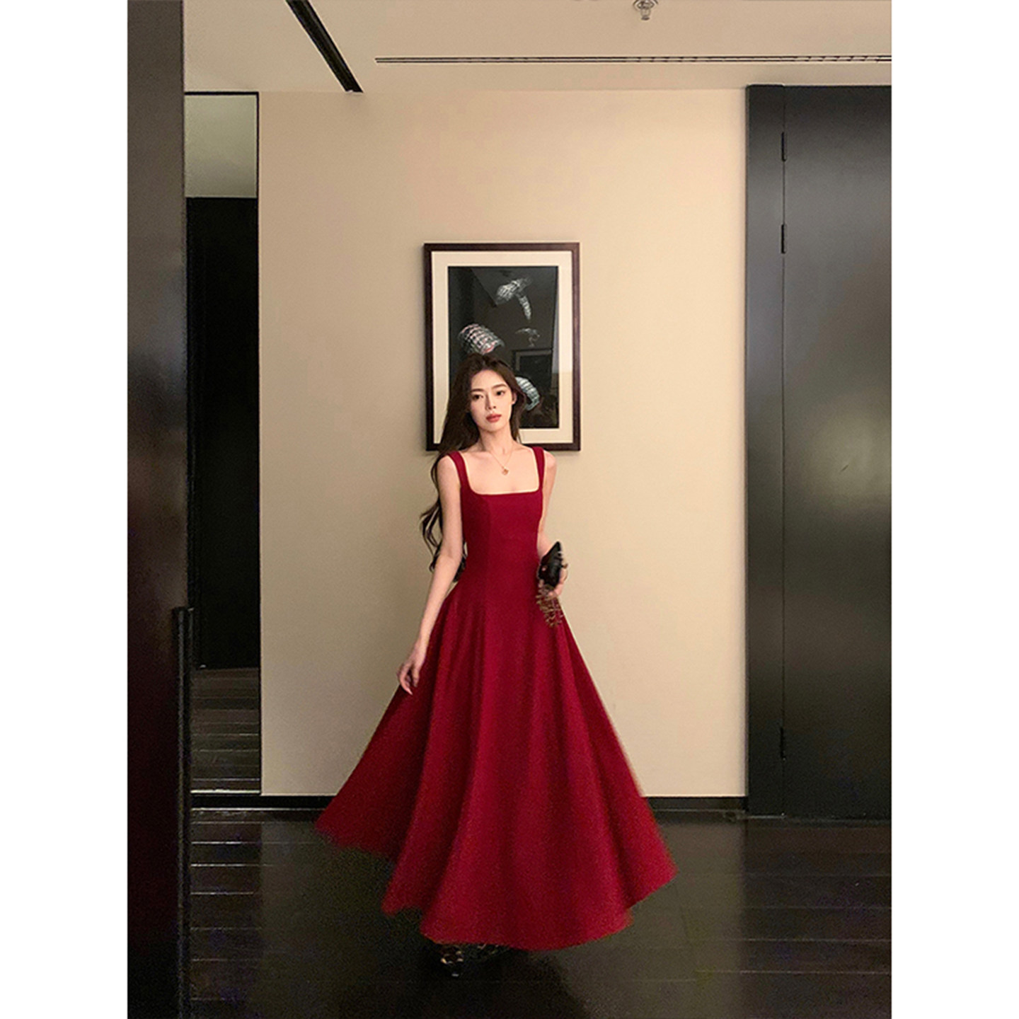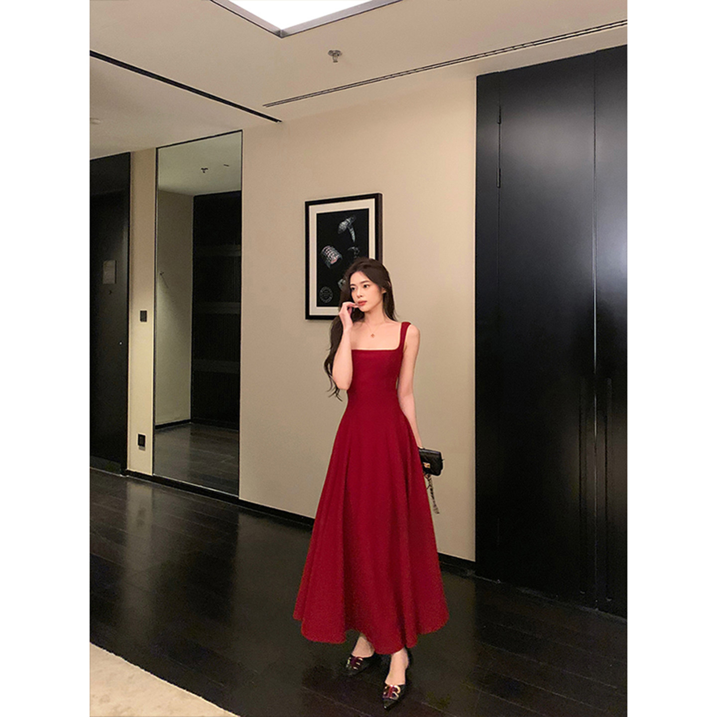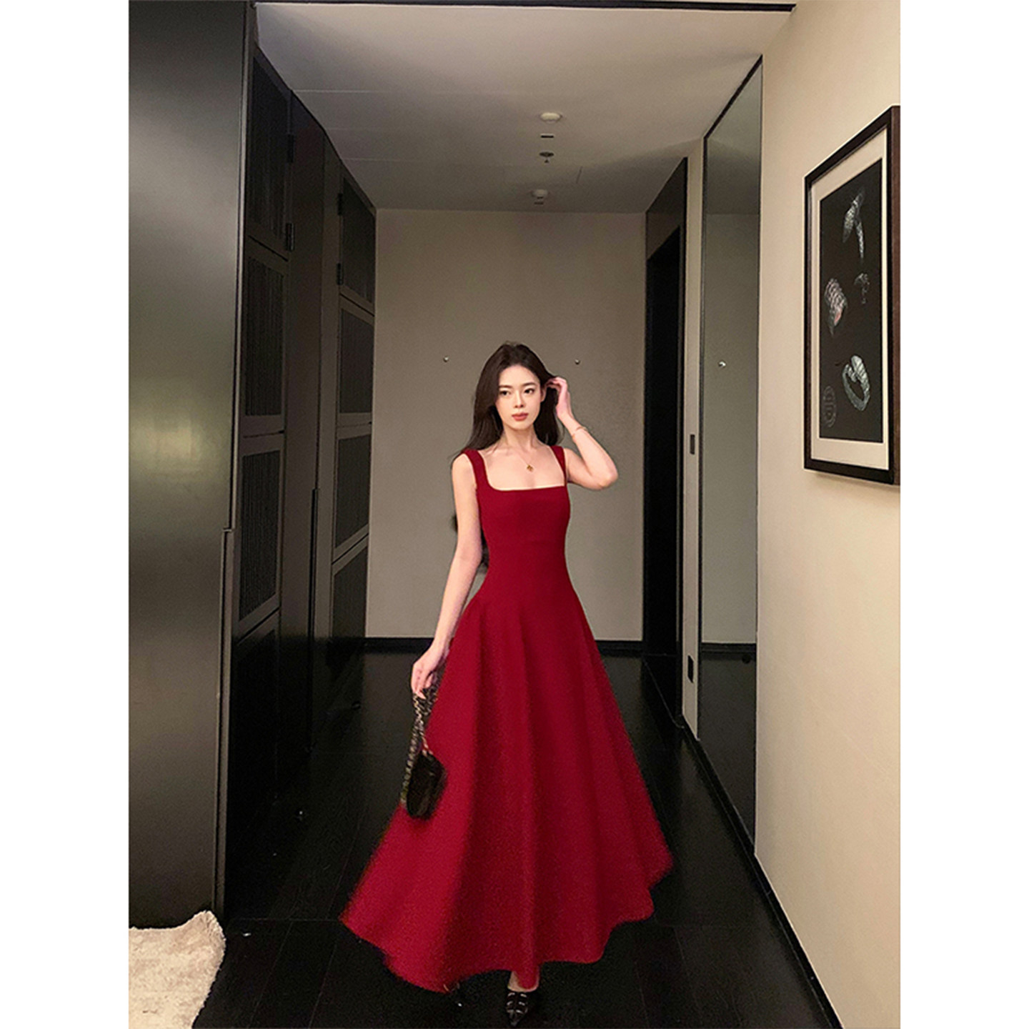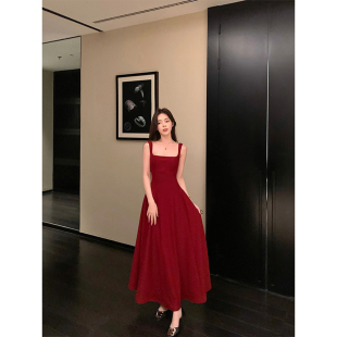 法式 红色吊带连衣裙法式 高级感收腰显瘦气质方领大摆长裙 女装 大码
