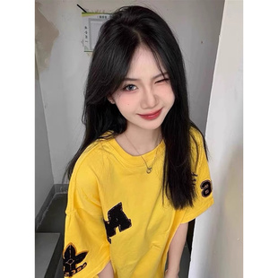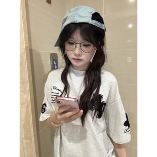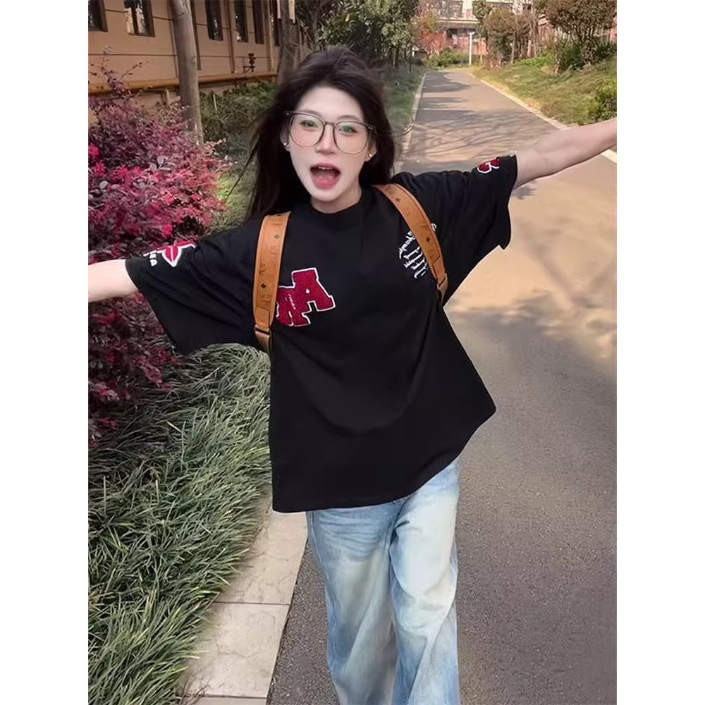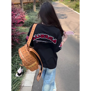 上衣 t恤男夏潮牌宽松oversize情侣半袖 美式 复古字母植绒刺绣短袖