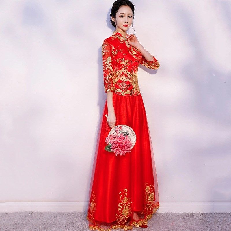 显瘦旗袍大码 中式 美新娘敬酒服修身 2020新春款 结婚秀禾礼服七分袖