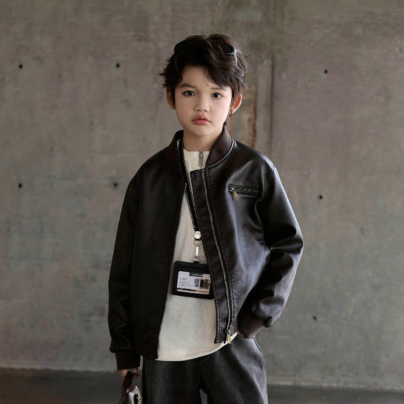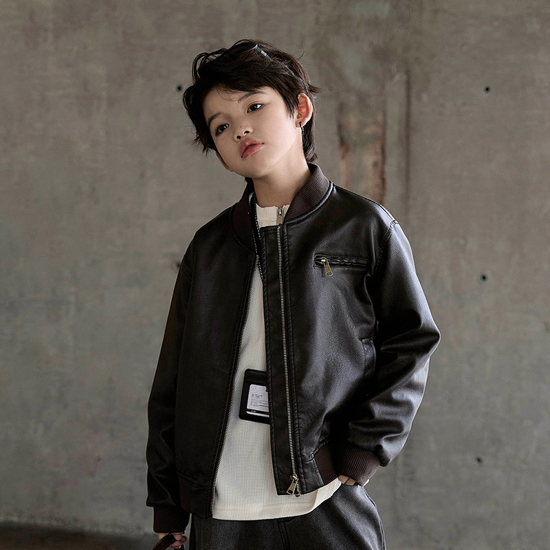 上衣帅气夹克 复古秋装 男童皮衣棒球服外套2025新款 男大童擦色美式