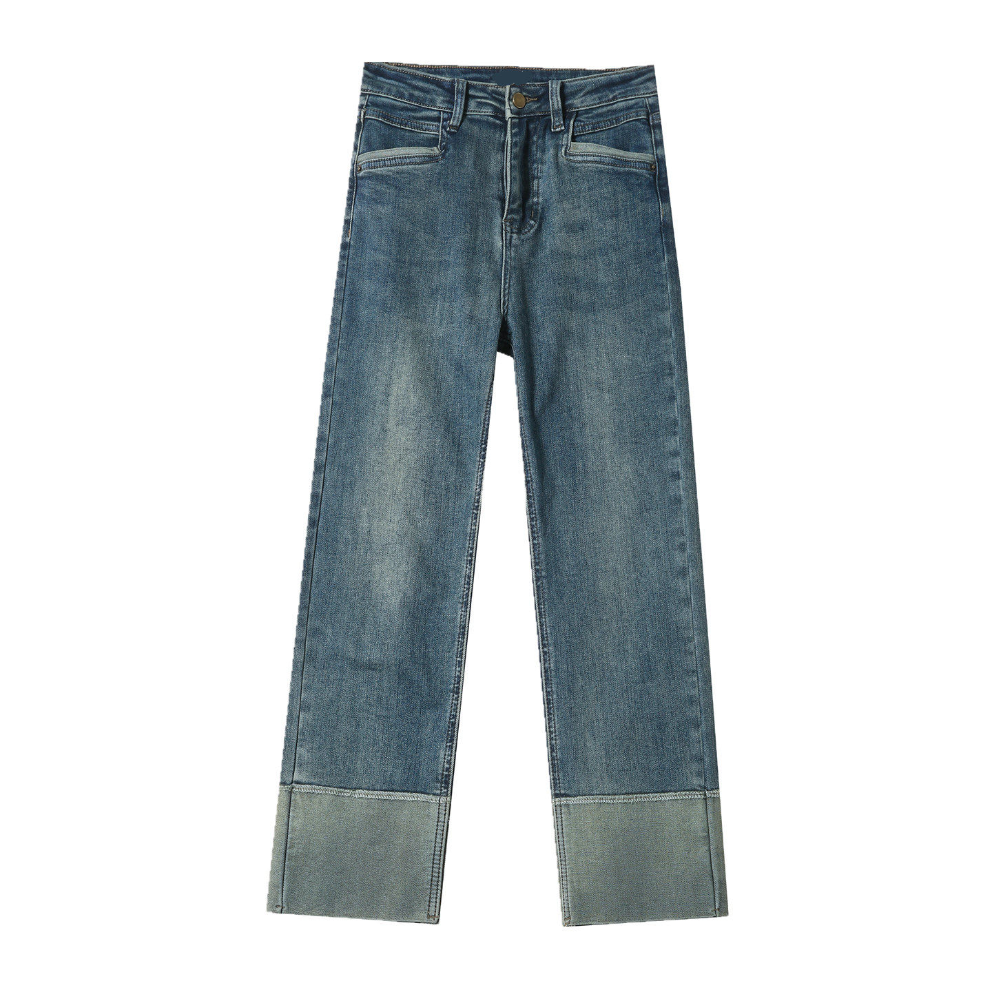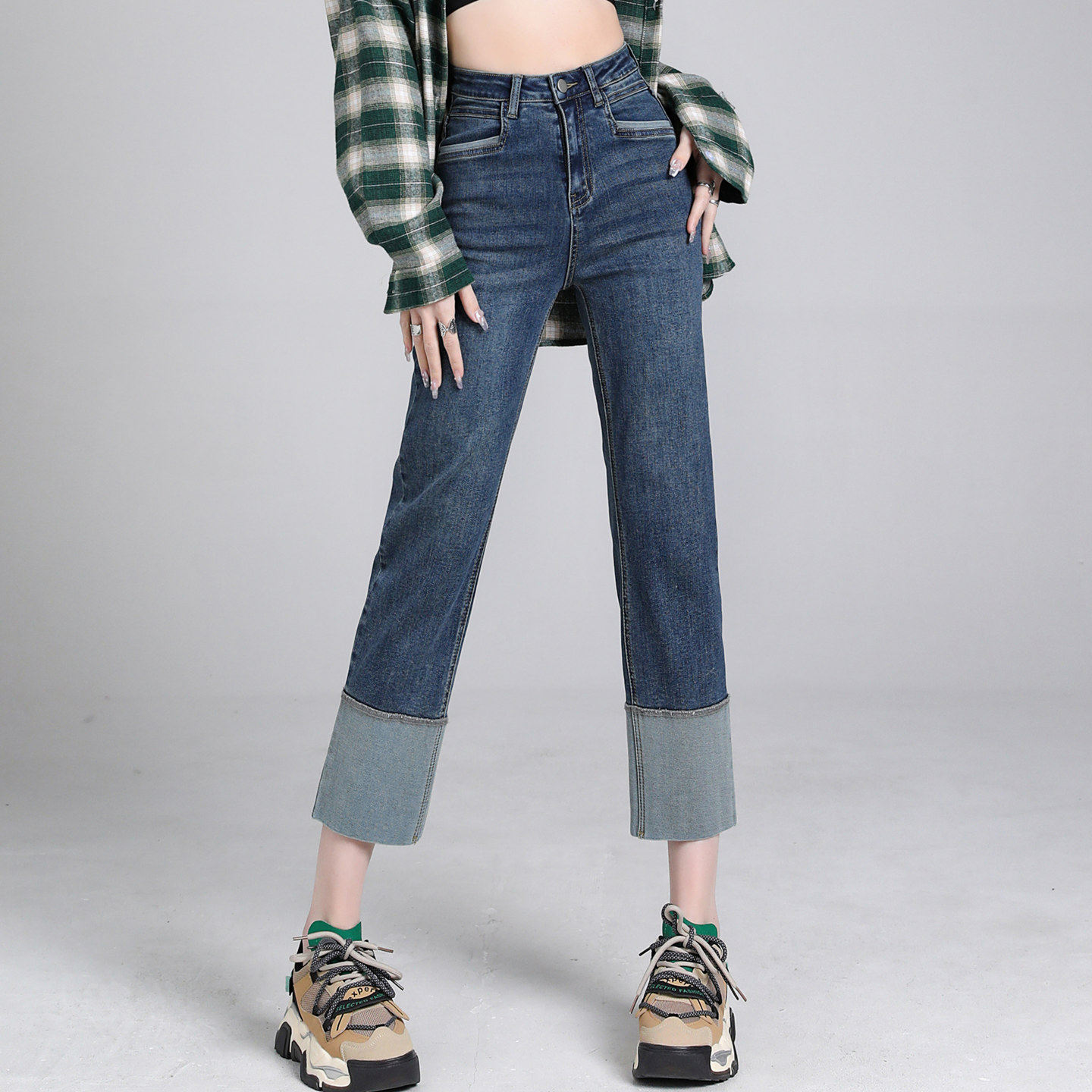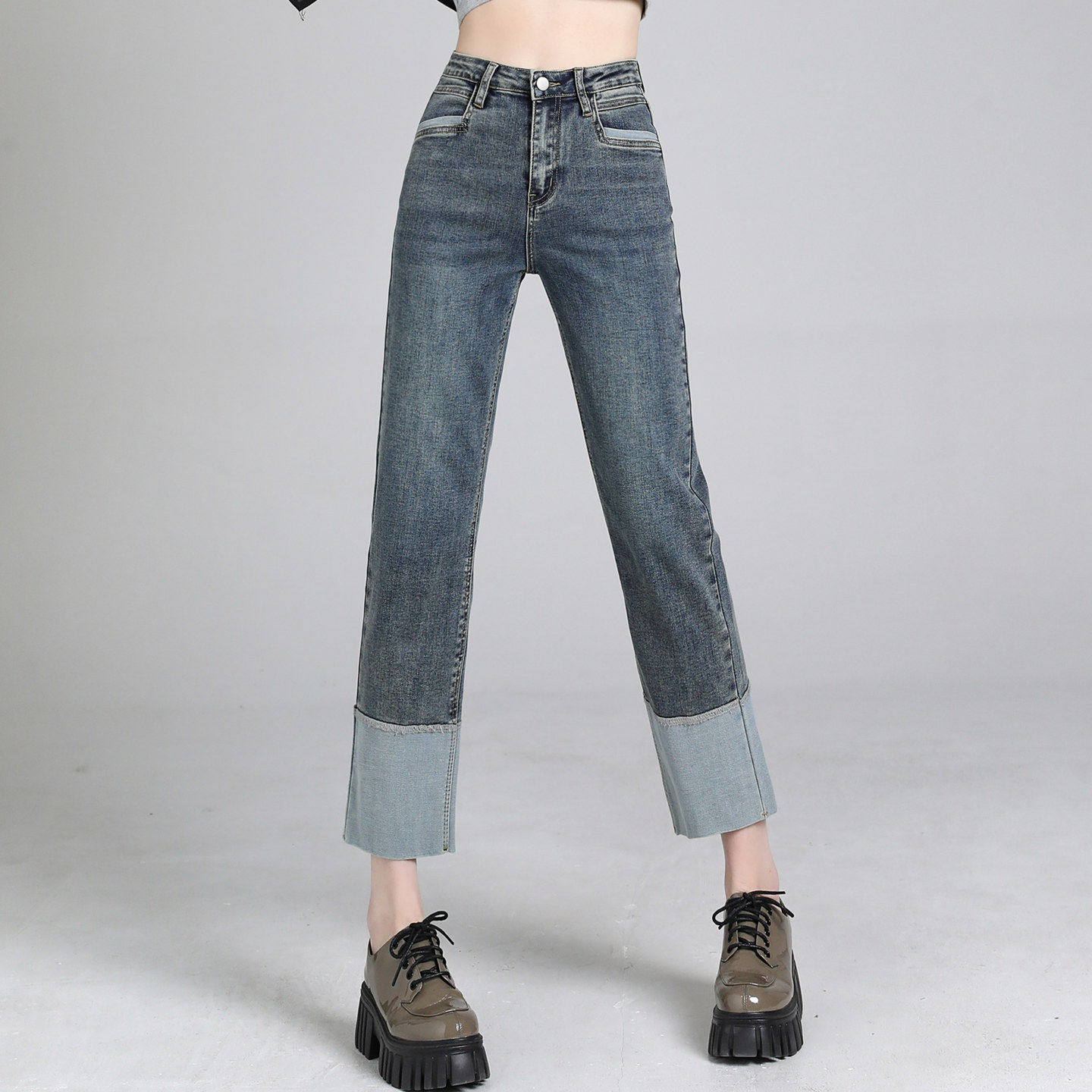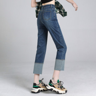复古烟管拼接撞色宽松设计感九分小脚裤 窄版 子 直筒牛仔裤 秋冬新款