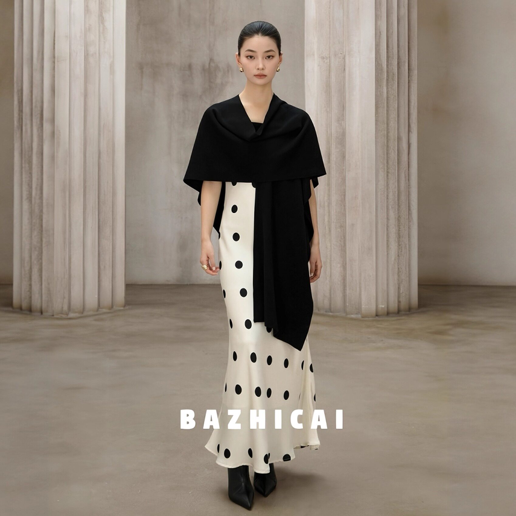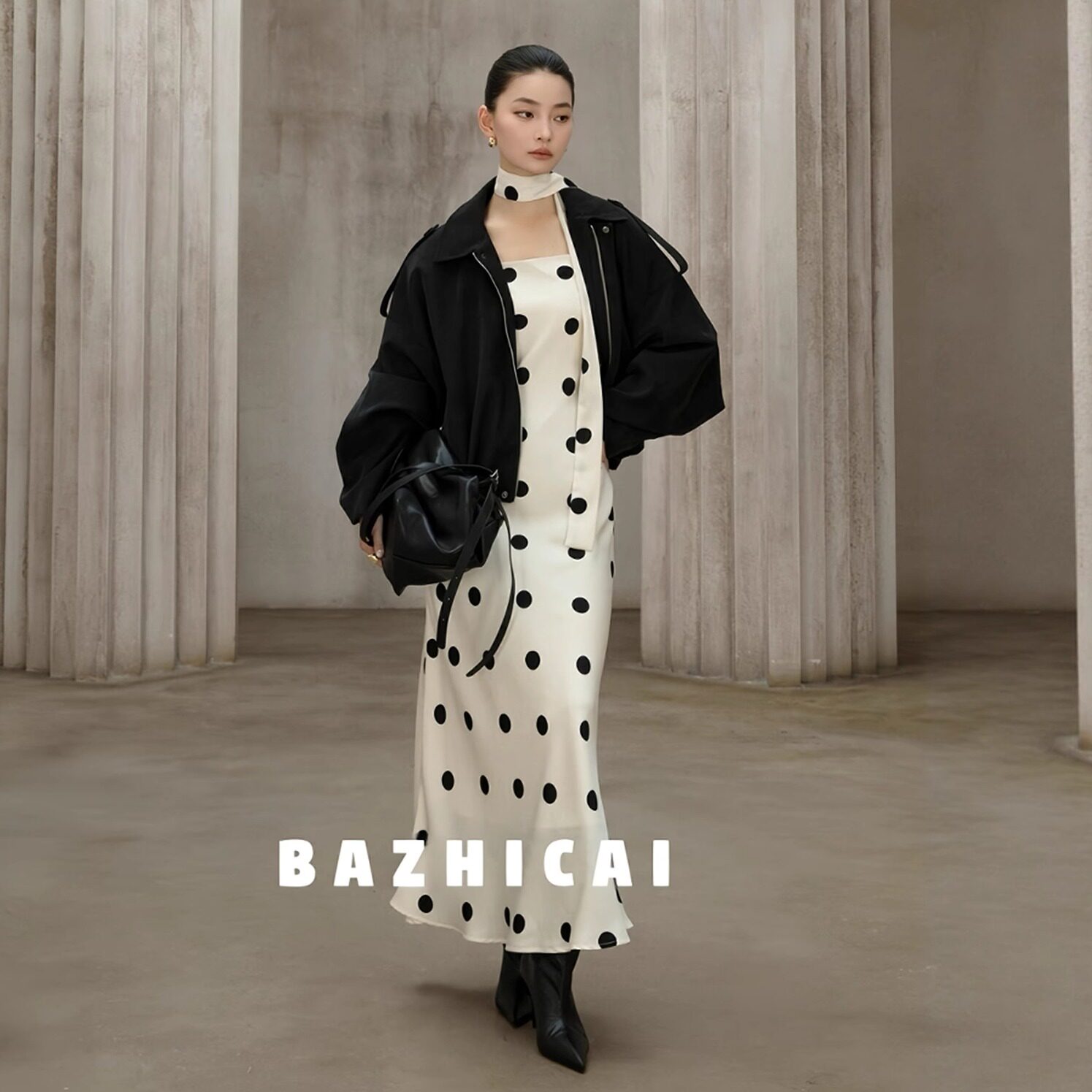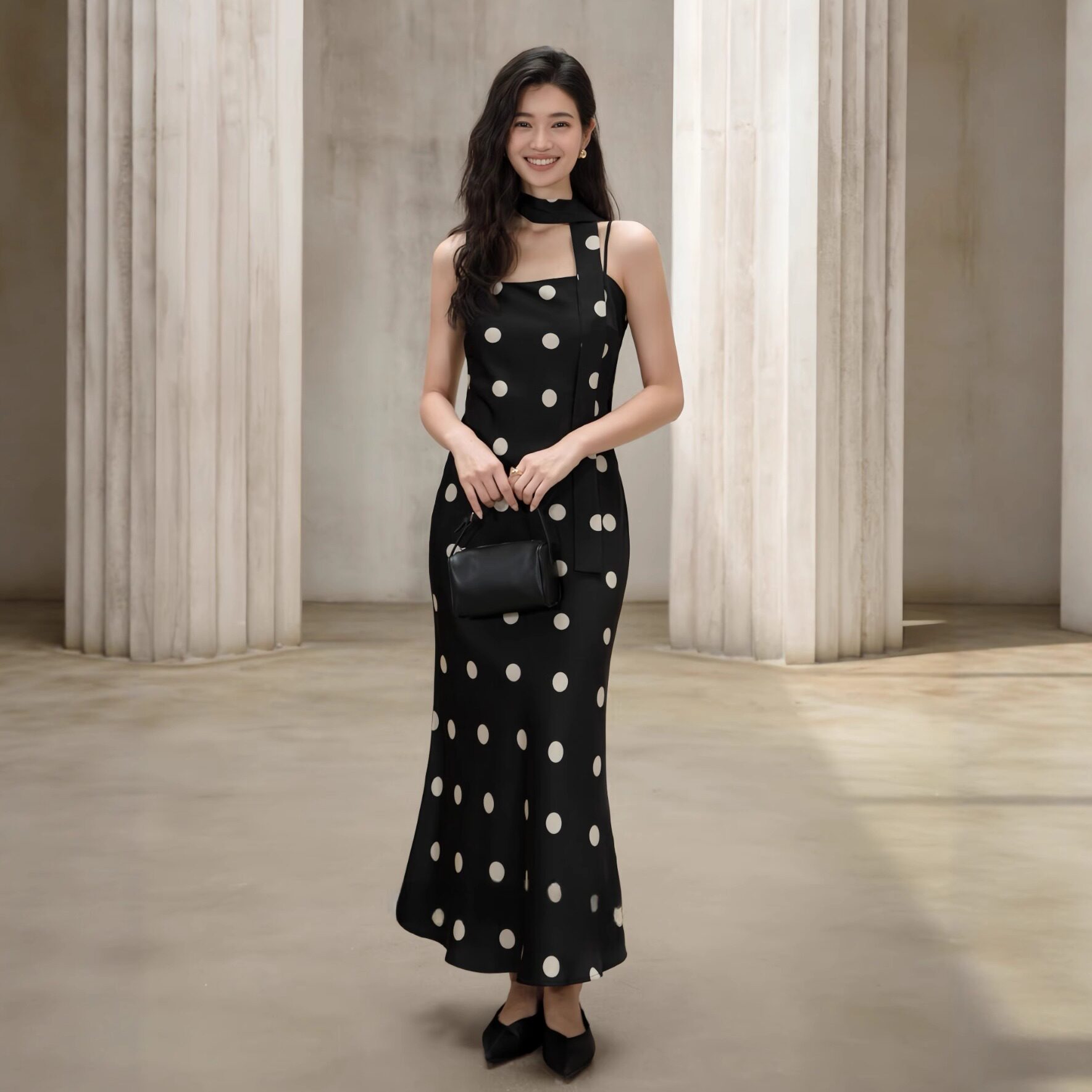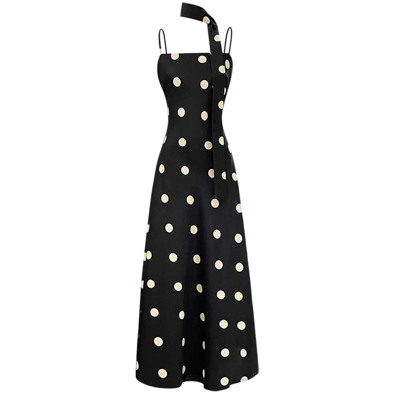 花枝舞曲 小众设计复古波点吊带裙显瘦吊带黑色连衣裙长裙4072