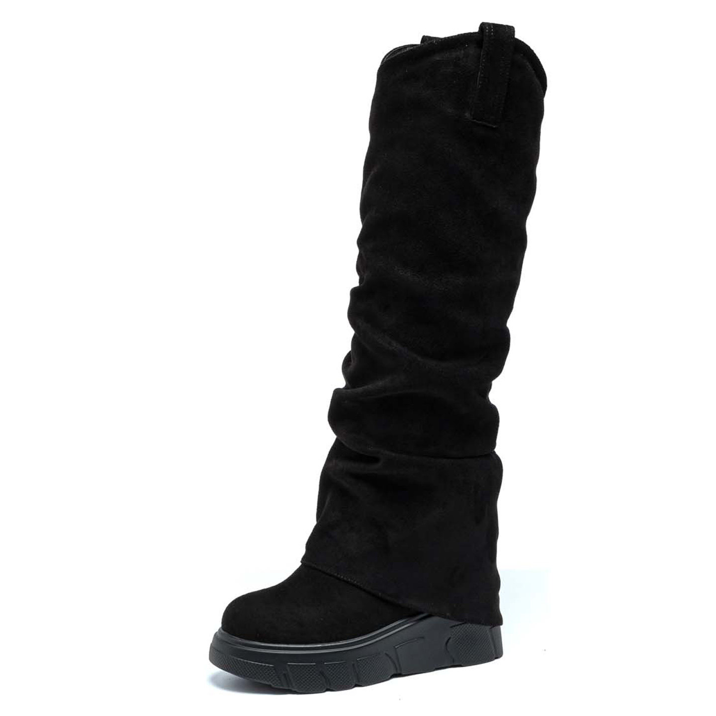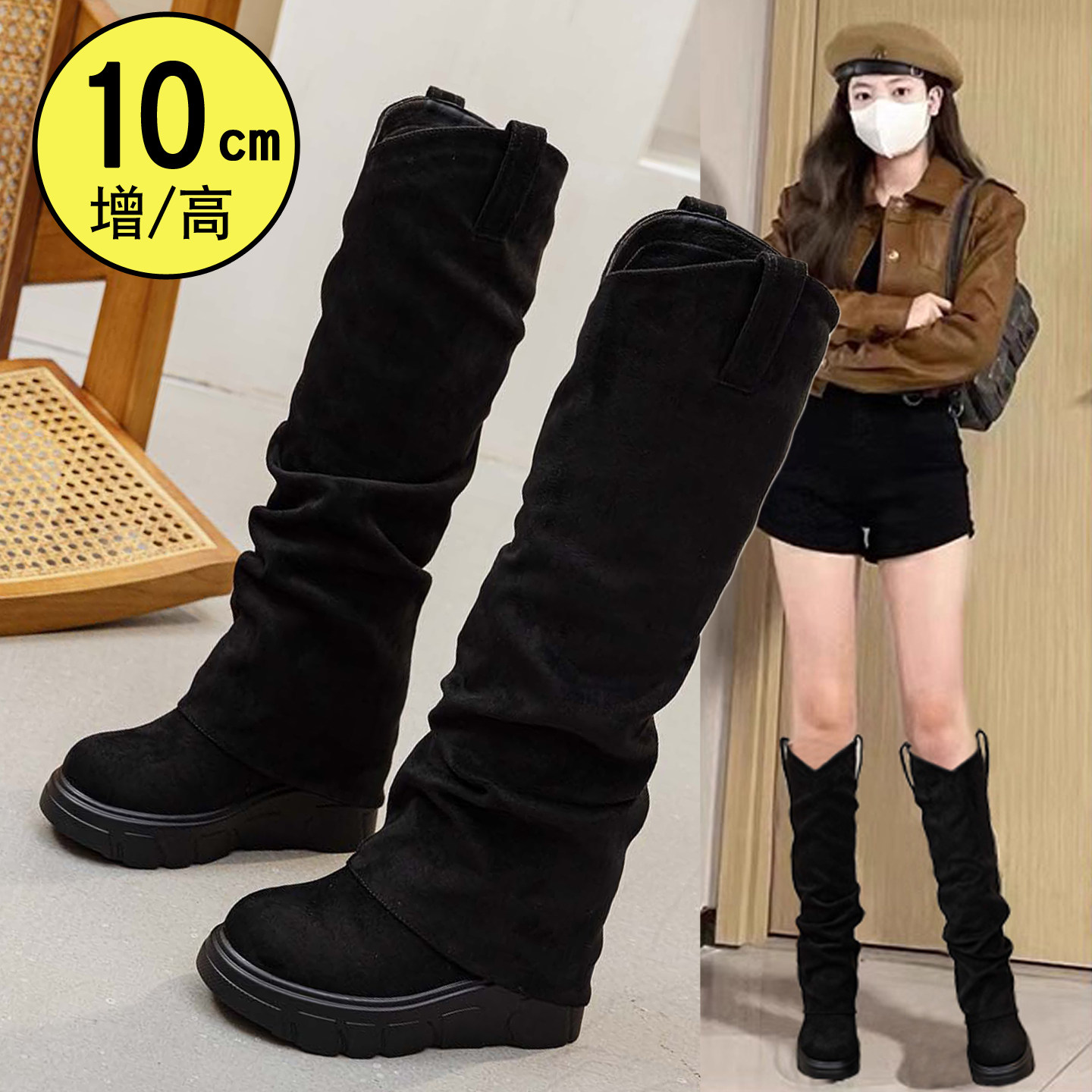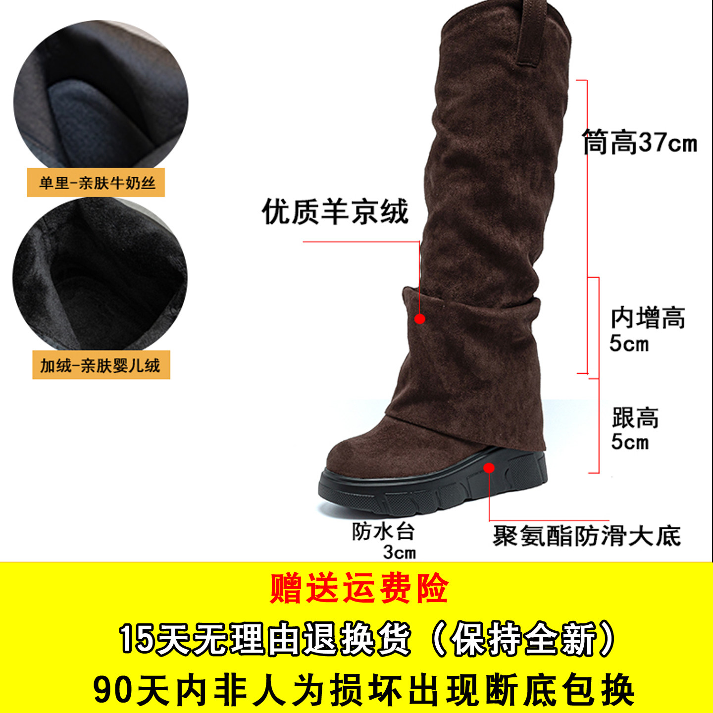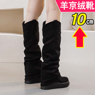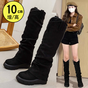 真皮 管短靴复古骑士马丁靴 内增高西部牛仔堆堆靴女2025秋褶皱裤