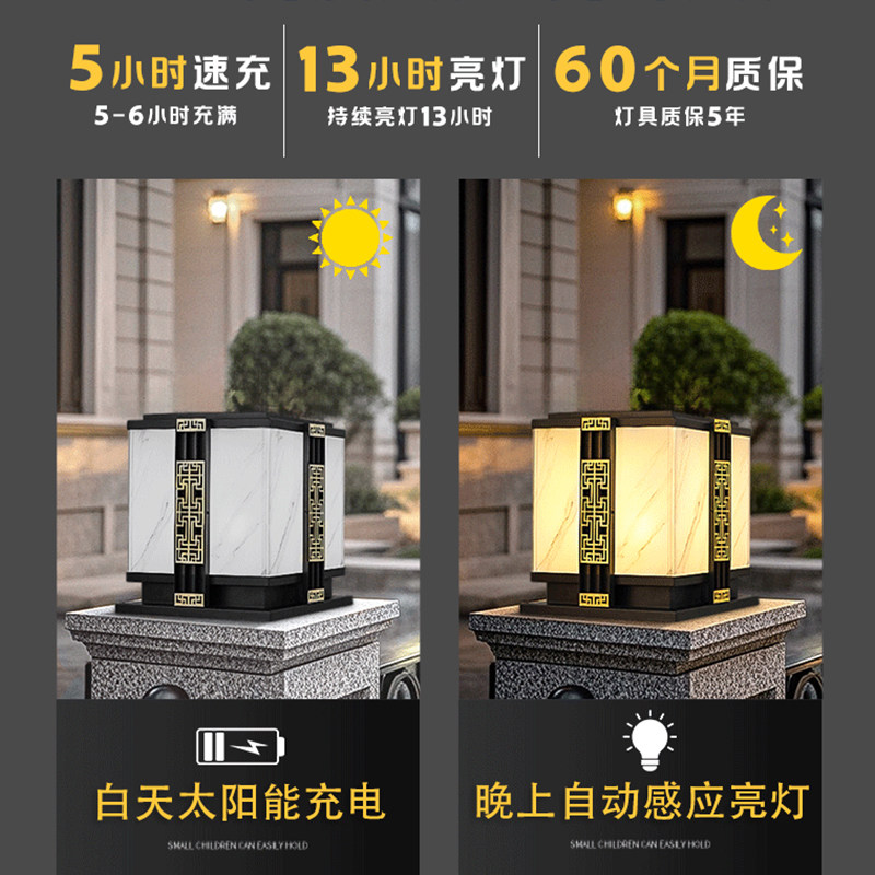 新款 太阳能柱头灯别墅围墙户外庭院大门两侧柱子室外门柱门垛灯