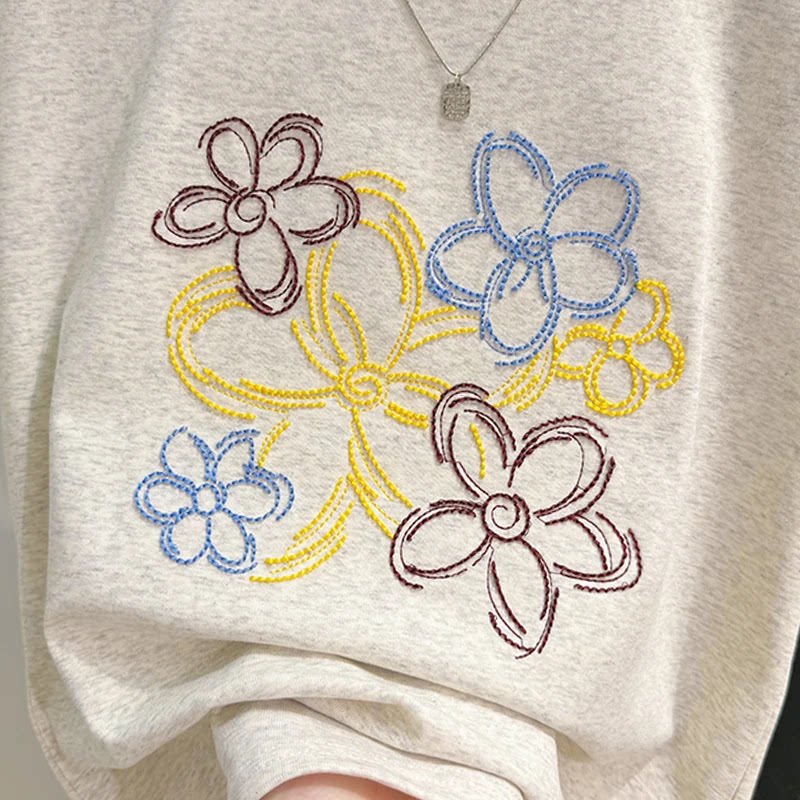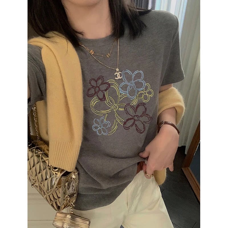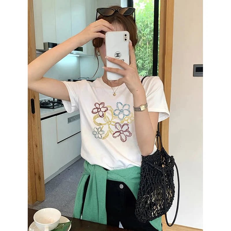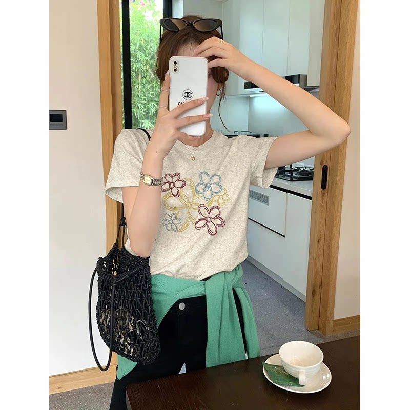 休闲宽松体恤时尚 韩版 洋气上衣潮 短袖 今年流行花朵刺绣T恤女夏季
