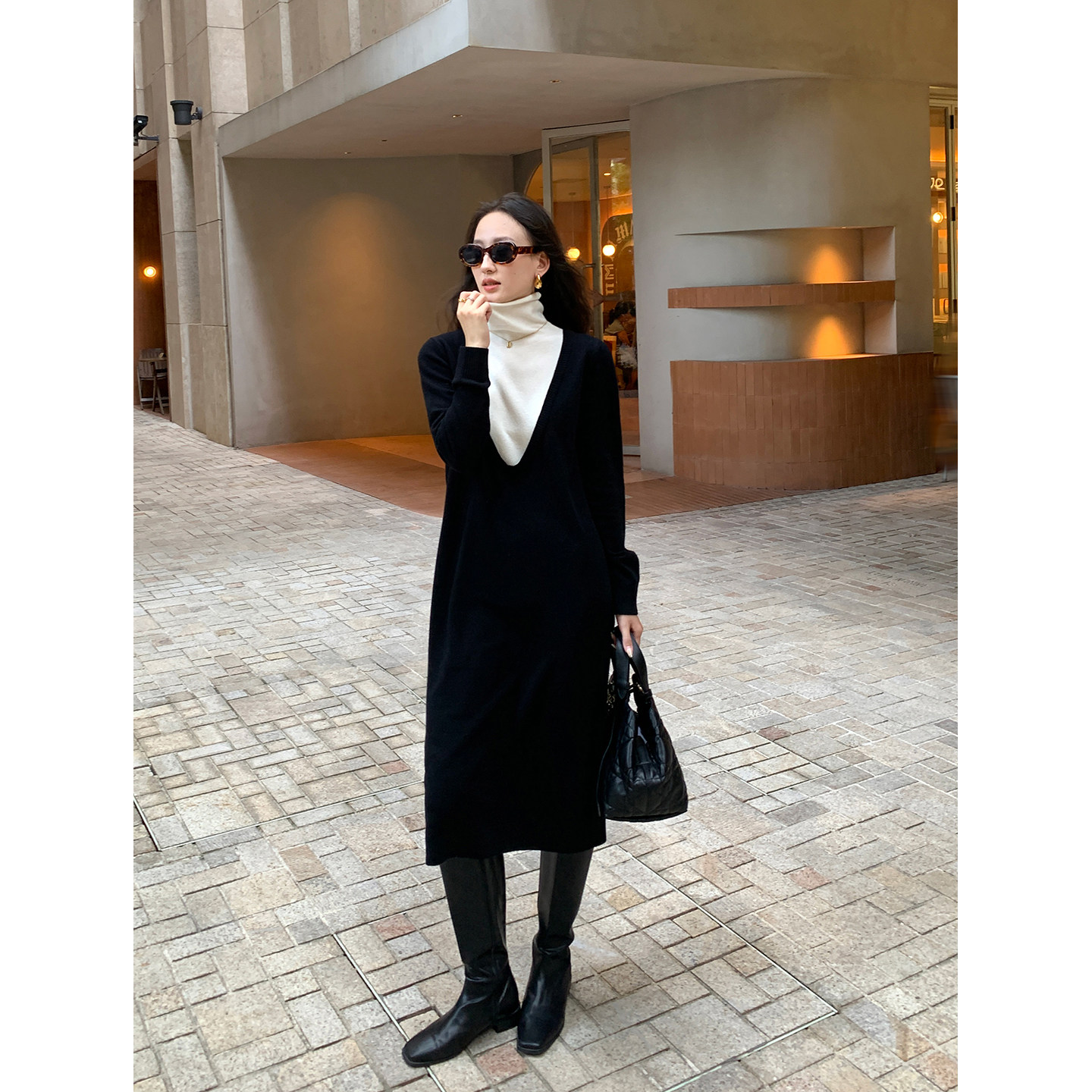 假两件长裙 优雅贵价1OO羊毛撞色高领针织连衣裙女长袖 Maven Lin