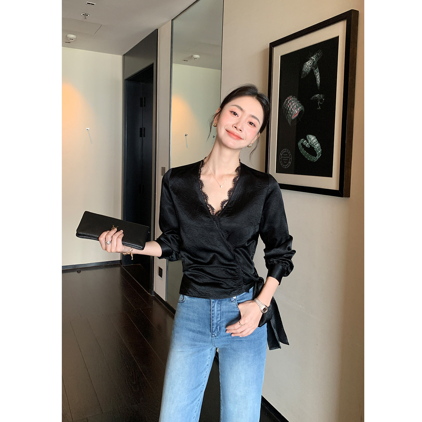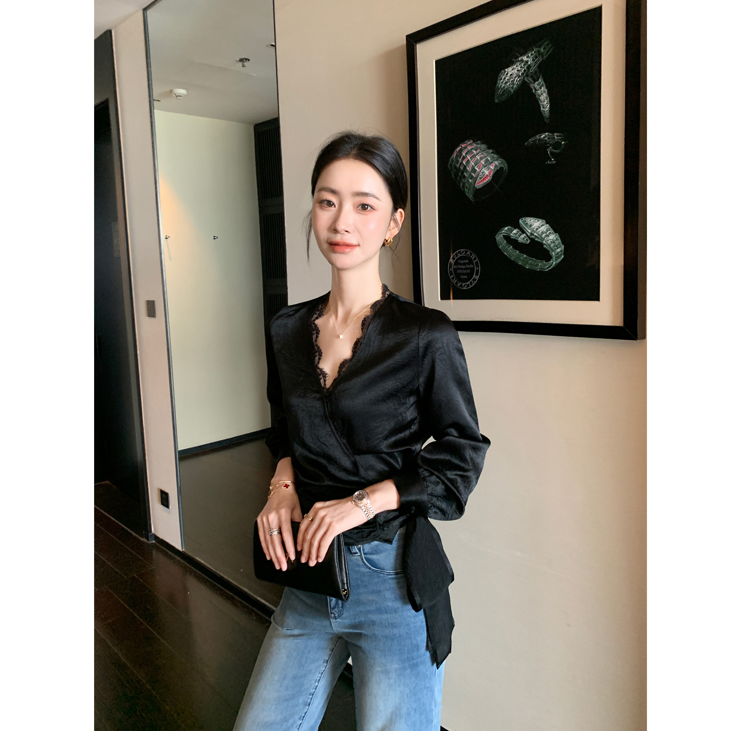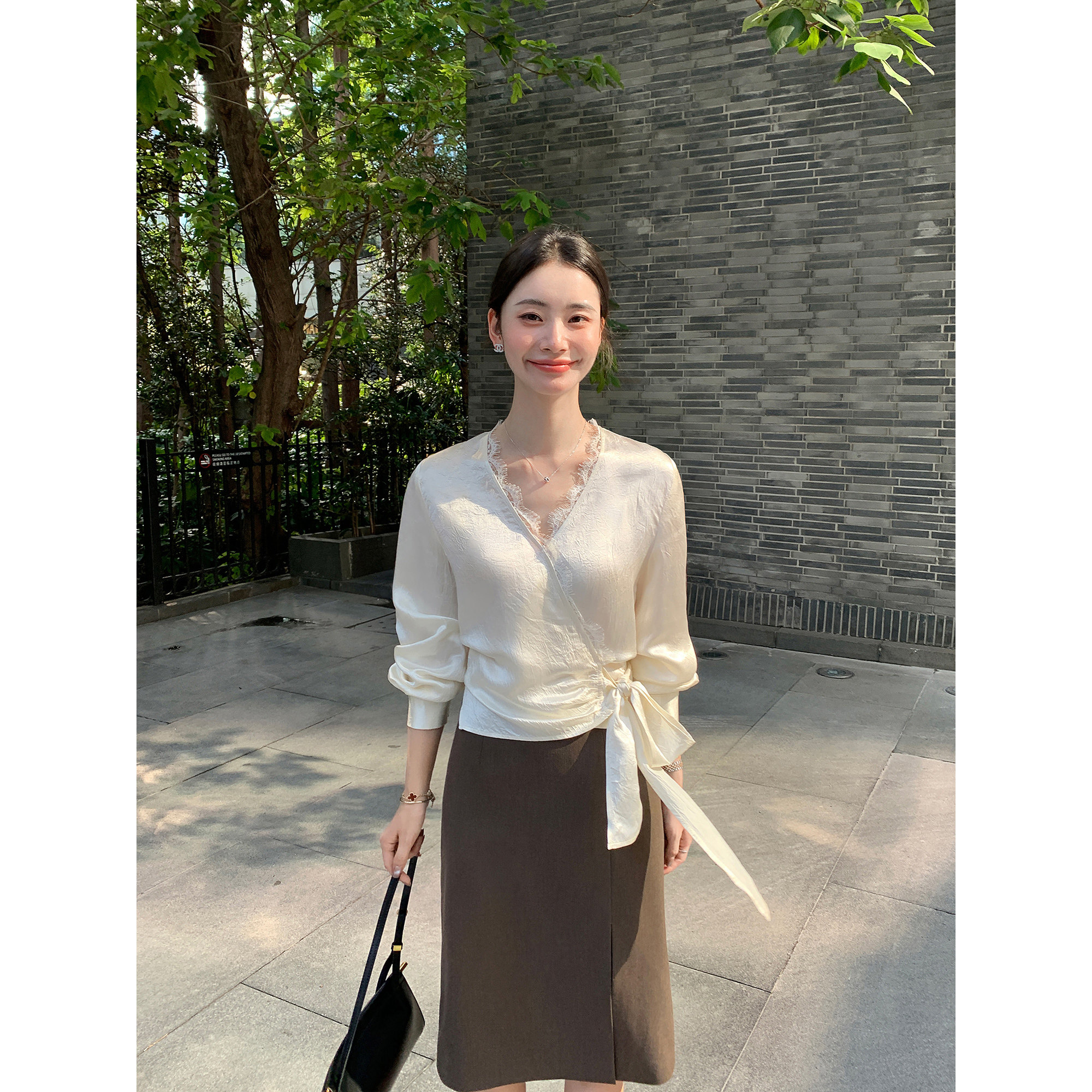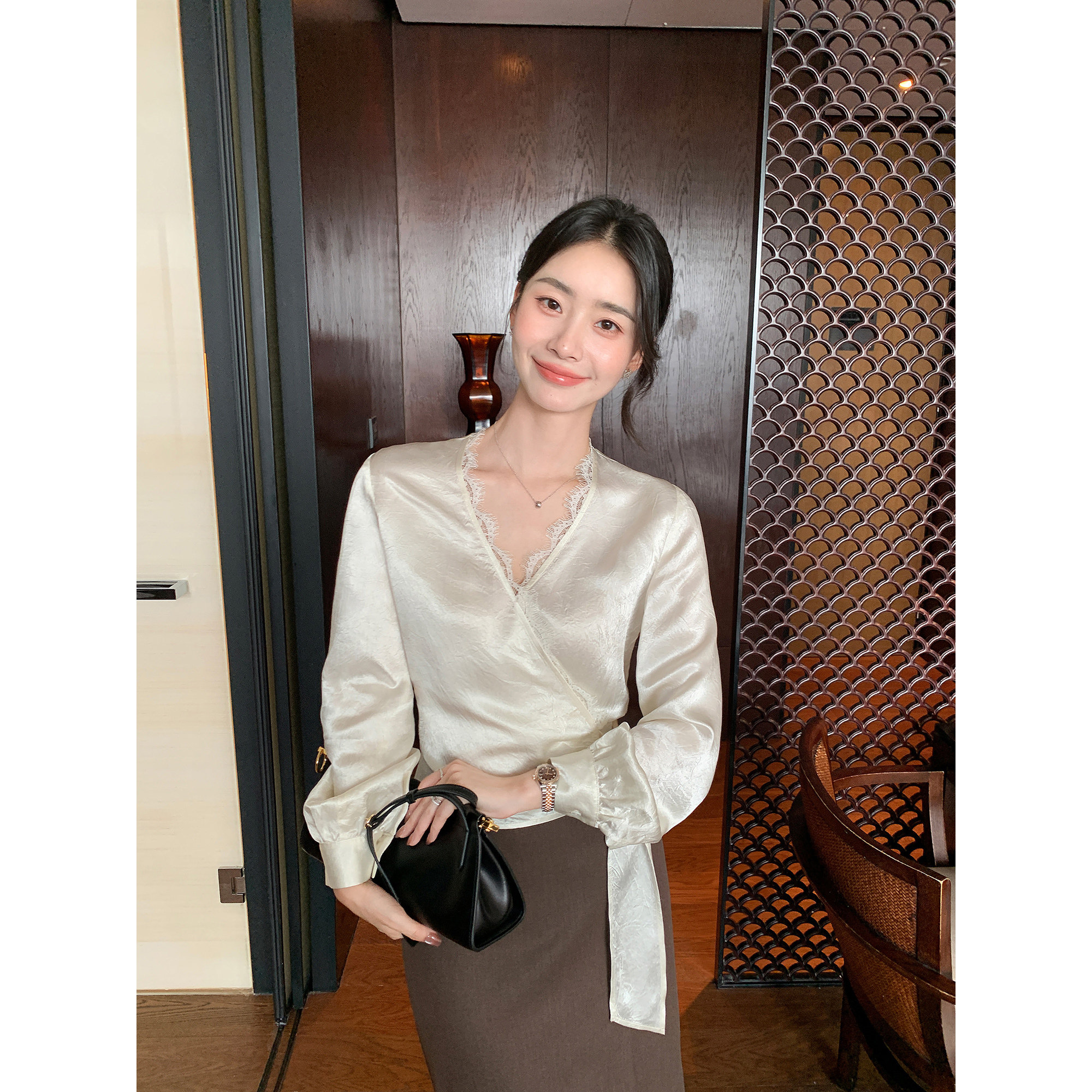 百搭气质上衣女 木耳领衬衫 仙草宝相提花缎真丝桑蚕丝白色法式 长袖
