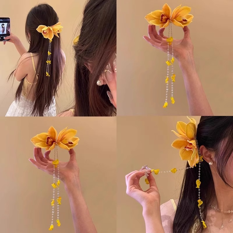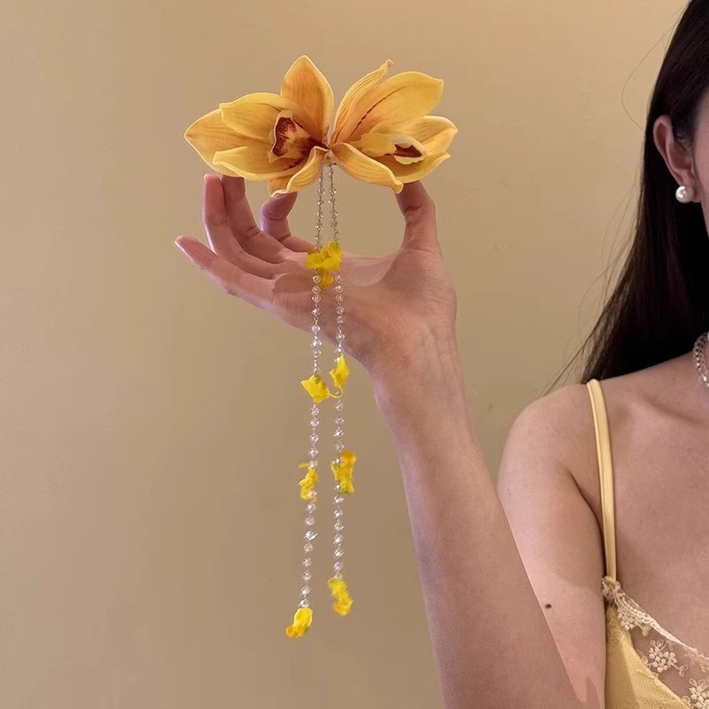 Spring春 唯美黄色玉兰花朵发夹女气质氛围感流苏发饰品旅行发卡