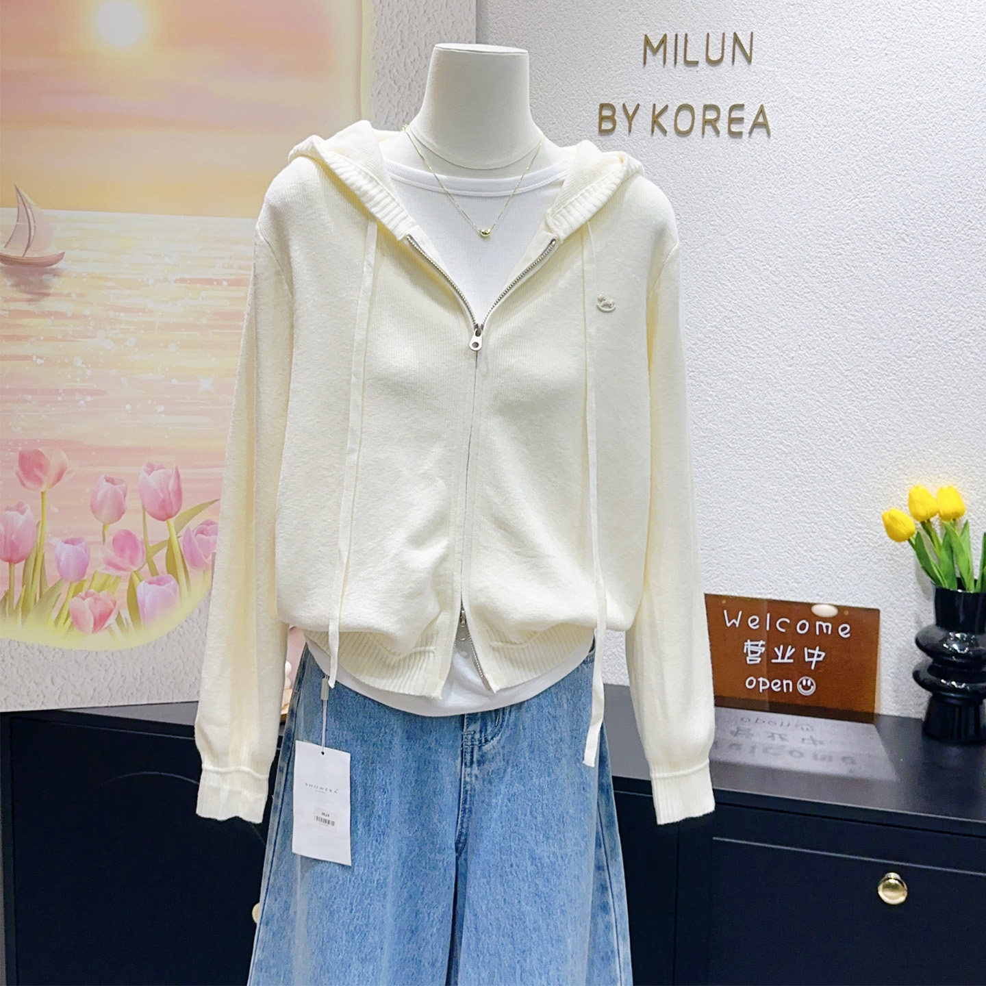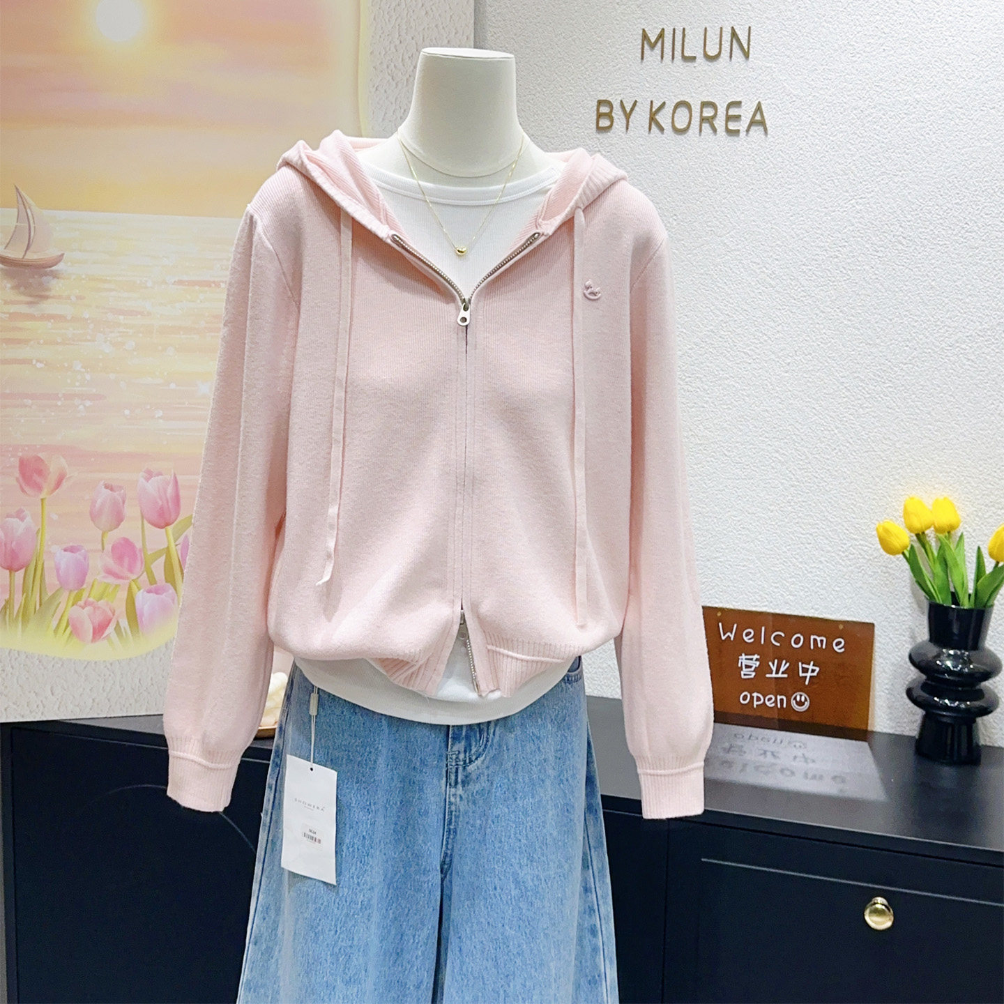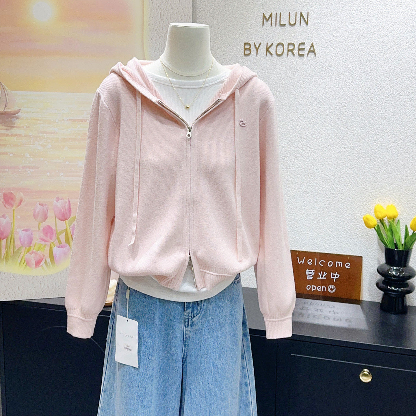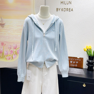 毛衣显瘦小个子 别致气质连帽双拉链针织衫 早春温柔粉蓝色 韩代款