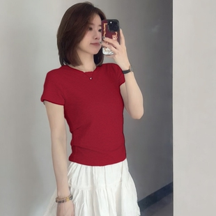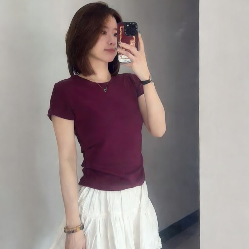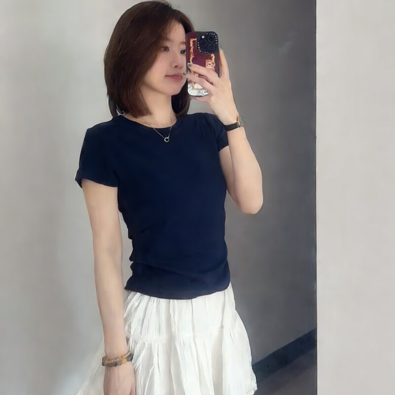 上衣极简风百搭美式 显瘦打底衫 复古潮 T恤女灰色修身 正肩圆领短袖