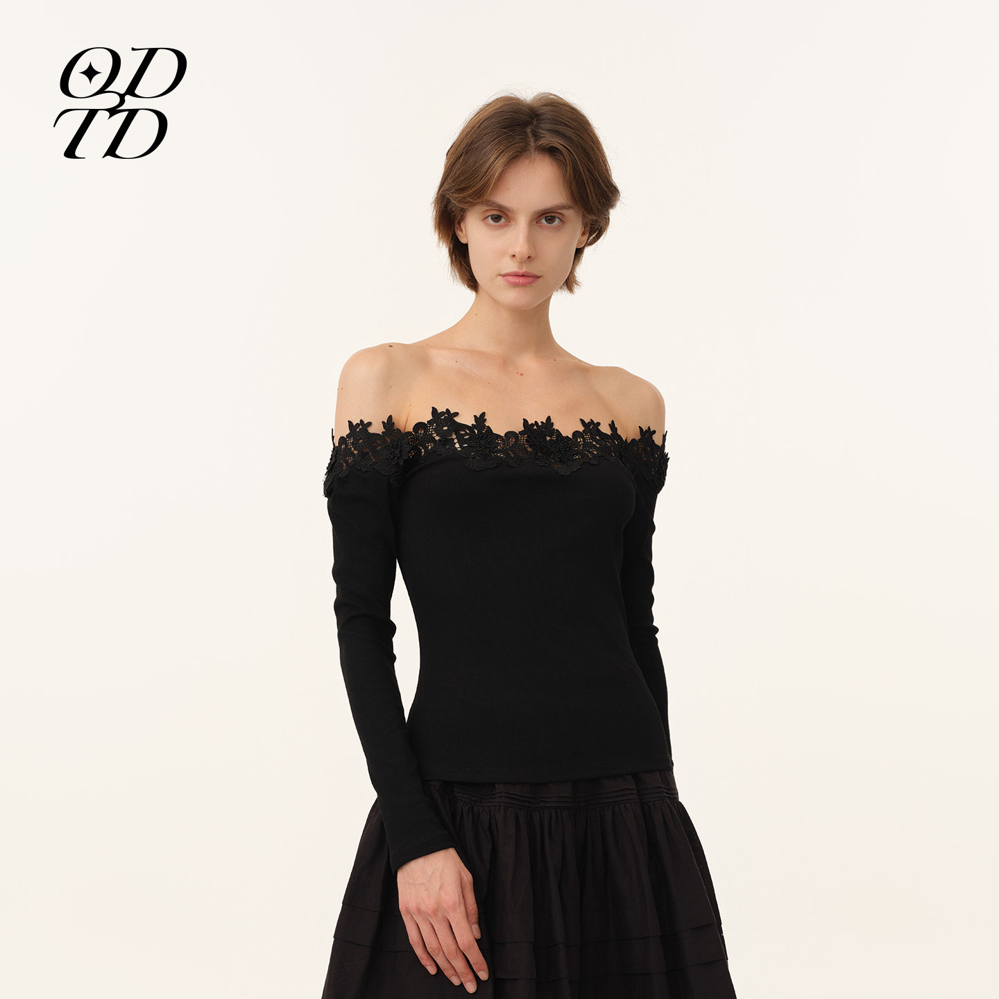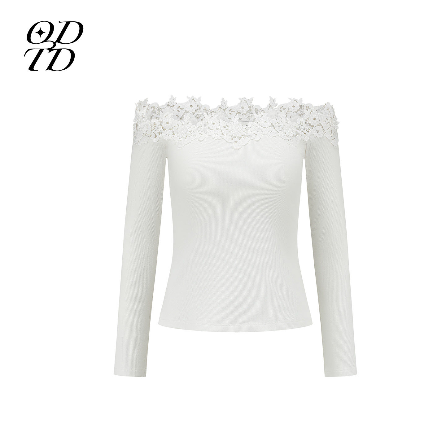 长袖 花边一字肩罗纹修身 ODTD26春夏新款 上衣百搭女 设计师女装
